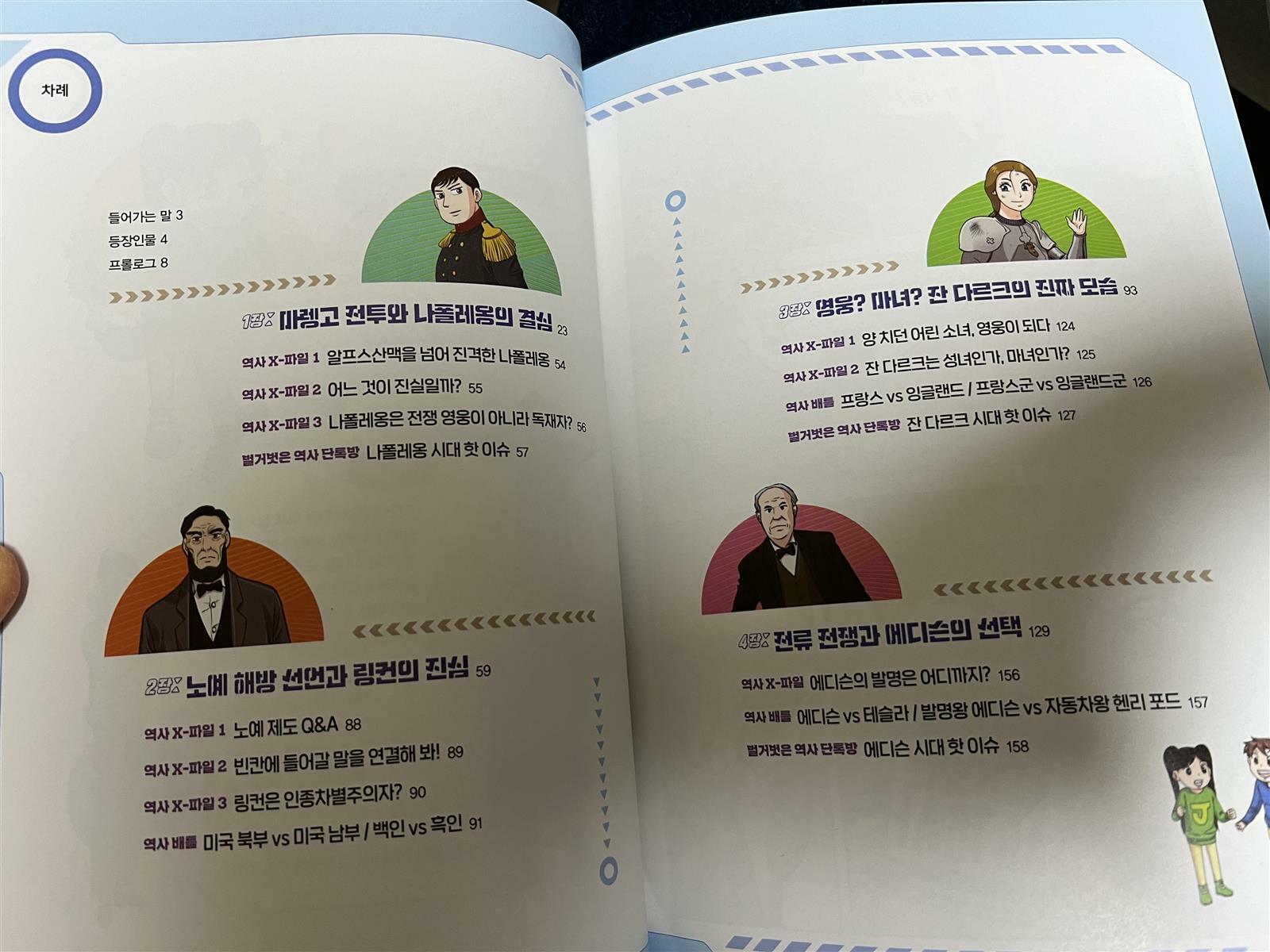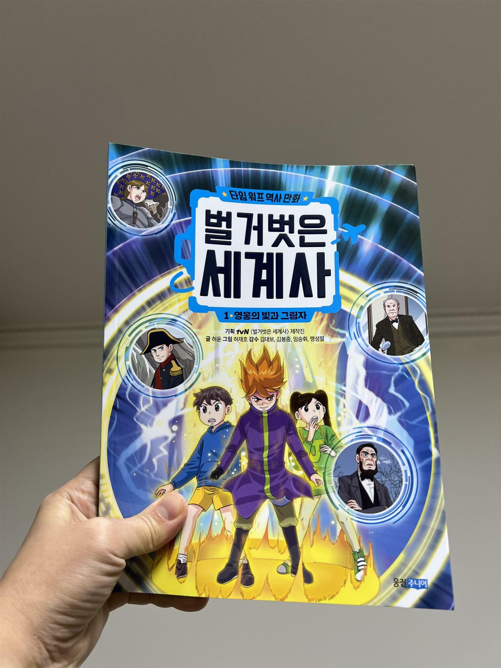 ‘벌거벗은 세계사’ 1.영웅의 빛과 그림자 역사 만화를 보았습니다. 벌거벗은 세계사 제작진들이 기획한 만화라서 재미있고 역사적 사실을 잘 나타내고 있습니다. 요즘 아이와 역사에 대해 조금씩 공부하고 있는데 세계사는 확실히 어렵더라구요. 배경지식이 많이 필요한 분야라서 아이와 필요한 자료도 보고 책도 봐야 하는 것 같습니다. 아이에게 세계사를 노출 할 때 이 만화책도 함께 보면 아무래도 도움이 많이 될 것 같습니다. 이번 책에서는 총 4명의 영웅이 나옵니다. 책의 시작은 평행우주론으로 시작해서 주인공이 역사 속으로 들어가게 되지요. 주인공의 도움을 필요로 하는 다른 지구에 사는 주인공은 역사를 바꾸려는 악당을 잡아야 합니다. 주인공 서준이의 도움이 필요한 테오 카보는 서준이와 함께 역사 속으로 들어가지요. 역사의 중요한 장면 속으로 가기 때문에 영웅들의 중요한 업적과 역사적 사실들에 대해 배울 수 있습니다. 역사 지식이 많은 서준이의 도움으로 역사가 바뀌는 것을 막을 수 있게 됩니다. 서준이와 함께 역사 속으로 들어가서 직접 겪는 듯한 느낌을 주는 책입니다. 현재 내가 사는 시대의 주인공인 서준이를 통해 공감을 하면서 책을 볼 수 있는 것 같아요. 중간에 역사적 사실을 자세히 알려주는 글도 있어서 꼼꼼하게 읽어보면 더 많은 것을 배울 수 있습니다. 초등 아이들과 함께 세계사를 재미있게 배워 보시길 추천합니다. 출판사로부터 도서를 제공받아 직접 읽고 작상한 리뷰입니다. #컬처블룸 #컬처블룸리뷰단 #벌거벗은세계사 #영웅의빛과그림자 #웅진주니어