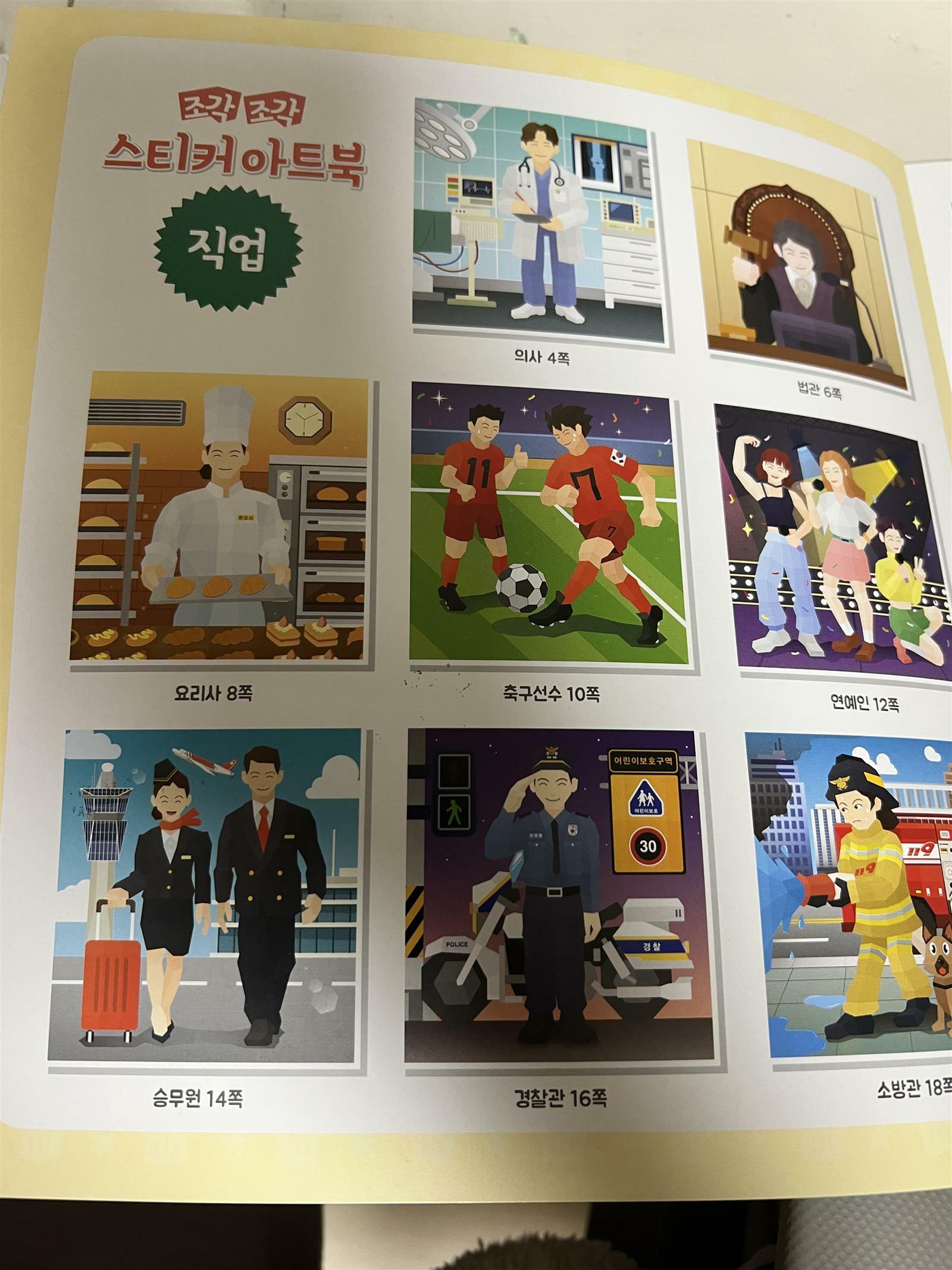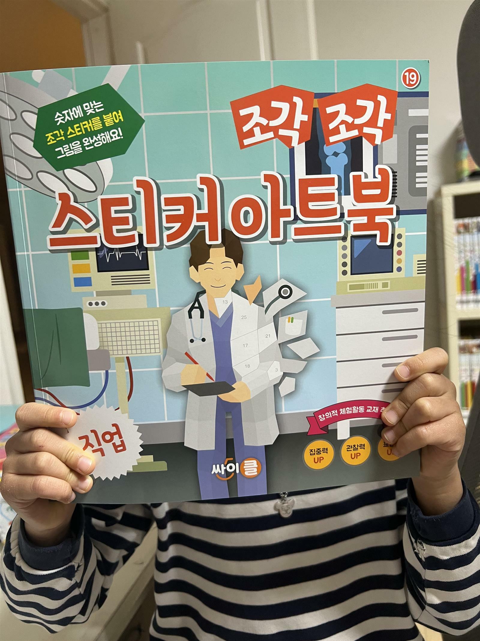 유아 스티커 북으로 참 재미있는 책을 소개하려고 합니다. '조각 조각 스티커아트북' 입니다. 이 책은 주제별로 스티커북이 나누어져 있습니다. 저는 19번 주제인 직업에 관련된 스티커북을 아이와 함께 해보았습니다. 아이가 원하는 직업을 선택해서 먼저 해보았는데 연예인을 골라보더라구요. 스티커 한장을 뜯어서 들고 열심히 번호를 찾아 봅니다. 스티커가 한장씩 뜯어져서 편하고 좋습니다. 그림에 스티커 붙이기가 마치 퍼즐조각 맞추는 것 같아서 퍼즐 맞추기 좋아하는 아이들도 해보면 좋을 것 같더라구요. 저희 아이는 퍼즐 별로 선호하지 않는데 이 스티커북은 재미있다고 합니다. 한 장정도 붙이는데 집중력과 숫자찾기 등 다양한 생각을 하며 나름 관찰력도 향상시킬 수 있겠더라구요. 평소 산만한 저희 아이도 한 번 시작하니 끝까지 앉아서 붙일 수 있었습니다. 많은 시간이 필요하지 않기 때문에 도전해 볼 만 하였습니다. 유아들이 하기에 적당한 스티커북 인것 같네요. 너무 어린 3~4세 아이들은 엄마의 도움이 필요할 것 같습니다. 일단 숫자 읽기가 기본적으로 들어가기 때문에 혼자서는 힘들 것 같아요. 하지만 숫자를 그림처럼 익혀가면서 같은 모양 찾아 붙이다 보면 저절로 숫자도 익히게 될 것 같네요. 첫째가 연예인을 완성하고 나니 나름 뿌듯해 하였습니다. 저의 도움없이 오롯이 혼자 해냈기 때문에 더 성취감이 있는 것 같아요. 그리고 결과물의 완성도가 높아서 아이들이 자신감을 얻고 재미있어 하는 것 같습니다. 학교 다니는 저학년 아이들도 심심 할때나 머리를 식혀야 할 때 하나씩 하면 재미있어 할 것 같아요. 어렵지 않게 뚝딱 해내다보면 잃었던 자신감도 찾을 수 있을 것 같아요. 작은 성공의 경험이 쌓여서 아이들이 자신감을 얻는 것이기에 이런 활동이 참 좋을 것 같네요. 유아부터 저학년 아이들까지 추천하는 스티커북입니다. 출판사로부터 도서를 제공받아 직접 읽고 작성한 리뷰입니다. #조각조각스티커아트북 #직업 #유아스티커북 #유아책추천 #싸이클 #책세상 #맘수다 #책세상맘수다카페