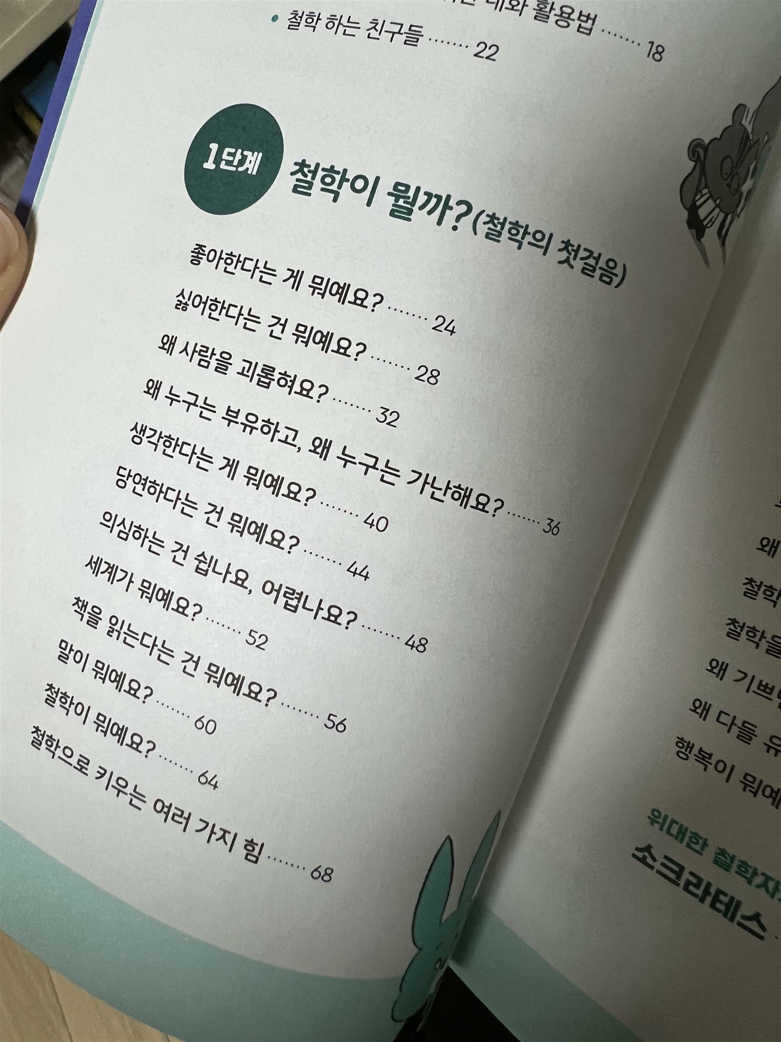 '어린이를 위한 철학의 쓸모' 라는 책을 읽어 보았습니다. 질문으로 시작하면서 아이들이 이해하기 쉬운 내용을 담고 있습니다. 86가지의 생각을 이 책을 통해 살펴보면서 철학이 무엇인지 알 수 있습니다. 어린이를 위한 책이지만 어른이 보아도 생각할 거리가 있는 책입니다. 무엇보다 이해하기 쉽게 되어있어서 어른에게도 도움이 많이 되는 것 같아요. 하루에 하나씩 아이와 잠자리에서 읽어보고 이야기 나누기에 참 좋은 것 같다고 생각합니다. 철학적으로 사고하고 이야기 한다는 것이 정말 중요한데 집에서 아이에게 어떻게 알려줘야 할지는 잘 모릅니다. 하지만 이 책은 그런 걱정을 날려버리게 해줍니다. 책이 생각보다 두꺼워서 놀랐는데 막상 열어보니 글씨 크기도 작지 않고 그림과 함께 어울어져서 읽기에 편하더라구요. 아이들도 스스로 읽을 수 있을 것 같습니다. 초등 중학년부터는 스스로 읽어 보기에 무리가 없을 것 같네요. 초등 저학년의 경우는 읽을 수 있지만 엄마와 함께 읽어보며 이야기 나누는 것이 더 이해하기에 좋을 것 같아요. 아무래도 어려운 단어는 엄마가 설명을 해주면서 봐야 할 것 같기 때문입니다. 책은 1단계부터 6단계로 나누어져 있습니다. 단계별로 주제가 달라서 처음부터 차근 차근 보면 좋을 것 같아요. 만약 원하는 주제가 있다면 그것부터 보아도 되지만 1단계는 철학에 관해 먼저 이야기하고 있어서 1단계는 꼭 먼저 보는게 좋을 것 같더라구요. 요즘 하부르타 방식의 교육과 문해력 향상에 관련된 이야기가 참 많은데 철학에 대해 알고 이야기 한다는 것도 아무래도 일맥상통하는 것 같습니다. 아이와 어릴때 부터 철학에 대해 자유롭게 대화해 간다면 아이의 삶이 좀 더 풍요롭지 않을까? 생각이 듭니다. 출판사로부터 도서를 제공받아 직접 읽고 작성한 리뷰입니다 #철학의쓸모 #어린이를위한철학의쓸모 #길벗스쿨 #도치맘카페 #네이버도치맘카페