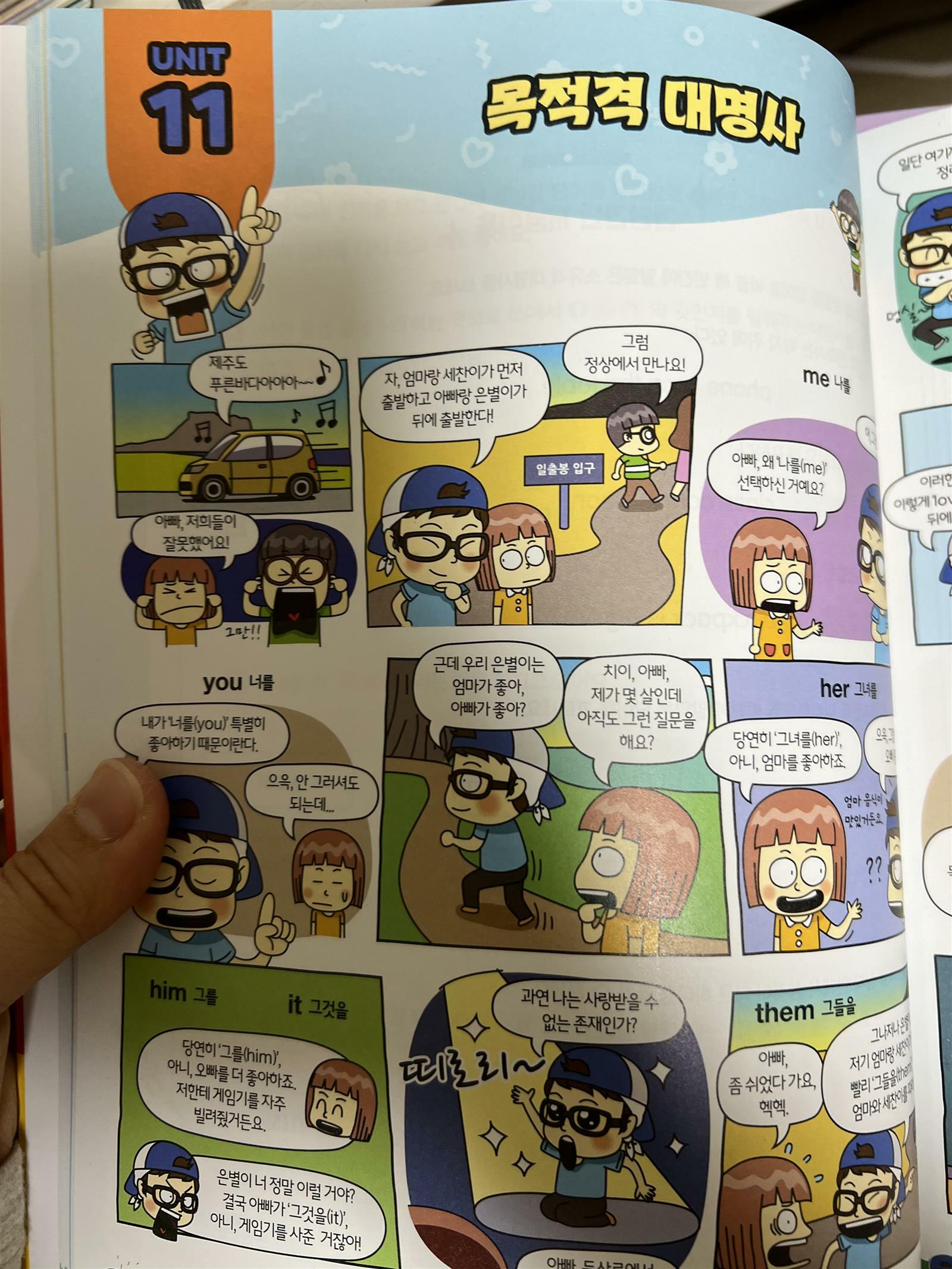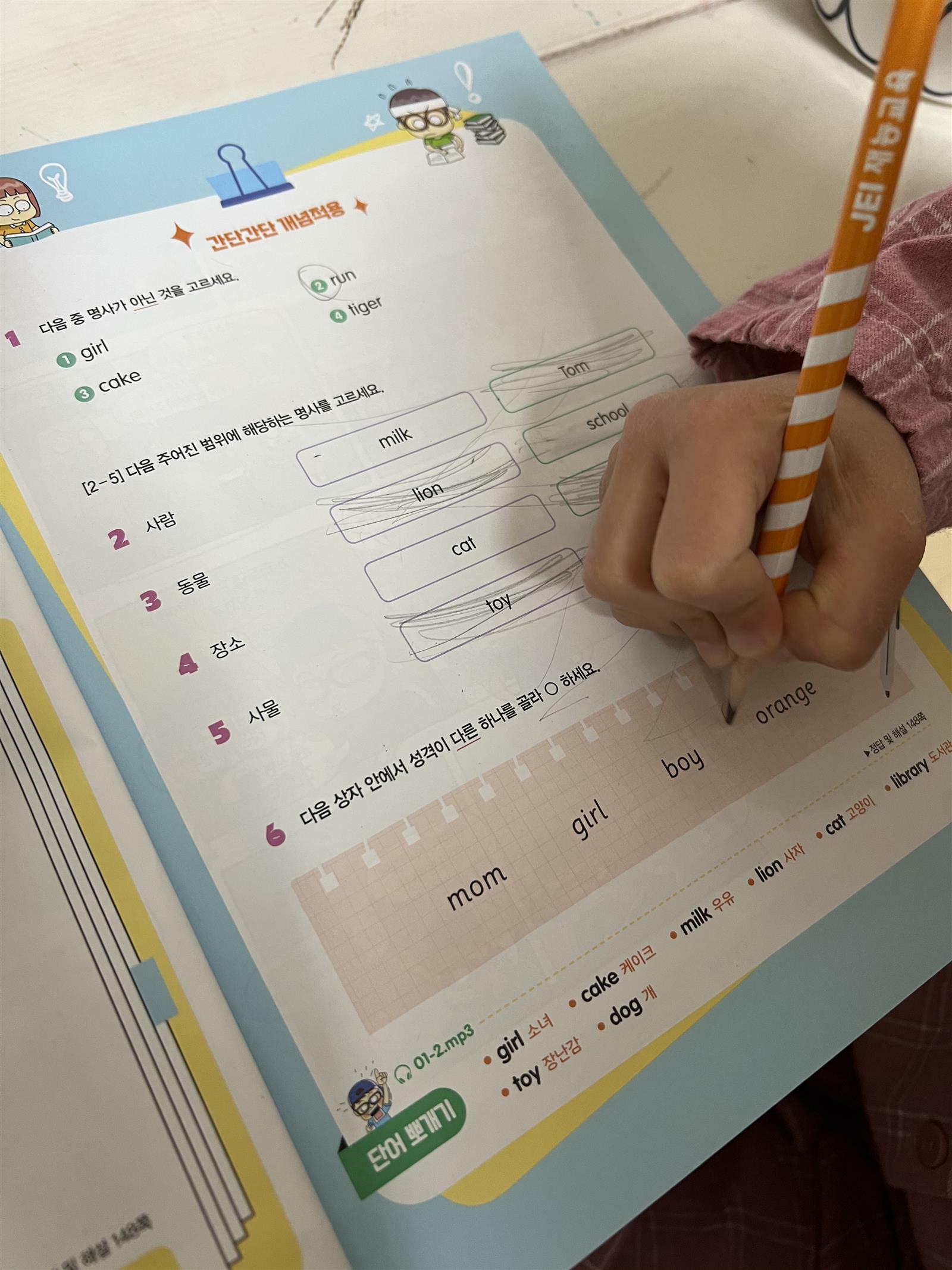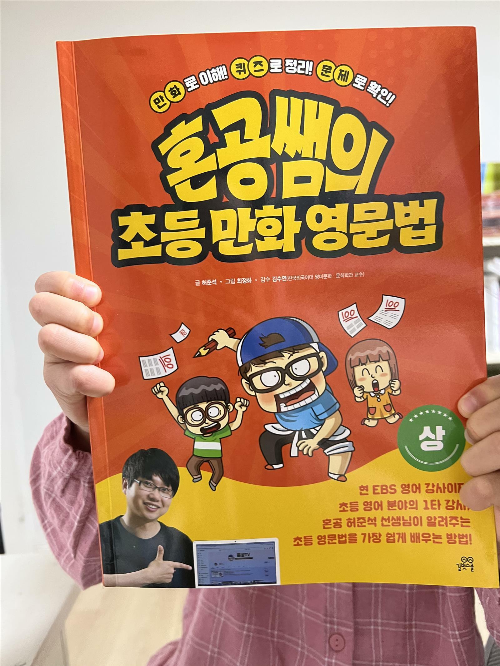 '혼공쌤의 초등 만화 영문법' 책 상편을 보았습니다. 총 2권으로 이루어진 책인데 이번에 아이와 '상' 책을 살펴보았어요. 저자는 유명한 혼공쌤입니다. EBS 영어 강사로 보신 분도 있으시겠죠? 초등 영어 분야에서 1타 강사라고 하십니다. 저도 평소에 혼공쌤에 대해 많이 들었는데 이렇게 책으로 만나니 더욱 반갑더라구요. 요즘 아이와 영어 문법을 조금씩 진행하고 있습니다. 어느정도 리딩 수준이 올라오고 나서는 문법도 조금씩 짚어 주어야 하는 것 같더라구요. 그런데 아직 어려운 용어에 익숙하지 않아서 문법을 배우기에 쉽지 않습니다. 영어 유치원에서 사용한다는 영어 문법책을 보다가 이번에 혼공쌤 책을 보았는데 한국 아이들에게 적합한 책이라는 생각이 들었습니다. 그래서 혼공쌤 책과 함께 영어 문법을 시작해 보았습니다. 아이들이 흥미를 가질 수 있도록 처음 배울 문법을 만화로 설명해 주고 있습니다. 저희 아이도 책을 보고 조금 뒤로 물러서더니 만화를 보고 다시 적극적인 자세로 임하더라구요. 일단 만화는 한장 정도로 간단하게 있어서 아이가 오늘 배울 문법내용을 이해하고 시작 할 수 있습니다. 제일 처음 명사에 대해서 나옵니다. 명사의 범위를 자연스럽게 익히고 알아갈 수 있습니다. 명사는 어떤 것인지 만화를 통해 이해하고 초성맞추기 문제로 다져 볼 수 있습니다. 한글로 이해하고 써보는 방식이라서 저는 이해하기 쉽더라구요. 초성 문제를 풀고 완전히 이해한 다음 개념을 적용해서 영어 단어를 보고 직접 풀어 볼 수 있습니다. 문제가 많지 않고 개념을 짚고 넘어가는 문제 위주로 되어 있어서 아이가 거부하지 않고 쉽게 풀어보았습니다. 이 책은 문제집이라기 보다는 초등 영문법 책에 더 가까운 것 같아요. 개념이해를 위해 이 책을 한번 훑어 보면서 내가 잘 이해했는지 문제도 풀어 본다면 초등 영문법은 걱정하지 않아도 될 것 같습니다. 초등 영문법으로 처음 이 책을 보는 것을 추천 드립니다. 저희 아이이도 아직 어리지만 쉽고 재미있게 익힐 수 있었습니다. 초등학교 3학년 아이부터는 스스로 읽고 이해해 나갈 수 있을 것 같아요. 그리고 무엇보다 영어에 익숙하지 않아도 이 책은 지문이 한글로 되어 있고 한글로 설명된 책이라서 아이가 거부하지 않을 것 같네요. 보통 영문법이라고 하면 어려운 단어가 많고 이해하기 어려운 설명들로 되어 있는데 이 책은 초등학생이 이해하기에 좋은 책인 것 같습니다. 무엇보다 가장 큰 장점은 짧은 만화와 간단한 개념 문제가 아이들에게 부담을 주지 않는 다는 것입니다. 그리고 한번 읽고 끝내는 책이 아니라 필요할 때마다 꺼내서 보면 장기기억으로도 남을 수 있을 것 같아요. 한 챕터를 끝낼 때마다 종합문제를 풀어 볼 수 있어서 내가 얼마나 이해했는지 점검 할 수 있습니다. 뒷 편에는 정답과 해설이 첨부되어 있어서 따로 찾아보지 않아도 되니 좋더라구요. 가끔 영어 문제집들을 보면 정답이 없고 온라인으로 찾아야 하는 경우가 있더라구요 그래서 정답이 붙어있는 영어책이라 더 반가웠답니다. 아이와 즐겁게 영문법 공부하길 원하시는 분들에게 적극 추천해 봅니다. 엄마표로 진행하기에도 부담이 없는 것 같아요. 출판사로 부터 도서를 제공받아 직접 읽고 작성한 리뷰입니다. #혼공쌤의초등만화영문법 #길벗스쿨 #초등영문법 #책세상 #맘수다 #책세상맘수다카페