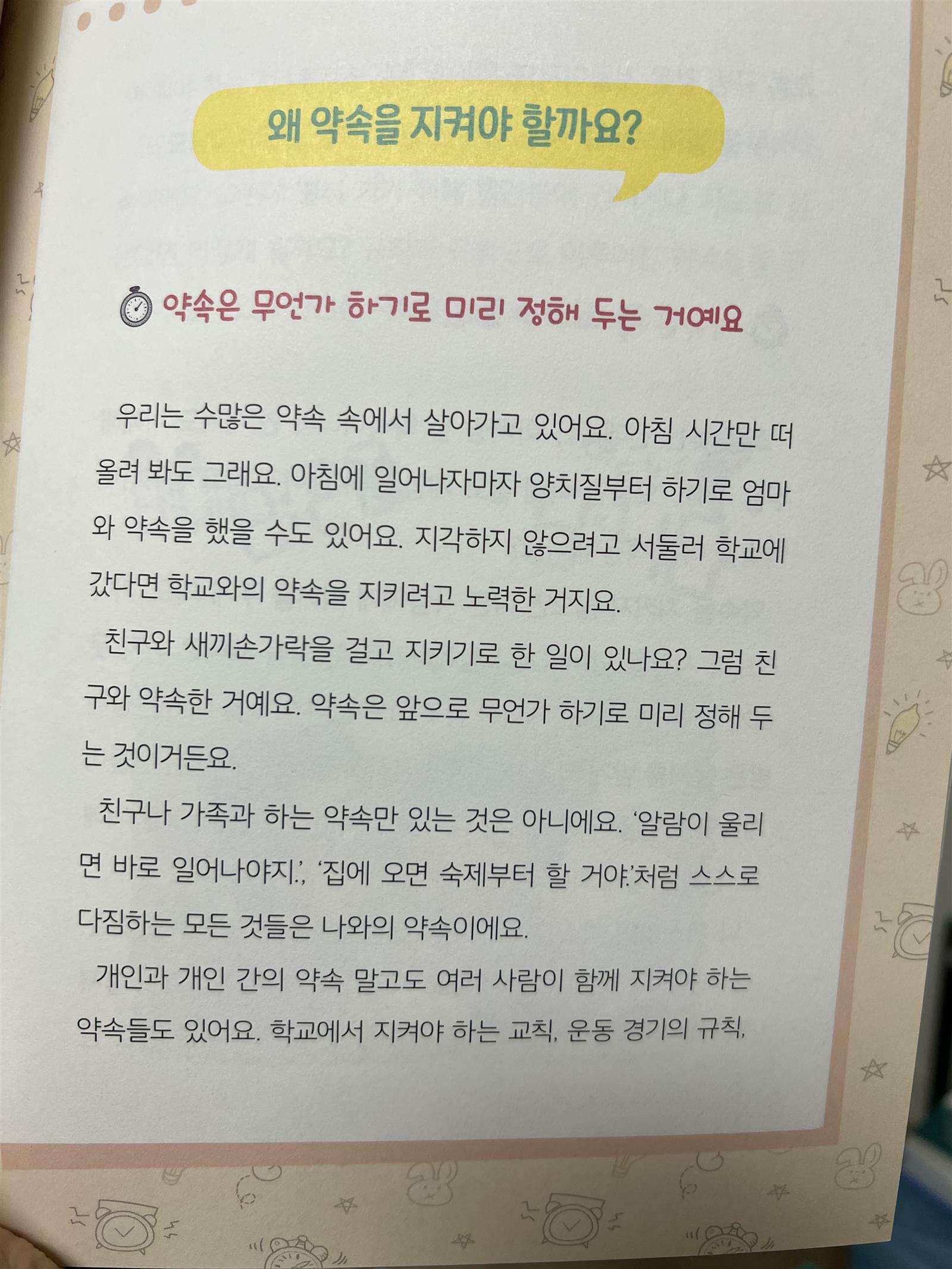 아직 어린 아이들의 경우 친구와의 약속이 어떤 의미인지 잘 모를 수 있을 것 같습니다. 하지만 그 작은 약속 하나 하나가 모여서 신뢰를 쌓고 믿음을 갖게 된다는 것을 책을 통해 배울 수 있습니다.