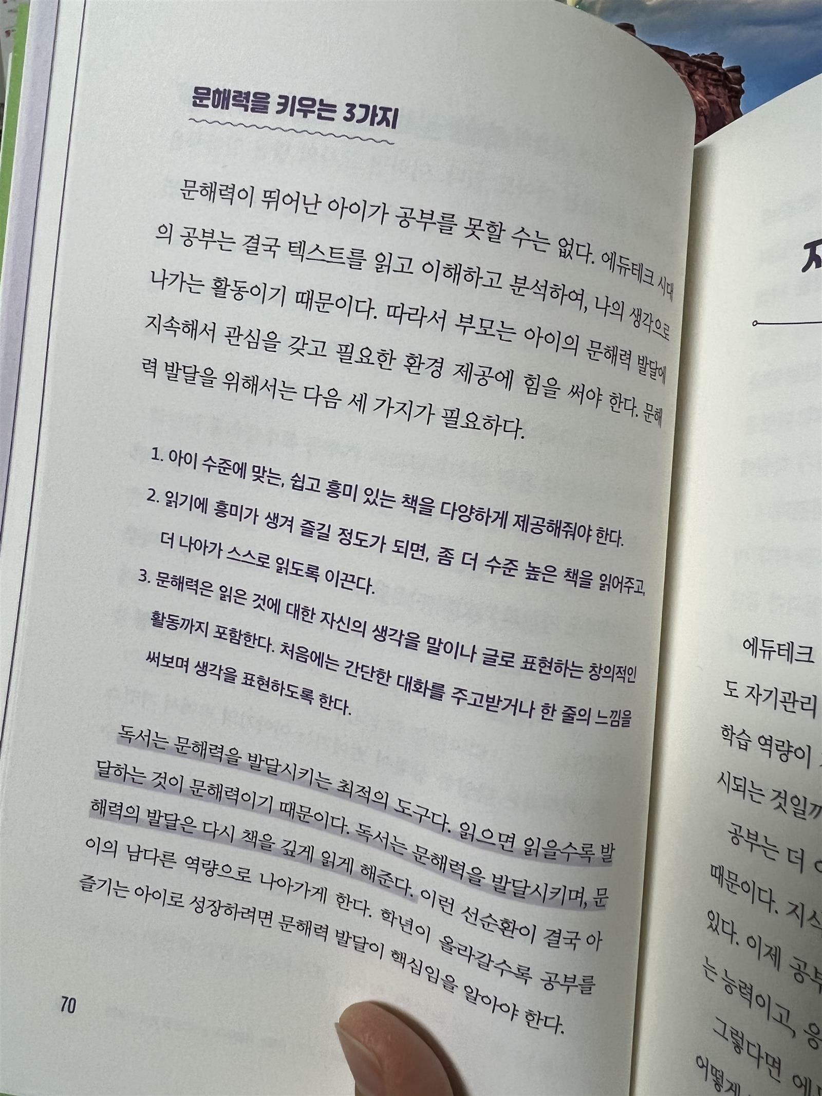 먼저 문해력에 대해 이야기를 하고 있습니다. 그리고 아이들의 자기주도적인 생활의 전반적인 모습이 중요하다고 합니다.  대표적인 예로 헬리코터맘의 자녀들이 결국에는 스스로 아무것도 하지 못하게 되는 모습과 같습니다. 누군가 내 삶을 대신 살아 줄 수 없는 것이 맞습니다. 오은영 박사님의 말씀처럼 아이들을 키우는 최종 목표는 스스로 자립하게 하는 것이라고 하던데 그와 유사한 것 같습니다. 그만큼 자기주도적인 생활태도가 공부에도 큰 영향을 미치는 것 같습니다.