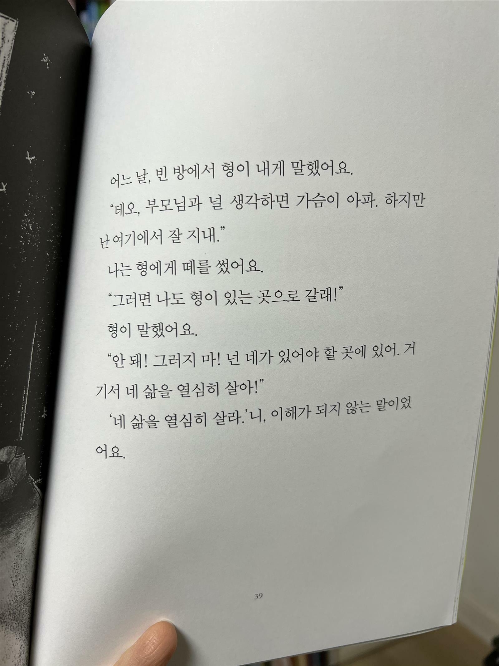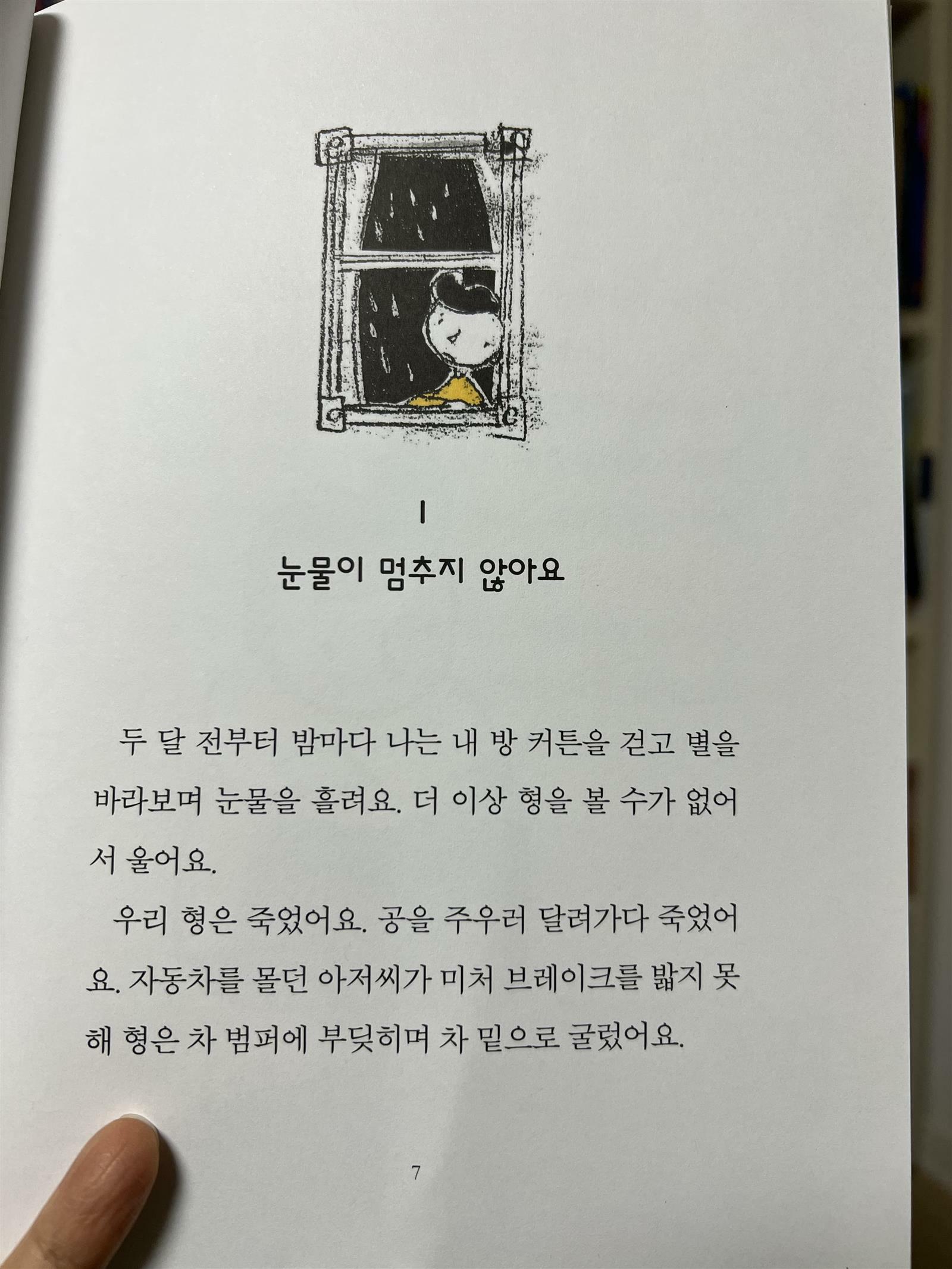 아이에게 먼저 읽어보라고 권했는데 첫 장을 읽자마자 '엄마, 죽었어' 라고 크게 이야기 하더라구요. 무슨 이야기인가 살펴보니 테오의 형이 교통사고로 죽게되는 이야기가 먼저 나오더라구요.