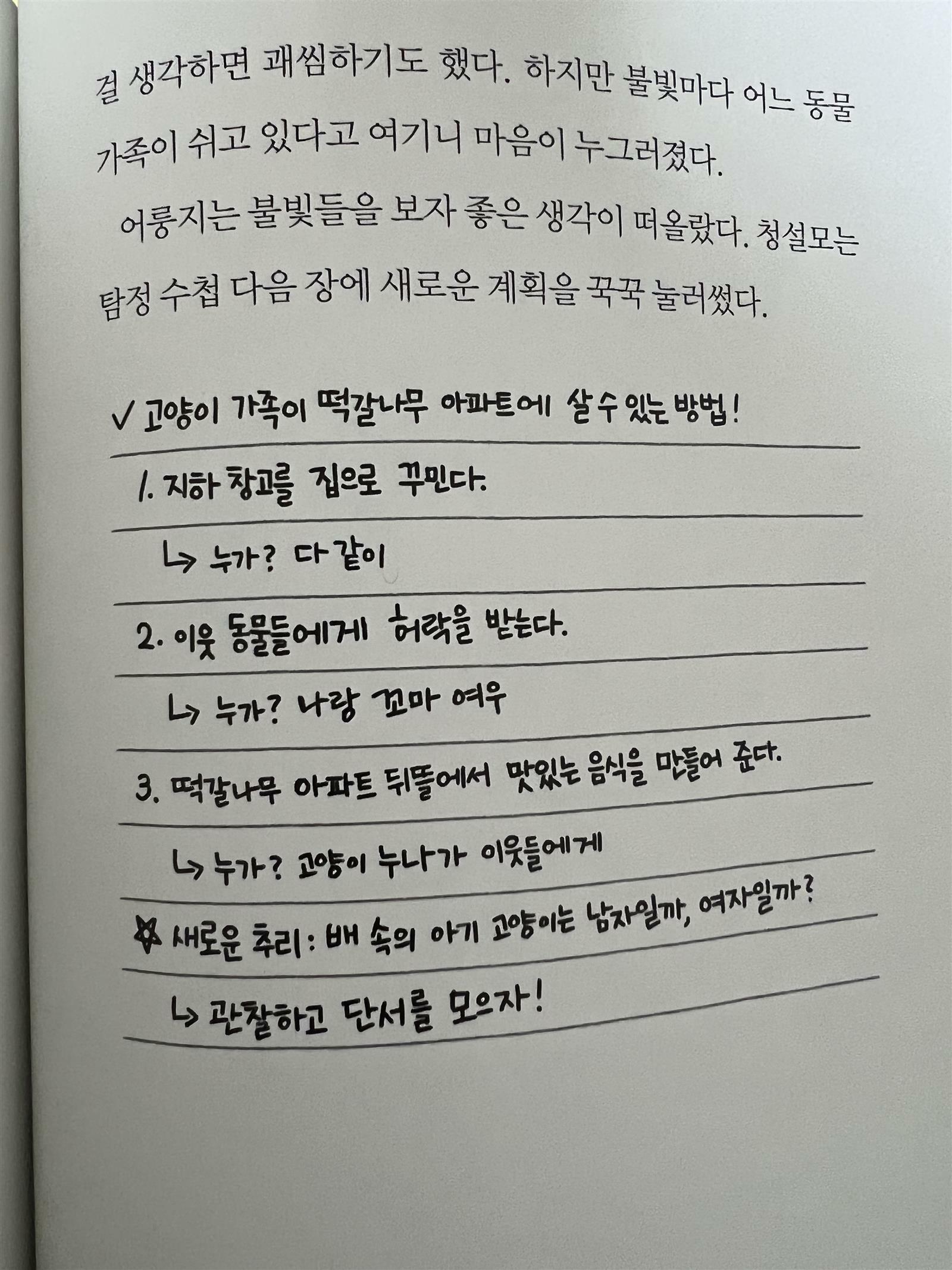 '수상한 아랫집의 비밀' 이라는 책을 읽어보았습니다. 저학년 아이들이 재미있게 볼만한 책인것 같아요. 글자크기도 적당하고 그림들도 아기자기하게 그려져 있어서 그림책에서 넘어오기에 좋은 책입니다. 저희 아이도 예비초인데 이 책을 재미있게 보고 있습니다. 제목에서부터 느껴지는 '수상한' 이라는 표현이 궁금하게 만드는 책입니다. 도대체 왜 아랫집이 수상한지 생각하면서 읽게 됩니다. 아랫집 할머니가 사는 곳에 불이나면서 청설모는 수상하다는 생각을 하게 됩니다. 과연 할머니의 정체가 무엇일까? 생각하면서 혼자 추리해 나가는 이야기입니다. 청설모는 자신의 노트에 수상한 점과 발견한 점등을 적어가면서 생각해 봅니다. 이 과정이 꽤 흥미롭게 재미있는 것 같습니다. 예전에 저희 아이가 추리하는 것이 재미있다고 한적이 있는데 이 책이 바로 추리하면서 보는 책입니다. 아마도 아이들이 대부분 추리하는 내용을 좋아하는 것 같아요. 다음 이야기가 궁금해지고 그래서 자꾸 책을 보게 만드는 점이 있습니다. '수상한 아랫집의 비밀'을 청설모는 밝혀 낼 수 있을까요? 청설모의 추리 노트를 따라가다보면 나름의 반전이 펼쳐집니다. 아이와 궁금해하면서 책을 읽다보니 어느새 아이도 저도 책에 푹 빠지게 되는 것 같아요. 저는 얼른 먼저 읽고 아이가 읽기만을 기다리고 있습니다. 함께 책을 읽고 이야기 나눈다면 더 풍성한 독서가 될 것 같습니다. 가끔은 제가 먼저 읽고 아이가 생각해 보았으면 좋을 만한 질문을 포스트잇에 붙여서 책을 주기도 합니다. 언제가 독서관련 육아서에서 알게된 팁인데 참 좋은 것 같아요. 엄마의 쪽지는 아이들을 기분 좋게 하는 것 같습니다. 엄마의 책 관련 질문에 대답하기 위해서 책에 더 집중하는 효과도 있습니다. 이 책도 아이들과 즐겁게 읽고 질문해 볼 수 있을 것 같아요. 추리 좋아하는 아이들과 저학년 아이들에게 적당한 읽기물인 것 같아서 추천해 봅니다. 출판사로부터 도서를 제공받아 직접 읽고 작성한 리뷰입니다. #수상한아랫집의비밀 #해와나무 #책세상 #맘수다 #책세상맘수다카페