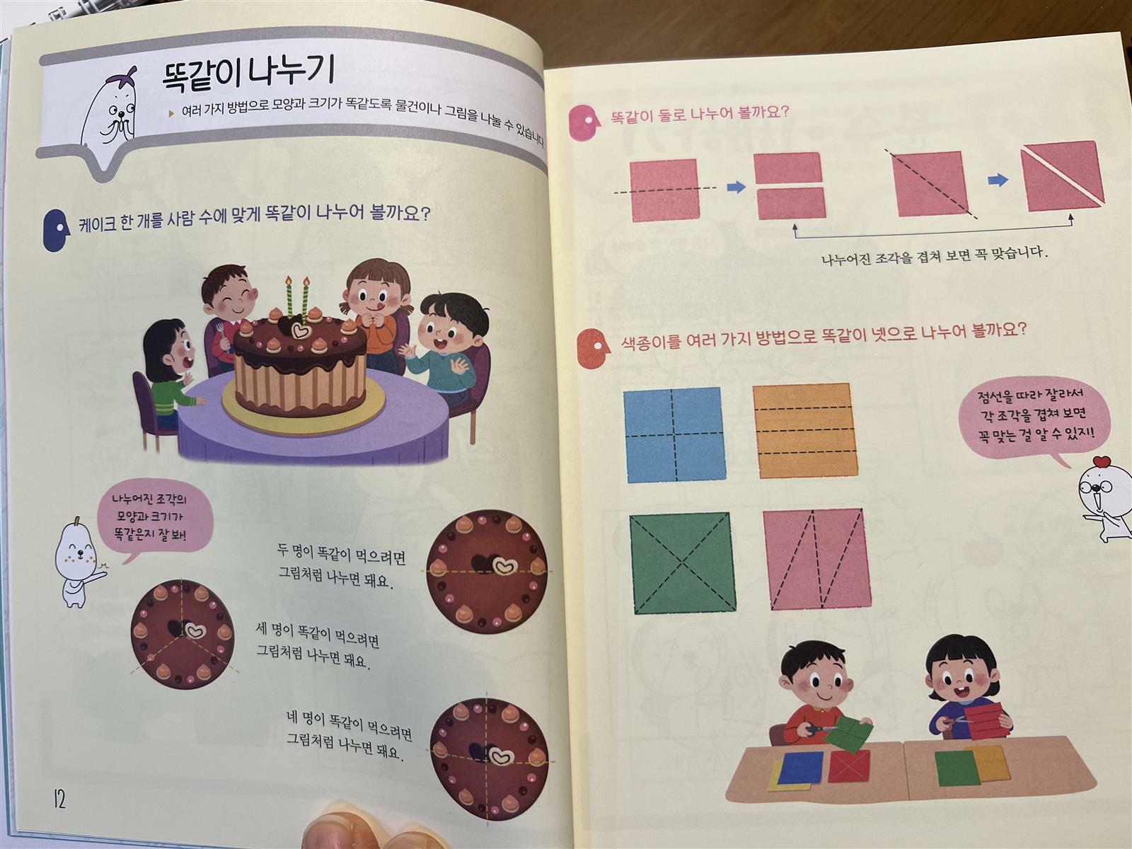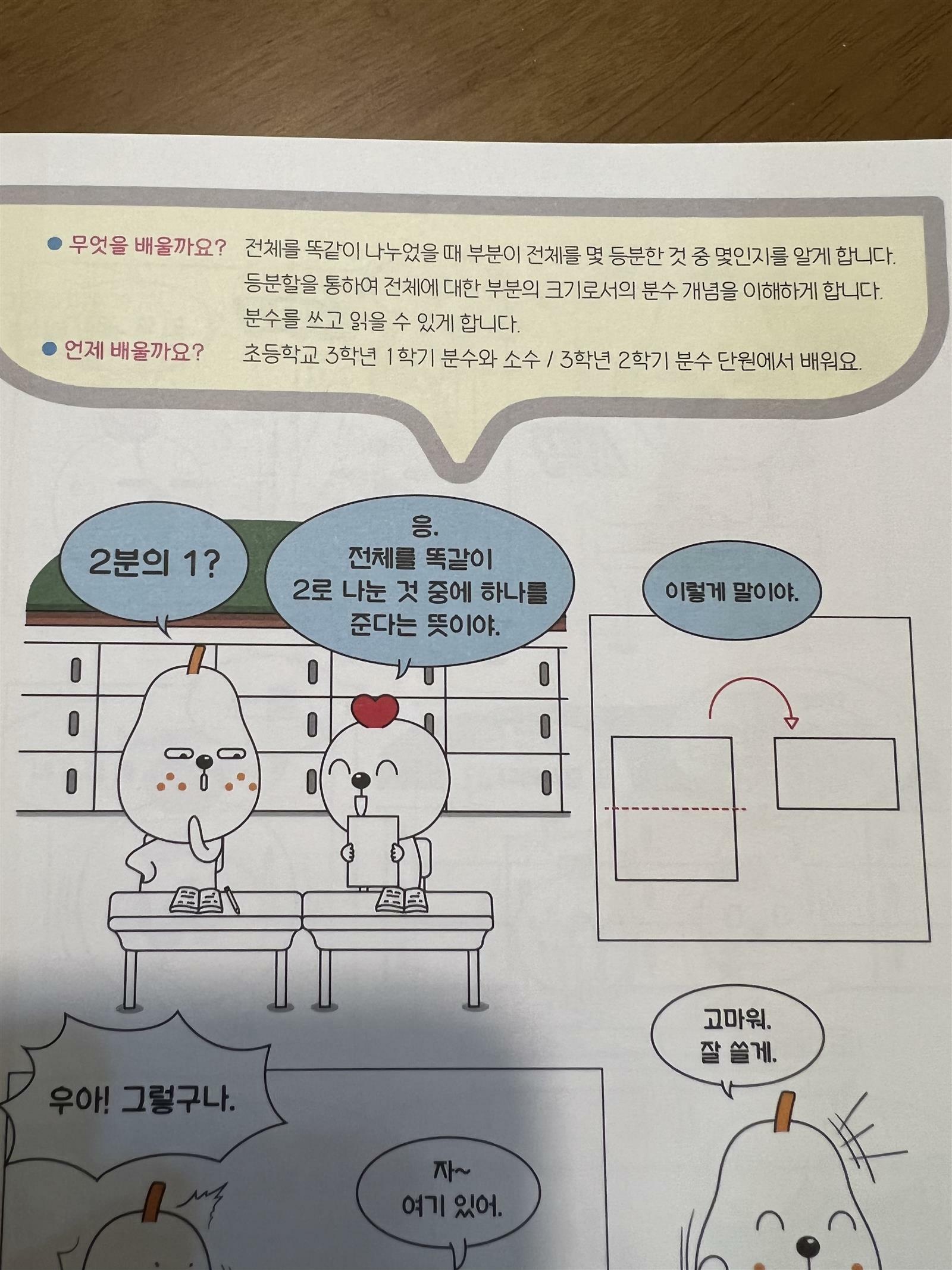 '씽씽래츠고 어떻게 나눠 먹지?' 라는 책을 읽어보았습니다. 분수와 소수에 대해서 쉽고 재미있게 알려주는 책입니다. 아직 아이가 분수를 배울 나이는 아니지만 분수에 관심을 보이길래 이 책을 선택했습니다. 일단 개념을 이해하기 쉽게 웹툰 형식으로 알려주고 있습니다. 어려운 수학을 배운다는 느낌이 아니라서 더 친근합니다. 일강에서 자연스럽게 분수를 생각해 볼 수 있도록 어떻게 나눠먹을까로 고민하게 합니다. 먹는 것이라면 눈이 커지는 아이들에게 관심을 끌기에 충분한 것 같아요. 만화로 개념을 알려주고 엄마가 보면서 어떤 팁으로 알려줄지도 살짝 나와 있습니다. 그리고 교과서 어느 학년에 나오는 개념인지 알려주니까 집에서 아이와 함께 보면서 배우기 쉽게 되어 있네요. 교과서와 연계되어서 아이들이 읽고 이해 할 수 있다는 점이 참 좋은 것 같습니다. 던부 만화로만 되어 있지 않고 간략한 지면 설명과 그림도 있어서 예습과 복습으로 이 책을 보기에 좋은 것 같아요. 일단 쉽게 설명해주니 예습으로 좋고, 잘 정리되어 있어서 복습으로도 좋습니다. 무엇보다 수학을 재미있게 접근해 볼 수 있다는 점이 장점인 것 같아요. 너무 실생활과 동떨어진 수학이야기는 아이들이 받아들이기 어려운 것 같아요. 이제 뭔가 스토리텔링 형식의 수학이 필요 할 때입니다. 그래서 수학 동화를 많이 보기도 하는 것 같아요. 하지만 개념을 잘 익히기 위해서는 어느정도 설명이 필요한데 어렵지 않게 설명해주는 책이 처음에는 좋은 것 같더라구요. 일단 개념 이해를 하고나면 그다음부터는 연습과 반복이 중요 한것 같아요. 문제풀이 형식의 책은 아니지만 정리하고 개념 익히기에 씽씽레츠고 시리즈가 좋은 것 같네요. 분수와 소수를 재미있게 공부하고 싶은 아이들에게 추천해봅니다. 출판사로부터 도서를 제공받아 직접 읽고 작성한 리뷰입니다. #씽씽레츠고 #어떻게나눠먹지? #이젠교육 #분수와소수 #책세상 #맘수다 #책세상맘수다카페
