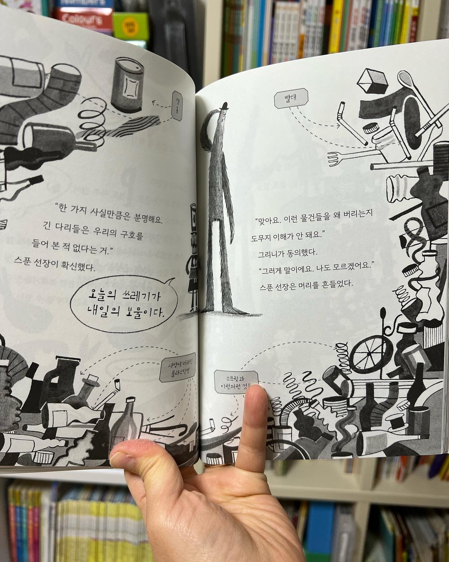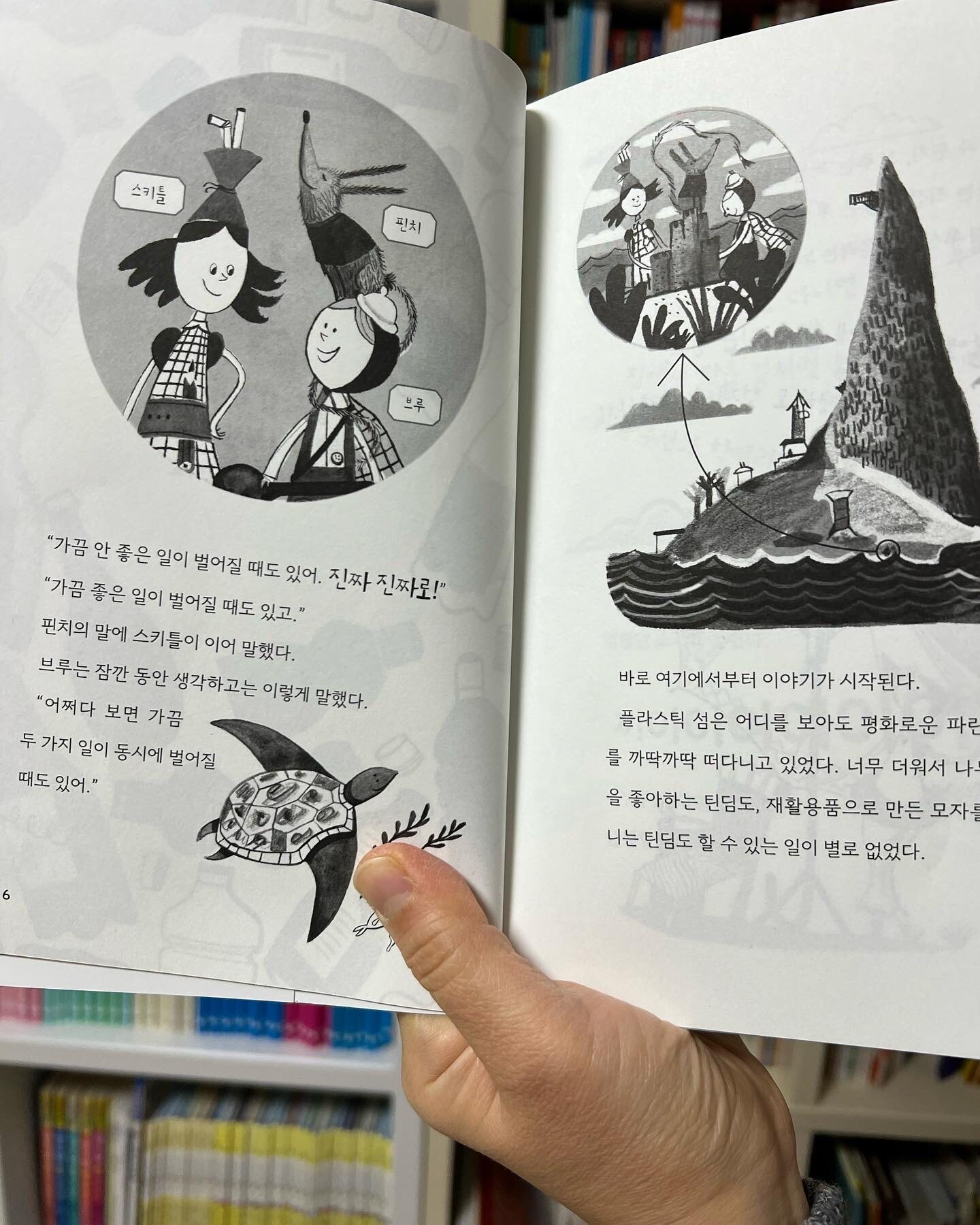 얼마 전에 지구 온난화와 관련해서 거북이들의 멸종이 걱정된다는 뉴스를 본 적이 있습니다. 거북이들은 모래 온도에 따라 성별이 결정되는데 온도가 높아져서 암컷만 생기고 있다는 것입니다. 나중에 수컷이 없어서 번식이 어려워진다면 거북이는 멸종위기에 처한다는 것이지요. 거북이 온도에 따라 성별이 결정된다는 사실이 참 놀라웠습니다. 그리고 환경의 작은 변화에도 동물들과 사람들에게 위협이 될 수 있다는 것도 새삼 깨닫게 되었네요. 이번에 읽어 본 책은 '플라스틱 해결사'라는 책입니다. 벌써 두번째 시리즈 이야기이고 부제는 틴딤, 거북이를 구출하라 입니다. 거북이가 등장하는 이야기라서 그런지 거북이 관련 뉴스가 떠오르더라구요. 주인공들이 살고 있는 곳에 플라스틱 산이 갑자기 사라지면서 이야기가 펼쳐집니다. 이들은 쓰레기라는 단어대신 쓸모있는 것의 순위에 따라 물건들을 나누고 재활용하고 있습니다. 그런데 깁자기 플라스틱산이 사라지고 스푼건장과 그리니도 실종됩니다. 그들이 도착한 곳은 거북이들이 알을 날으러가는 거북섬이었네요. 바다거북들의 험난한 여정을 보면서 천적들의 위협보다 더 위협적인 것은 인간들의 발자국과 쓰레기입니다. 그리고 앞선 말한 온난화도 큰 문제이지요. 그래도 이 책에서는 스푼선장과 그리니가 긴 다리와 꼬마 긴 다리의 도움으로 새끼 거북이를 구출 해 냅니다. 스푼선장과 그리니를 찾아나선 틴딤들의 이야기와 스푼선장과 그리니의 활약을 재미있게 지켜 볼 수 있는 책입니다. 책의 배경도 플라스틱 섬이라는 것에 있어서 아이들이 책을 통해 환경에 대해 생각해 볼 수 밖에 없겠더라구요. 요즘 같이 환경에 관심을 많이 가져야 하는 시기에 이런 책들이 아이들의 상상력도 자극하고 환경과 함께 살아가는 우리에 대해서도 생각해 볼 수 있는 계기가 될 것 같네요. 출판사로부터 도서를 제공받아 직접 읽고 작성한 리뷰입니다. #협찬 #플라스틱해결사 #틴딤거북이를구출하라 #주니어RHK #책세상 #맘수다 #책세상맘수다카페