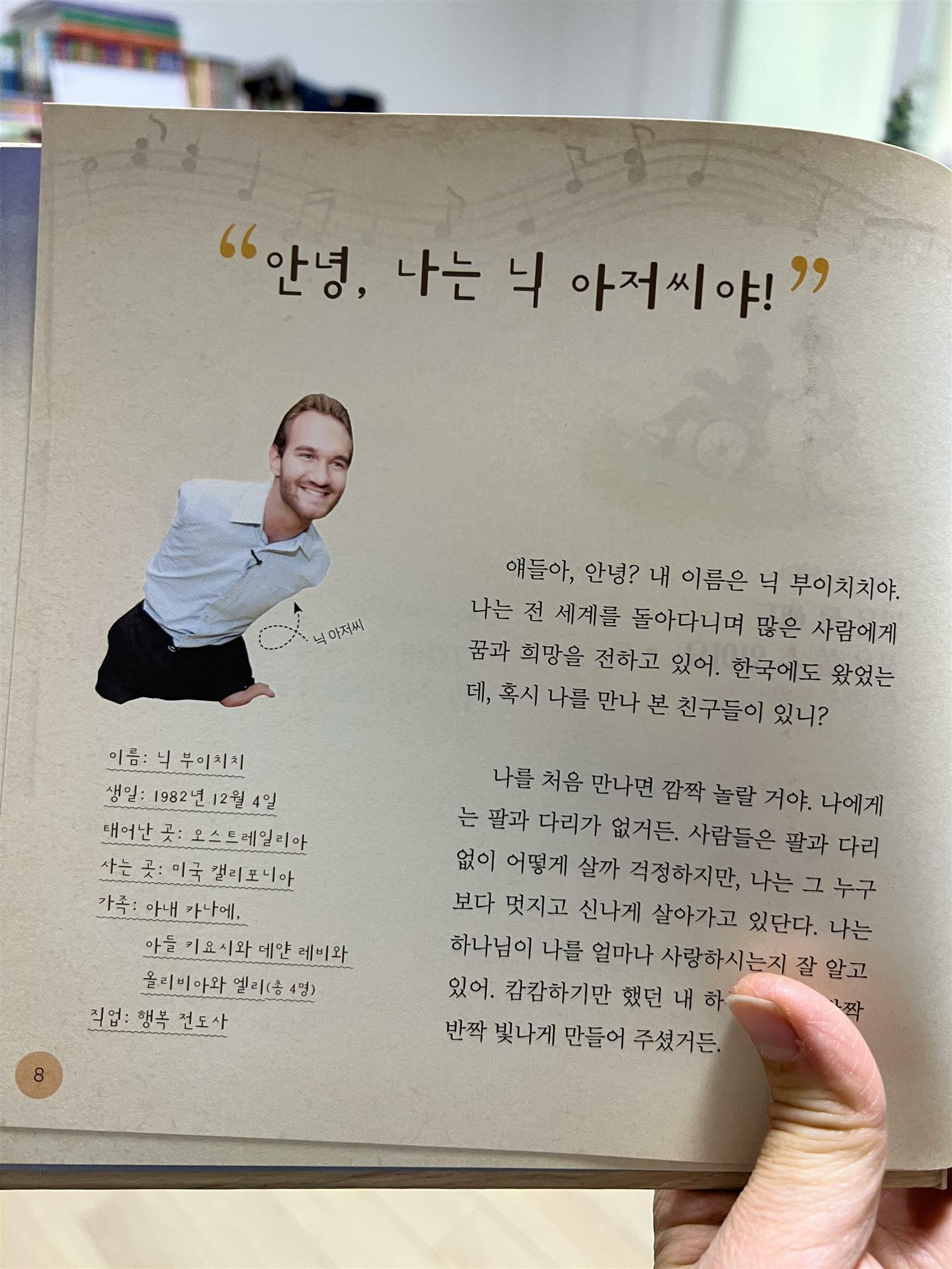 '닉 아저씨처럼 보물은 네 안에 있어' 라는 책을 읽어 보았습니다. 대학생시절에 닉 부이치치의 강연을 들어 본 기억이 납니다. 그때 참 어렸는데 닉부이치치의 이야기가 새롭게 다가왔던 것 같습니다. 어려움을 어려움으로 생각하지 않고 견뎌내는 힘은 어디에 있는 것일까요? 요즘 아이들은 참 많은 것을 가지고 있지만 너무나 당연하게 생각하는 것 같습니다. 저도 감사함을 잊고 살아왔던 순간 순간들이 많습니다. 하지만 이 책을 읽으면서 감사와 내 안의 보물을 다시 찾을 수 있게 되었습니다. 닉 부이치치의 소개로 시작하는 책 내용은 닉 부이치치와 비슷한 상황에서도 희망을 잃지 않고 견뎌낸 사람들을 우리에게 보여주고 있습니다. 첫 번째로 소개하는 친구는 세진이라는 아이입니다. 우리나라 아이라는 사실에 많이 놀랐습니다. 물론 지금은 장성해서 자신의 일을 하고 있는 어른이지만 어린나이에 어려움을 이겨내고 보물을 발견한 친구입니다. 초등학교 교과서에도 소개되고 있다고 하니 참 놀라운 아이입니다. 비록 어떤 한 가정에 입양되어 넉넉한 삶을 살지는 못했지만 양어머니의 헌신과 희생이 세진이를 일으켜 세울 수 있었던 것 같습니다. 이 책을 읽으면서 가장 놀라운 사실은 바로 아이들의 엄마가 대단하다는 생각이었습니다. 자신의 아이가 장애가 있음을 인정하고 받아들이는 것부터가 결코 쉽지 않은 일입니다. 하지만 아이들에게 오히려 힘과 희망을 건네주고 물심양면 도와줄 수 있었던 것은 보통의 용기가 아닌 것 같습니다. 그런 어머니가 있었기에 장애를 가지고 있지만 끝까지 노력하고 힘을 낼 수 있었던 것이 아닐까요? 우리 아이들은 이 책을 보면 어떤 생각을 하게 될까요? 닉 부이치치의 바람대로 아이들 모두가 자신의 숨겨진 보물을 스스로 찾을 수 있다면 더할 나위 없이 좋을 것 같습니다. 닉 부이치치의 꿈쟁이 시리즈 책을 모두 아이들과 읽어보고 싶다는 생각을 했습니다. 내가 처한 상황에서 포기하지 않고 이겨내는 힘을 배울 수 있는 책인 것 같습니다. 모든 아이들과 엄마들에게 이 책을 추천해 봅니다. 아이와 함께 읽고 이야기 나누면서 아이들만의 보물을 찾아 보시길 바랍니다. 출판사로부터 도서를 제공받아 직접 읽고 작성한 리뷰입니다. #닉아저씨처럼보물은네안에있어 #보물은네안에있어 #닉부이치치꿈쟁이시리즈 #닉부이치치 #두란노키즈 #두란노 #책세상 #맘수다 #책세상맘수다카페