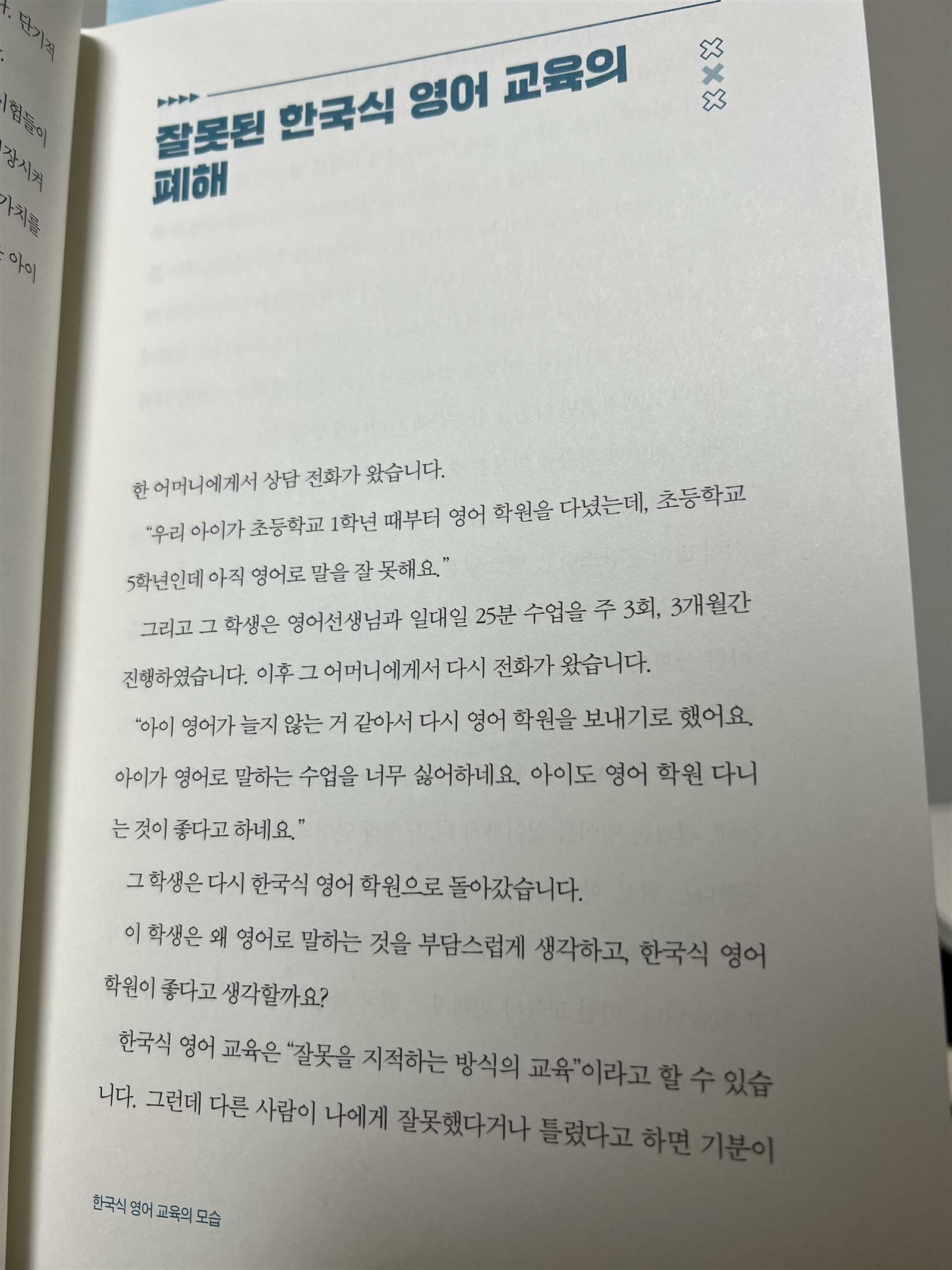 '아이주도 영어공부' 라는 책을 읽어 보았습니다. 영어공부에 정말 진심이라서 엄마표를 진행하고 있습니다. 물론 제가 많은 영어지식이 있는 것은 아니지만 한국식 영어는 아이들에게 물려주고 싶지 않아서 입니다. 이번에 읽은 책을 통해서도 더 확고하게 마음을 먹게 되었습니다. 한국의 영어교육 현실이 너무 암울합니다. 예전에 한번 바꾸려고 했지만 실패했습니다. 그 이유는 교사들과 학부모들의 반발이 심했기 때문이라고 합니다. 교사는 아이들에게 실생활에 적용 할 수 있는 영어를 가르칠 수 있는 능력이 없습니다. 문법은 알고 있지만 회화는 어려운 현실이기 때문이지요. 학부모들의 경우에는 두려움과 불안 때문일 것입니다. 여태껏 해온 문법위주의 영어공부를 갑자기 뒤엎는 다는 것은 대중의 생각이 바뀌지 않는 한 어려운 것입니다. 책의 저자도 이 책을 통해 많은 사람들이 지금 영어교육의 현실을 알고 생각이 바뀌길 바라고 있습니다. 책의 내용은 아이주도 영어공부의 방법 뿐만 아니라 왜 한국식 영어가 올바르지 않은지에 대해서도 설득력있게 과학적으로 언급하고 있습니다. 뇌과학적인 접근법을 통해 한국식 영어는 실생활에 전혀 사용 할 수 없는 영어임을 말해줍니다. 다른책을 통해 들어봤던 내용이라서 더욱 신뢰하며 책을 읽어 나갔습니다. 저자는 다른 나라의 영어교육법도 이야기하고 있습니다. 특히 핀란드의 영어교육법이 바뀌게 된 이유와 그 상황을 잘 설명하고 있습니다. 핀란드의 어순이 우리나라 말과 같다고 합니다. 그런데 핀란드는 영어교육법을 바꾼 이후부터는 영어로 실생활에 사용할 수 있을 정도로 되었다고 합니다. 그렇다면 우리나라도 가능성이 많다고 볼 수 있겠죠. 우리나라 아이들의 경우 머리가 더 좋음에도 불구하고 잘못된 교육방식이 아이들의 더 괴롭게 한다고 합니다. 이미 이러한 현실을 알고 있는 사람들은 돈이 들어도 유학이나 다른 영어교육법을 택하고 있습니다. 자녀의 미래를 생각해서라도 영어는 정말 필수입니다. 한국의 영어교육의 현실을 깨닫고 올바른 영어교육을 해야 하는 것 같습니다. 영어 교육에 관심 있으신 분들에게 이 책을 추천해 봅니다. 출판사를 통해 도서를 제공받아 직접 읽고 작성한 리뷰입니다. #아이주도영어공부 #나비의활주로 #책세상 #맘수다 #책세상맘수다카페 #영어교육 #한국교육