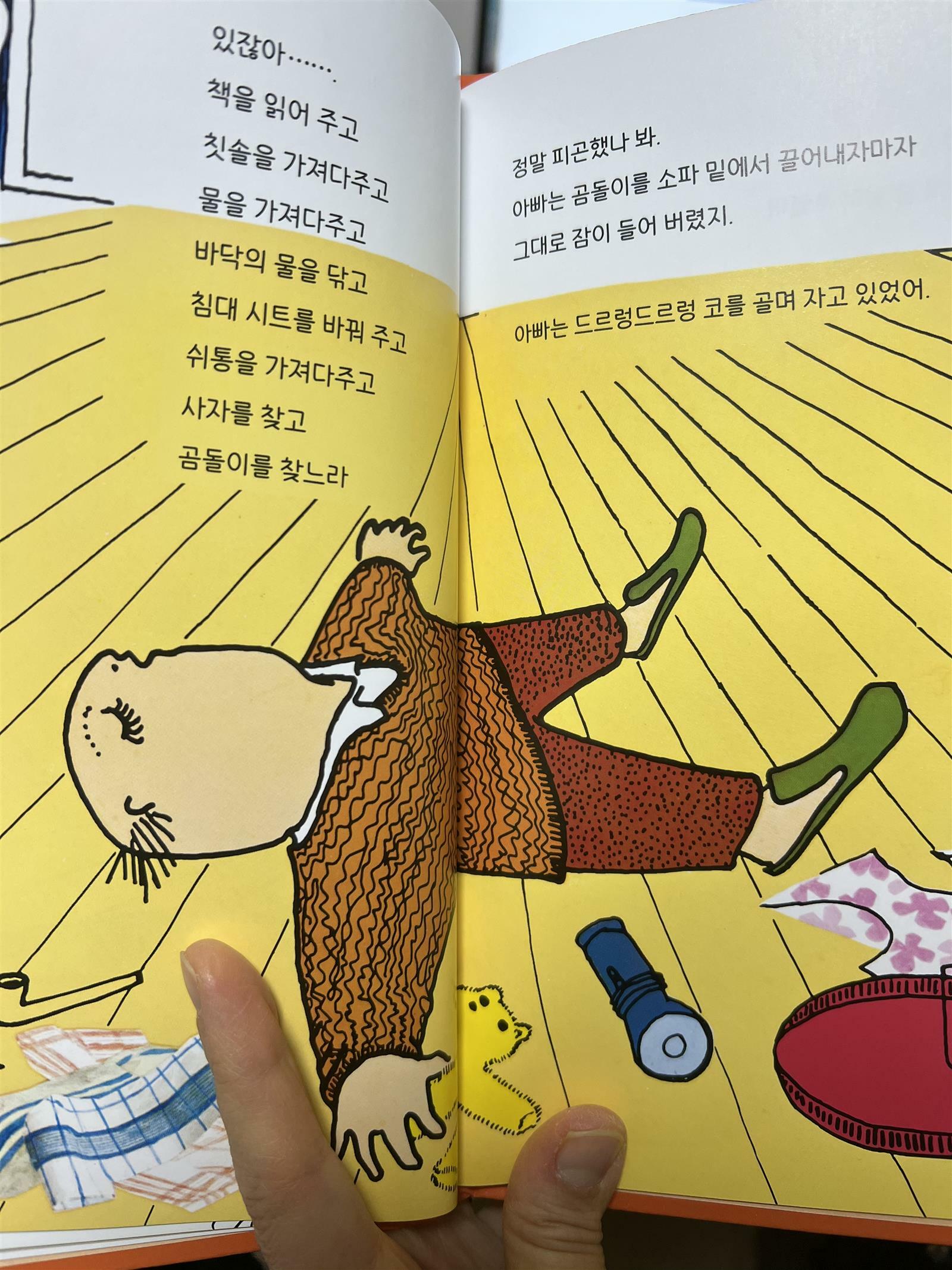 '자고싶지 않아요' 그림책을 읽어보았습니다. 아이들과 잠자기 전에 함께 누워서 보는데 저도 아이도 너무 공감되는 그림책 입니다. 아이들은 자기전에 해야 할 일들이 왜 이렇게 많은 걸까요? 꼭 해야 하는 양치를 비롯하여 굳이 하지 않아도 되는 것들이 자꾸 생각납니다. 물론 아이들 입장에서는 꼭 해야 하는 일들이겠죠? 하지만 재워야 하는 부모의 입장에서는 아이들의 요구를 다 들어주는 것이 힘이 듭니다. 이 책의 주인공 알폰스도 역시나 우리 아이들의 모습과 닮아 있습니다. 자야하는데 양치도 깜빡했고, 갑자기 인형을 찾기도 합니다. 저희 집도 알폰스와 다르지 않습니다. 자려고 누우면 왜 그렇게 목이 마르다고 하는 걸까요? 자기전에 여러번 물을 마시고 와야 안정을 찾습니다. 어떨 땐 잊고 있던 장난감이 생각나서 밤에 갑자기 온 식구가 찾아 나서기도 합니다. '자고 싶지 않아요' 책에서도 알폰스는 참 많은 일들을 아빠에게 요구합니다. 물을 가져다주니 마시지 않고 침대에 쏟는 이유는 무엇일까요? 아마 아이들은 알폰스 마음을 잘 이해하고 있겠죠? 이런 일들을 보면서도 알폰스 아빠는 화 한번 내지 않네요. 아빠의 모습은 저희집과 다르네요. 밤에 항상 시끄러운 소리가 끊이질 않아서 잠자기 전에는 항상 지칩니다. 책에서 알폰스 아빠도 결국에는 지쳐서 먼저 쓰러져 잠들어 버립니다. 아무일 없다는 듯이 알폰스는 아빠에게 담요를 덮어주고 스스로 자리로 가서 잠을 청합니다. 이젠 아빠가 잠들어서 알폰스의 요구를 들어줄 수 없을 테니깐요. 알폰스는 아빠와 더 놀고 싶었던 걸까요? 그래도 아빠가 잠들자 참 어른스럽게 아빠도 돌보고 스스로 자는 모습이 귀엽습니다. 우리 아이들의 모습을 꼭 빼닮은 알폰스 이야기가 궁금하신분들에게 이 책을 추천해 봅니다. 출판사로부터 도서를 제공받아 직접 읽고 작성한 리뷰입니다. #자고싶지않아요 #다봄 #책세상 #맘수다 #책세상맘수다카페