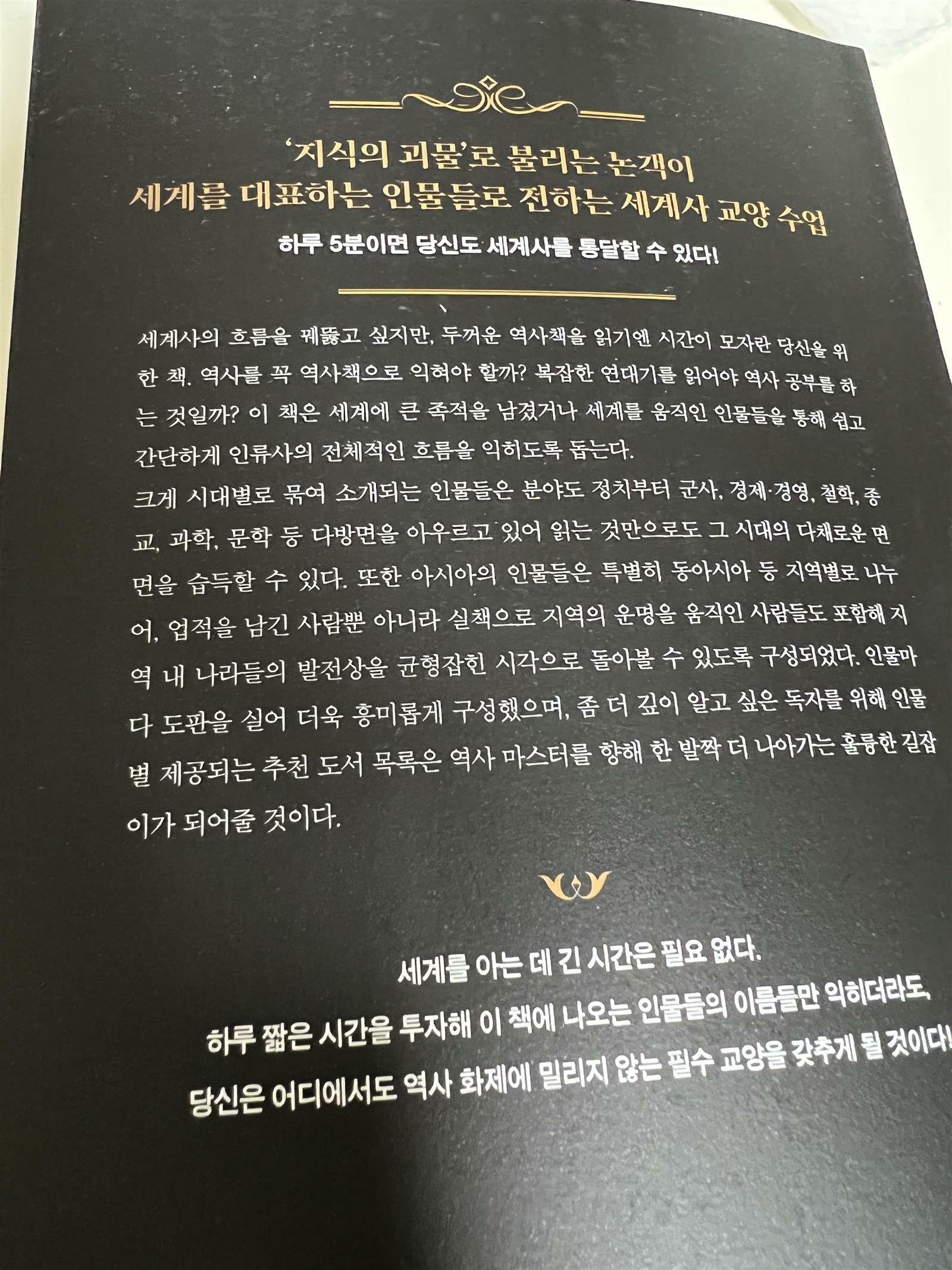 '인물로 읽는 세계사 교양수업 365' 책을 읽어보았습니다. 세계사를 잘 모르기 때문에 인물을 먼저 안다면 세계사 이해도 더 잘 될 것 같습니다. 이 책은 세계사의 주요 인물들은 잘 정리해 두었습니다. 제일 처음 나온 인물은 대피라미드를 건조한 이집트왕 쿠푸왕입니다. 하루에 5분씩 읽으면 세계사 인물들에 대해 많이 알게 될 것 같습니다. 한국사도 아이들과 공부 할 때 인물먼저 알아가는데 세계사도 마찮가지인 것 같습니다. 인물을 알아야 사건도 이해해 나가기 더 수월 한 것 같습니다. 세계사는 교과과정이라 공부해야 한다기 보다 상식적인 배경지식을 위해 읽고 알아두는 것이 중요한 것 같습니다. 책 뒷편에는 인명 색인이 있어서 궁금한 인물을 찿아 볼 수도 있어서 인물사전처럼 두고두고 보아도 좋을 것 같습니다. 앞으로 미래사회는 세계가 더 좁아지고 가까워 질 텐데 그럴수록 세계사를 알고 있어야 하는 것은 많은 도움이 될거라는 생각이 듭니다. 아직 아이들이 어리지만 저부터 인물들에 대해 알고 있어야 아이들과 대화를 더 잘 나눌 수 있을거란 생각이 듭니다. 엄마가 먼저 알고 있는 것이 아이들에게도 많은 도움이 되는 것 같습니다. 세계사에 대한 이해와 폭을 넓히고 싶은 모든 분들에게 추천하고 싶습니다. 집에 소장해두고 필요 할 때 생각날 때 찾아보면 참 좋을 것 같습니다. 하루 5분씩 투자해서 세계사에 한발짝 더 가까워 질 수 있을 것입니다. 책 한쪽에 인물 한명씩 설명되어 있고 읽고 나서 체크 할 수 있으니 별거 아니지만 성취감과 동기도 부려되는 것 같습니다. 저도 세계사 입문서로 이 책을 차근차근 읽어보려고 합니다. 출판사로부터 도서를 제공받아 직접 읽고 작성한 리뷰입니다. #인물로읽는세계사교양수업365 #세계사입문서 #한스미디어 #책자람카페