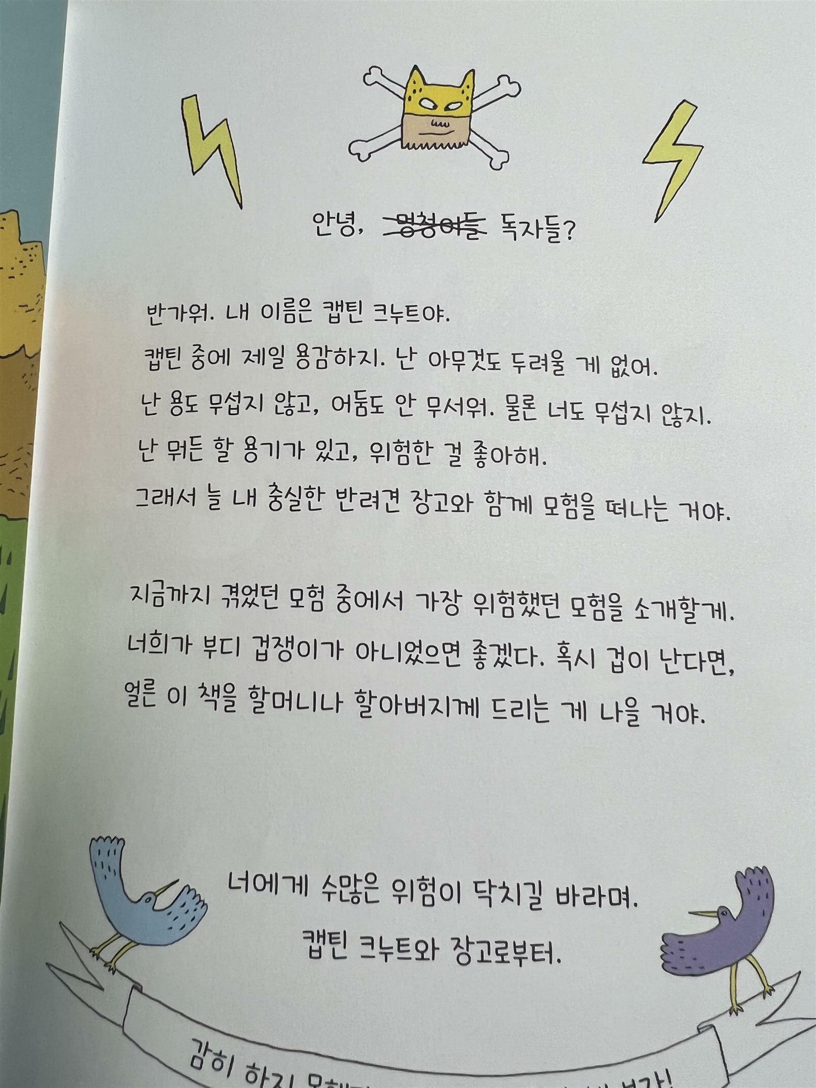 예림당에서 출판한 책을 한권 읽어 보았습니다. '캡틴 크누트와 멍청한 그림자' 라는 책입니다. 그림책보다 살짝 글밥이 많은 느낌입니다. 읽기 독립한 아이들이 재미있게 읽어 볼 수 있는 책입니다. 저희 첫째 아이에게도 한번 읽어보라고 주었더니 읹은 자리에서 다 읽어보더라구요. 책 표지부터 아이들이 좋아하는 그림입니다. 특히 남자아이들이 더 좋아할만한 그림체입니다. 물론 저희 첫째는 딸이어도 엄청 재미있어하면서 보았습니다. 아이들마다 성향과 취향이 다르다보니 콕 집어서 말할 수는 없지만 전반적으로 아이들이 좋아할만한 요서가 많이 있는 책이었습니다. 캡틴크누트는 평소대로 빨래를 널고 있었는데 그림자가 잘못 널었다고 하면서 다투게 됩니다. 멀리 가버린 그림자를 찾아 떠나는 모험이야기로 시작합니다. 그림자를 찾아 떠난 캡틴 크누트는 어떤 일들을 겪었을까요? 우리들이 흔히 보는 동화에 나오는 캐릭터들을 다른 모습으로 표현한 책입니다. 바다의 왕과 왕비를 만났는데 모습이 인어공주같지만 표정과 모습은 아름답지 않습니다. 뭔가 편견을 깨는 그림체들이 많습니다. 이런 요소들이 아이들에게는 새롭게 다가오는 것 같아요. 저희 아이도 그림체를 참 중요하게 생각하는데 재미있어하면서 보더라구요. 예쁜 그림만 좋아하는 아이들도 있겠지만 이런 그림들도 보면서 아이들이 환기하면서 새로운 것들도 받아들이며 사고 할 수 있는 계기가 되는 것 같습니다. 저희 둘째는 예쁜 공주 책만 좋아하는데 책 편식이 참 심해서 일부러 다양한 책을 노출하려고 노력합니다. 아이의 성향과 선호도에 맞는 책도 보여주면서 가끔 새로운 책들이 있다는 것을 알게해주는 것도 중요한 것 같습니다. 반면에 첫째는 책 편식이 없지만 선호하는 것은 있더라구요. 아이의 성향에 맞는 책들을 위주로 보면서 다른 책들도 슬쩍슬쩍 끼워주는 것이 참 중요한 것 같아요. 다시 캡틴 크누트 이야기로 돌아와 보면 모험을 좋아하는 크누트의 마지막 이야기가 어떻게 되었을까요? 다양한 모험을 아이들대신 해주는 느낌입니다. 어쩌면 아이들과 함께 모험을 하는 것 같기도 합니다. 실제로 일어날 수 없는 일이지만 무한한 상상력을 자극하는 책입니다. 크누트는 무사히 모험을 마치고 돌아왔는데 그림자를 차지 못해 아쉬워 합니다. 앗 그런데 깜짝 놀랄 일이 생겼습니다. 크누트 뒤에 그림자가 따라와서 서프라이즈로 놀라게 해 주었습니다. 크누트의 생일을 축하하는 의미로 준비했던 모험이었다고 하네요. 나름 반전이 재미있는 크누트 이야기를 한 번 보면 누구라도 빠져나 올 수 없는 이야기 입니다. 아이가 읽고 저도 한 번 읽어 보았는데 크누트의 행동과 크누트가 보여주는 용기를 재미있게 볼 수 있었습니다. 빠르게 전개되는 이야기 속에 나도 모르게 풍덩 빠져 볼 수 있었던 것 같아요. 재미있는 모험이야기를 찾는 분들에게 추천해 보고 싶습니다. 출판사로부터 도서를 제공받아 직접 읽고 작성한 리뷰입니다. #캡틴크누트와멍청한그림자 #예림당 #그림책 #동화책 #영웅 #모험 #책세상 #맘수다 #책세상맘수다카페