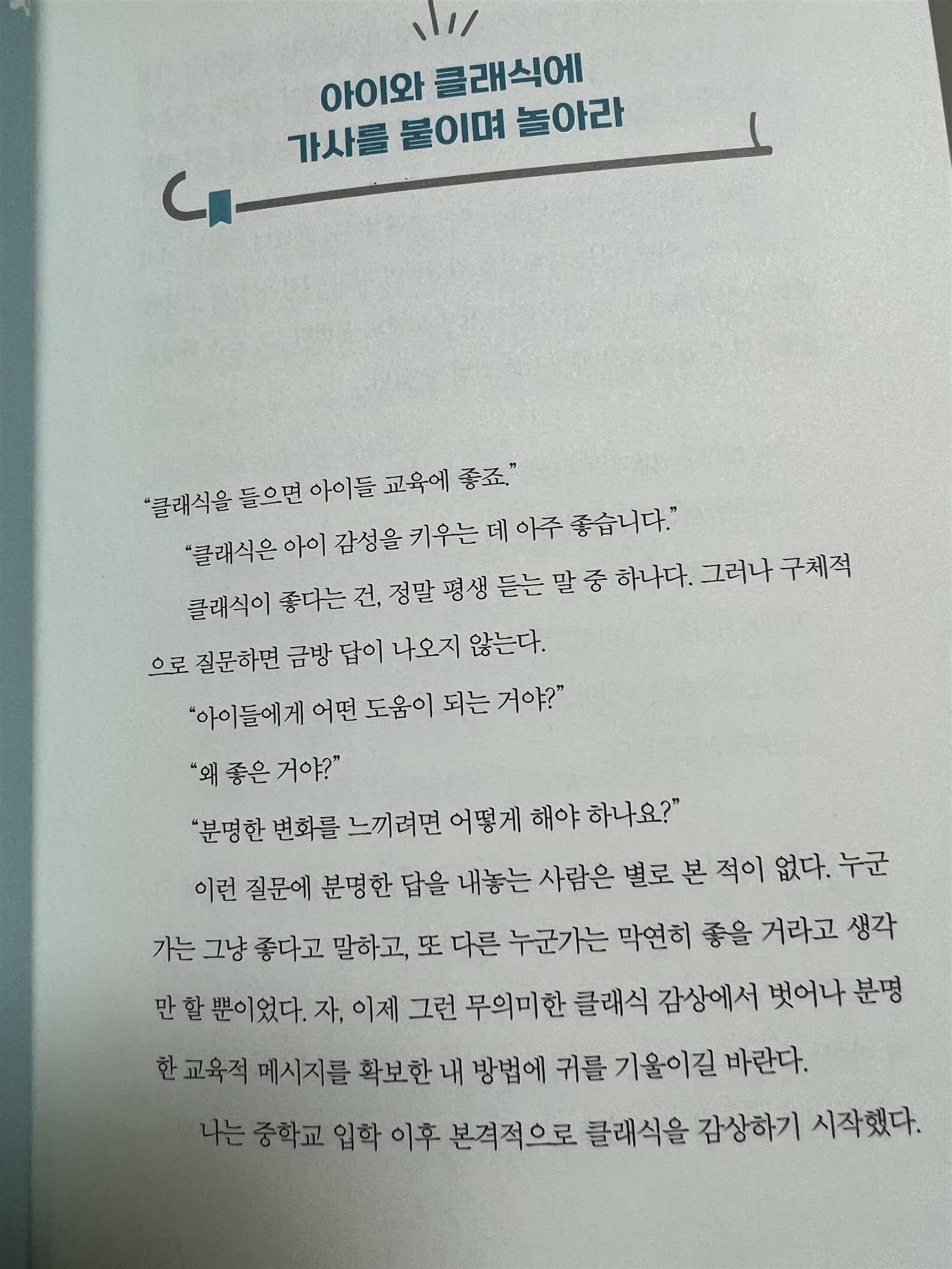 이 책을 통해 새롭게 적용해 보고 싶은 것 중 하나가 클래식에 가사를 붙여보는 방법입니다. 음악 관련 일을 했었기 때문에 아이들에게 클래식을 많이 들여주려고 노력했는데 저자의 말처럼 클래식에 가사를 붙여 보는 것을 적용해 보고 싶더라구요.