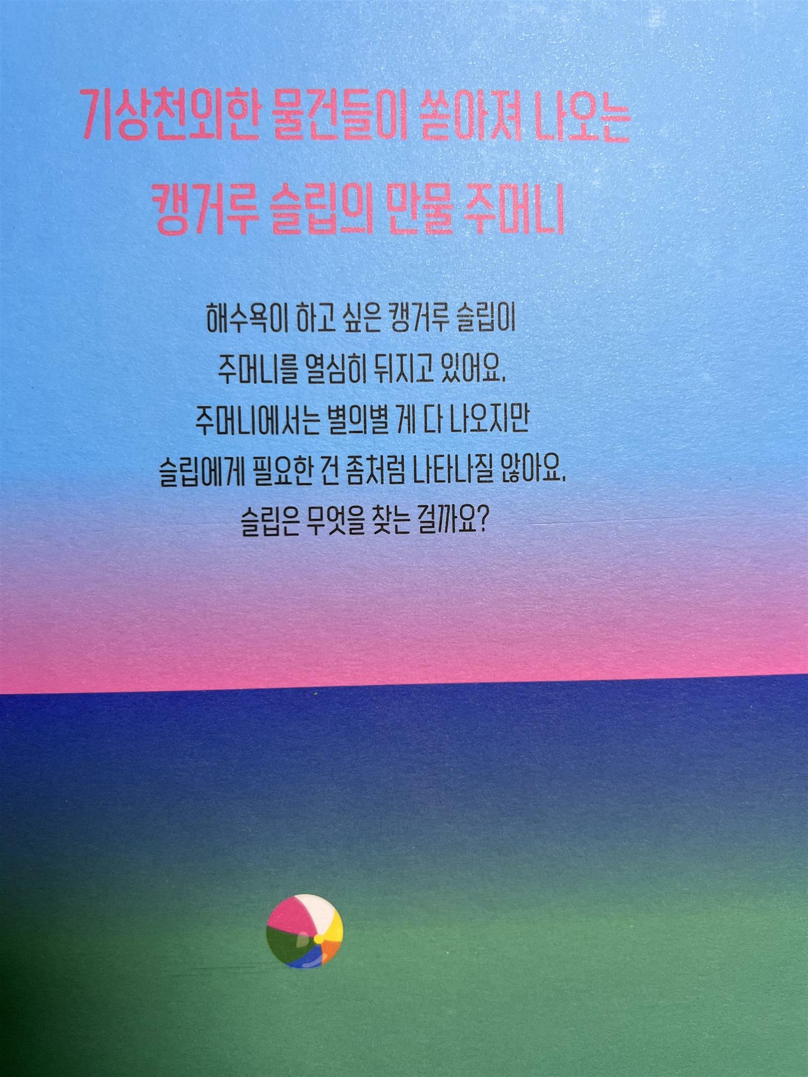 '슬립slip' 이라는 제목의 그림책을 보았습니다. 주인공 캥거루의 이름이 슬립입니다. 슬립이라는 이름에 걸맞는 캥거루 입니다. 뭔가를 까먹는 슬립은 자신의 주머니에서 무엇인가릉 열심히 찾기 시작합니다. 과연 무엇일까요? 슬립이 원하는 것은 단 하나입니다. 해수욕하기 입니다. 그런데 해수욕장에서 자신의 주머니에서 무엇인가를 찾고 있습니다. 친구들이 물어보아도 계속 찾고만 있습니다. 슬립이 주머니에서 빼서 던지는 물건 하나하나 보는 재미가 쏠쏠합니다. 그림체와 색감이 조금 독특한 책이라서 그런지 물건 하나하나가 더해질 때마다 보는 재미가 있습니다. 슬립이 무엇을 찾고 있는지 같이 고민하면서 열심히 찾게 됩니다. 내가 찾아주고 싶을 지경입니다. 책에서도 슬립의 친구 파지마가 다가오더니 다짜고짜 슬립을 거꾸로들고 흔들기 시작합니다. 못찾을 일은 없다며 묵묵히 슬립을 흔들어 댑니다. 온갖 잡동사니가 나오고 옆집 카멜레온까지 나옵니다. 슬립의 주머니의 바닥은 알 수 없습니다. 도라에몽의 주머니 같습니다. 단지 도라에몽은 원하는 것을 적절히 잘 찾아내지만 슬립은 원하는 것을 찾지 못합니다. 그림책을 넘길때마다 정말 궁금해집니다. 그리고 슬립은 이렇게까지 찾는 이유가 무엇일까? 라는 의문도 생깁니다. 아이들과 함께 본다면 그림 하나 하나 짚어가며 이야기를 많이 할 수 있을 것 같더라구요. 특히 색감이 독특해서 그림책을 보는 재미가 더할 것 같습니다. 슬립은 파자마에게 잠시 멈춰보라고 합니다. 그리고 마침내 원하는 것을 찾았습니다. 바로 바로 수영팬티입니다. 그토록 원하는 해수욕을 하러 달려갑니다. 하지만 수영팬티를 머리쓰고 있네요. 유쾌한 그림책 한 권을 보았습니다. 아이들과 슬립이 무엇을 찾는 걸까 이야기하면서 한 번 읽어보시길 추천합니다. 출판사로부터 도서를 제공받아 직접 읽고 작성한 리뷰입니다. #슬립 #창비 #책세상 #맘수다 #책세상맘수다카페
