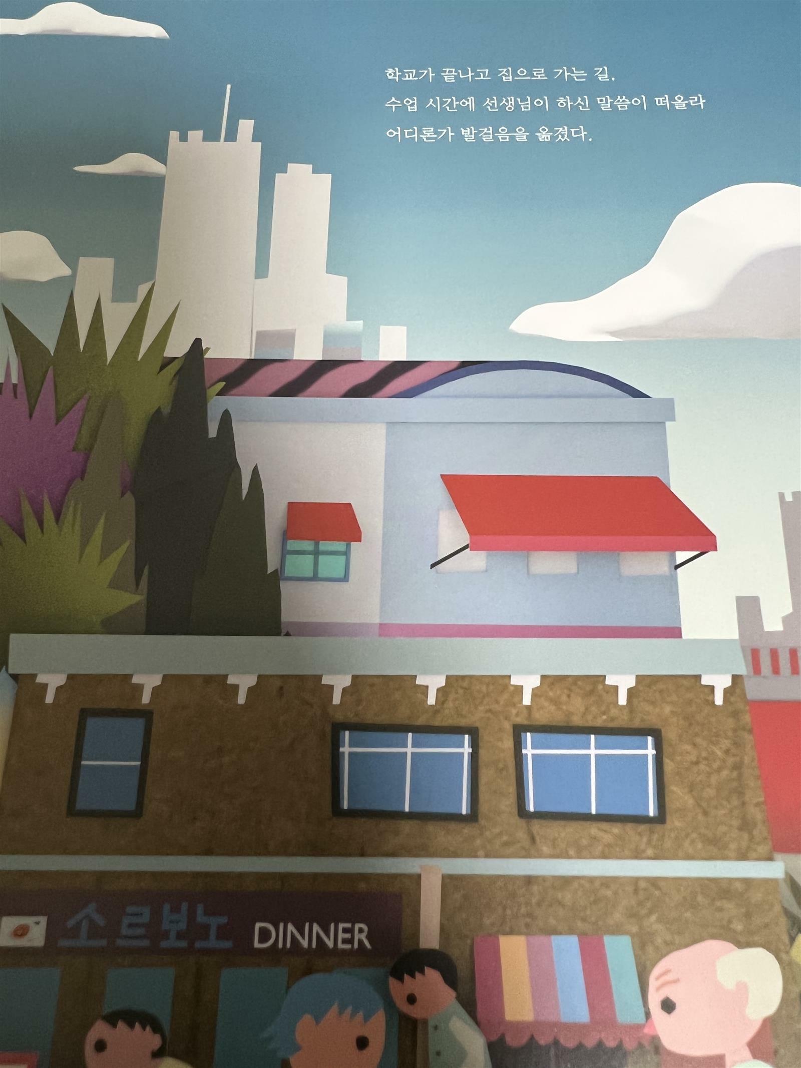 '당신의 빛' 이라는 그림책을 소개하려고 합니다. 처음으로 3D그래픽을 이요한 그림책입니다. 책의 제목에 있듯이 빛이라는 단어에 주목해 보면 좋을 것 같아요. 과연 어떤 책일까요? 그림책은 교실에서 중세시대 미술에 관한 수업이 시작되는 것으로 시작합니다. 선생님의 수업내용과 주인공의 생각이 맞물려가면서 세상에 빛이 나는 사람들에 대해 고찰해 나갑니다. 세상에 어떤 사람들이 살아가는지 다시한번 생각해보면서 빛을 따라가게 됩니다. 제일 마지막 작가의 말에서 처럼 작가는 이세상의 사람들 중에 돕고 배려하는 사람들에 대한 감사함을 표현하고 싶었던 것 같습니다. 세상에는 정말 많은 사건 사고가 일어납니다. 하루 아침에도 갑자기 무서운 사건이 일어나기도 하고 서로 불편함이 가득한 상황들을 뉴스에서 보기도 합니다. 하지만 좋은 일과 배려하는 사람들, 서로 돕는 이야기는 많이 보지 못합니다. 그런 사람들이 없는 것이 아니라 자극적인 것에 가려져 있는 것 같습니다. 우리는 감사해야 할 사람들에 대해서 생각하고 배워야 하는 것 같습니다. 그리고 나도 그런 한 사람이 되어서 도움이도고 베 푸는 사람이 되어야 하는 것 같습니다. 그렇게 한명 한명이 모이다 보면 세상에 빛나는 사람들로 가득 찰 것만 같습니다. 지금 당장 결과에 급급해서 내 이익만 생각하기보다는 남을 위해 돕고 사람을 베푸는 마음이 이세상을 밝히는 것 같습니다. 책에서도 선생님의 수업시간을 통해 직접적으로 우리가 나가야 할 방향을 언급하고 있습니다. 매일 무서운 일들이 벌어지고 있는 세상이지만 나부터 조금씩 변하고 마음을 먹는다면 조금 더 멋진 세상이 될 것 같습니다. 아이들과 읽어보면서 조금 심오하기도 했지만 그래픽의 효과로 집중하면서 잘 볼 수 있었습니다. 출판사로부터 도서를 제공받아 직접 읽고 작성한 리뷰입니다. #당신의빛 #강경수 #모든요일그림책 #책세상 #맘수다 #책세상맘수다카페