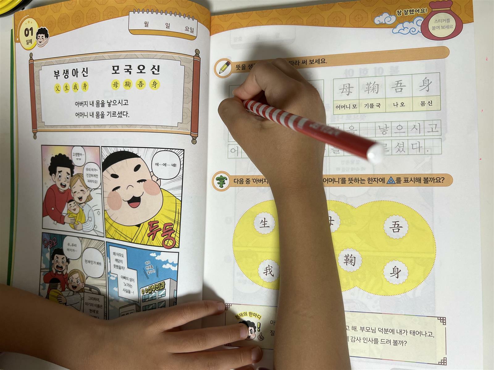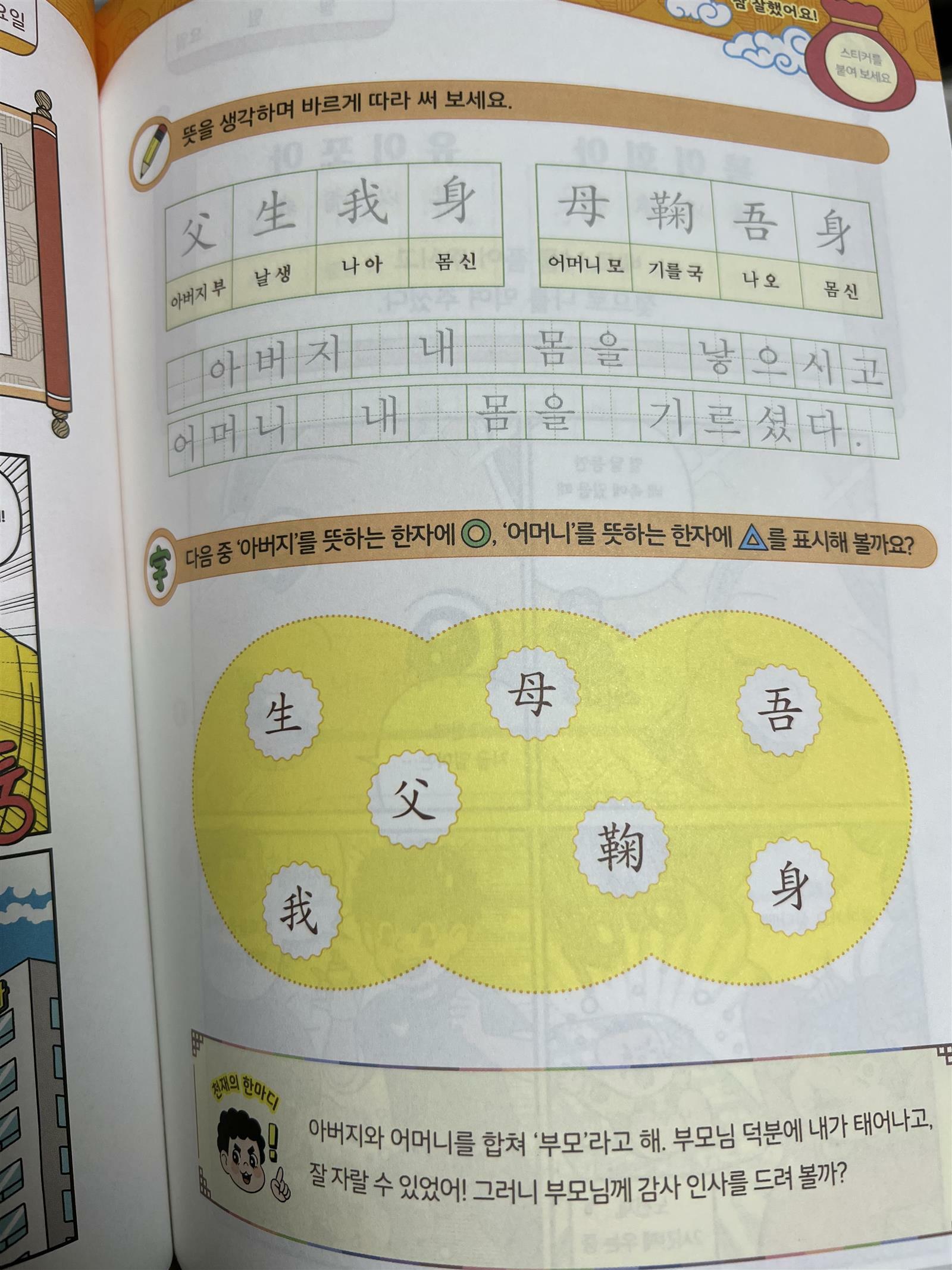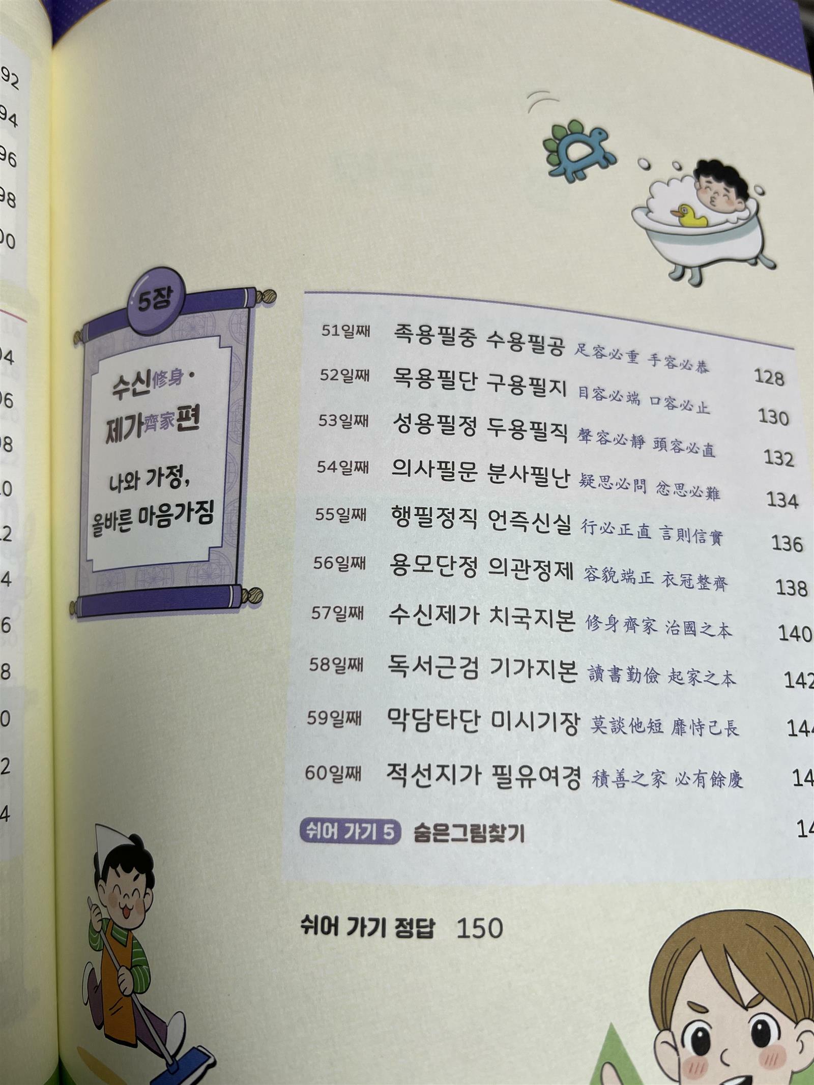 사자소학을 재미있게 익혀 볼 수 있는 책을 소개하고자 합니다. '사자소학 천재되기' 라는 책인데 60일 만에 완성한다는 것이 참 마음에 듭니다. 이 책을 보면서 어릴적 아침 자습시간마다 사자소학을 적었던 기억이 났습니다. 선생님의 강제성이 있긴 했지만 열심히 적었던 기억이 도움이 많이 되었습니다. 한자를 일부러 배우지 않는 이상 익히기가 쉽지 않습니다. 하지만 한자는 꼭 익혀야 한다고 생각합니다. 단순하게 하루에 한자 한개씩 익혀 볼 수도 있지만 사자소학을 배운다면 그 뜻도 생각하며 깊이 새겨 볼 수 있어서 더 좋은 것 같습니다. 그리고 무엇보다 이해하며 내용을 알고 넘어가는 것이라서ㅠ기억에도 훨씬 잘 남아 있을 거란 생각이 듭니다. 이 책은 하루에 딱 한장을 하면 60일동안 완성 할 수 있는 교재입니다. 요즘 아이들 워크지, 학습지 참 많이 하는데 사자소학까지 하려면 힘들기도 할 것 같습니다. 하지만 완벽하게 외워야 한다는 생각을 갖지 말고 하루에 한장 즐겁게 해 본다면 어느새 한층 성장한 아이가 되어 있을 것입니다. 책을 살펴보면 주제별로 잘 정리되어 있습니다. 목차를 한 본 보면서 어떤 내용인지 한 눈에 볼 수 있습니다. 글자도 큼직하고 만화도 있어서 아이들이 꾸준히 흥미를 잃지 않고 해 나갈 수 있습니다. 어른이 보기에는 만화가 큰 영향이 없을 것 같지만 아이들은 만화 한컷도 참 재미있게 보더라구요. 쓰는 부분도 많지 않습니다. 저희 아이도 쓰는 것을 참 싫어하는데 이 부분이 아이에게 한 번 해 볼 만 한 것이라는 인상을 줄 것 같았습니다. 한 번 정도 써보면서 뜻도 생각해보고 간단한 문제도 풀다보면 금방 할 수 있을 것 같습니다. 중간 중간에 쉬어가기 코너가 있어서 아이들이 잠시 쉬면서 재미있게 문제 풀이를 해 볼 수 있습니다. 정답도 뒷부분에 잘 정리되어 있고 하루 한장씩 하고 스티커 붙이기까지 아이들의 마음을 잘 헤아리는 교재인 것 같아 좋았습니다. 60일동안 꾸준히 아이들과 사자소학 해보시길 추천합니다. 출판사로부터 도서를 제공받아 직접 읽고 작성한 리뷰입니다. #사자소학천재되기 #다락원 #책세상 #맘수다 #책세상맘수다카페