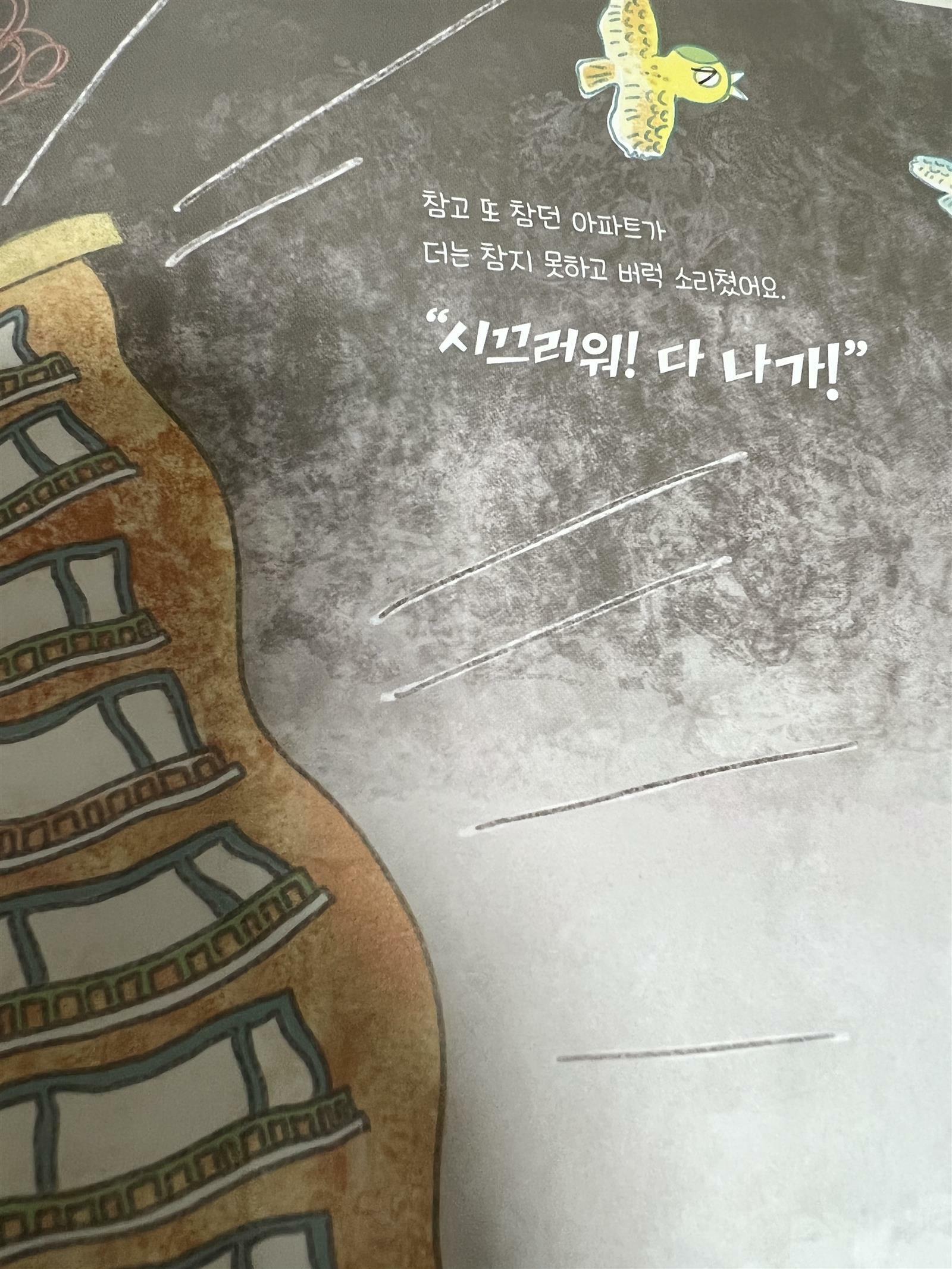 다림 출판사에서 나온 '버럭 아파트'라는 그림책을 읽어 보았습니다. 제목과 그림을 보면 어떤 이야기인지 짐작이 갑니다. 우리집 아이들에게 필요한 이야기라는 생각이 들어서 아이들과 함께 읽어보았습니다. 요즘 아파트에 사는 인구가 많기 때문에 이웃간에 불필요한 언쟁도 많습니다. 특히 아이들이 있는 집은 소음을 많이 내기 때문에 불편해하는 경우가 많습니다. 저희집도 예외는 아닙니다. 아이들이 시간만 나면 뛰어다니고 소리치고 조용할 틈이 없습니다. 아마도 다른 집도 다들 같은 고민이 있을 거라는 생각이 듭니다. 책을 한 번 살펴보면 예상과는 조금 다르게 아파트가 버럭 화를 내는 상황이 펼쳐집니다. 아파트에 사는 사람들이 제각각 자신만 생각하고 엄청난 소음을 발생시킵니다. 아파트는 이런 사람들때문에 잠을 못자서 너무 괴롭니다. 결국 참지 못하고 버럭 화를 내고 말지요. 아파트에 살던 사람들은 모두 밖으로 내쫓기듯 나오게 되고 아파트는 정문을 철컹 잠궈버립니다. 아파트오 들어가지 못하는 사람들은 발만 동동 구르며 어떻게 해야 할 지 몰라서 어링둥절합니다. 그리고 배도 고파옵니다. 이쪽 저쪽에서 꼬르륵 소리가 나고 힘든 상황이 오게 되지요. 사람들은 이러한 위기를 어땋게 극복해 낼까요? 어디선가 나타난 피자트럭의 냄새를 맡고 서로 피자를 사서 나누게 됩니다. 피자 한조각으로 나누는 훈훈함과 사랑으로 서로 시끄럽게 했던 일들을 사과합니다. 아파트의 버럭 한 마디에 고생을 좀 했지만 피자를 나누며 서로 사과하며 상대방에 대한 배려를 배우게 됩니다. 어떻게 보면 단순한 이야기 이지만 이를 통해 간접적으로 아이들이 층간소음을 생각해 볼 수 있는 책입니다. 나 혼자 시끄러운 것이 아니라 모두에게 피해가 간다는 것을 알고 배려한다면 아파트도 더이상 버럭 할 일은 없을 것 같습니다. 출판사를 통해 도서를 제공받아 직접 읽고 작성한 리뷰입니다. #버럭아파트 #다림 #책세상 #맘수다 #책세상맘수다카페