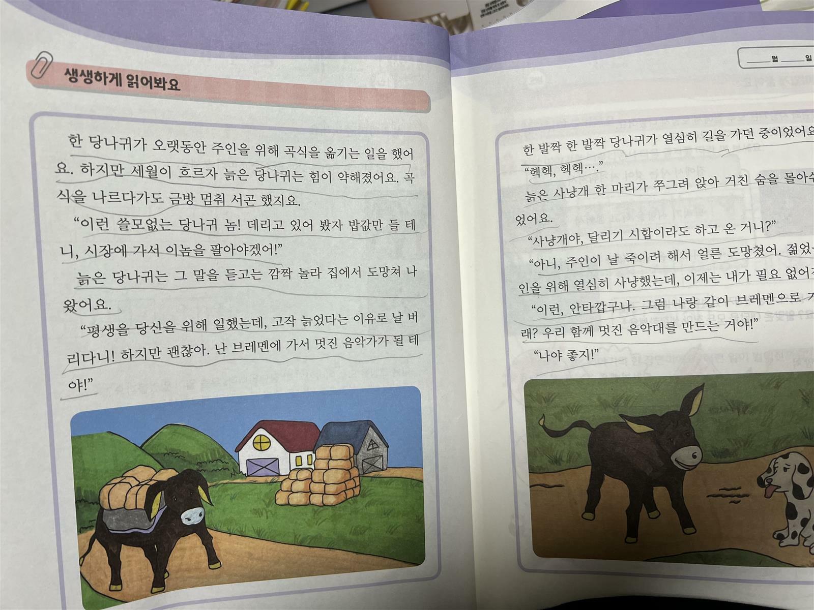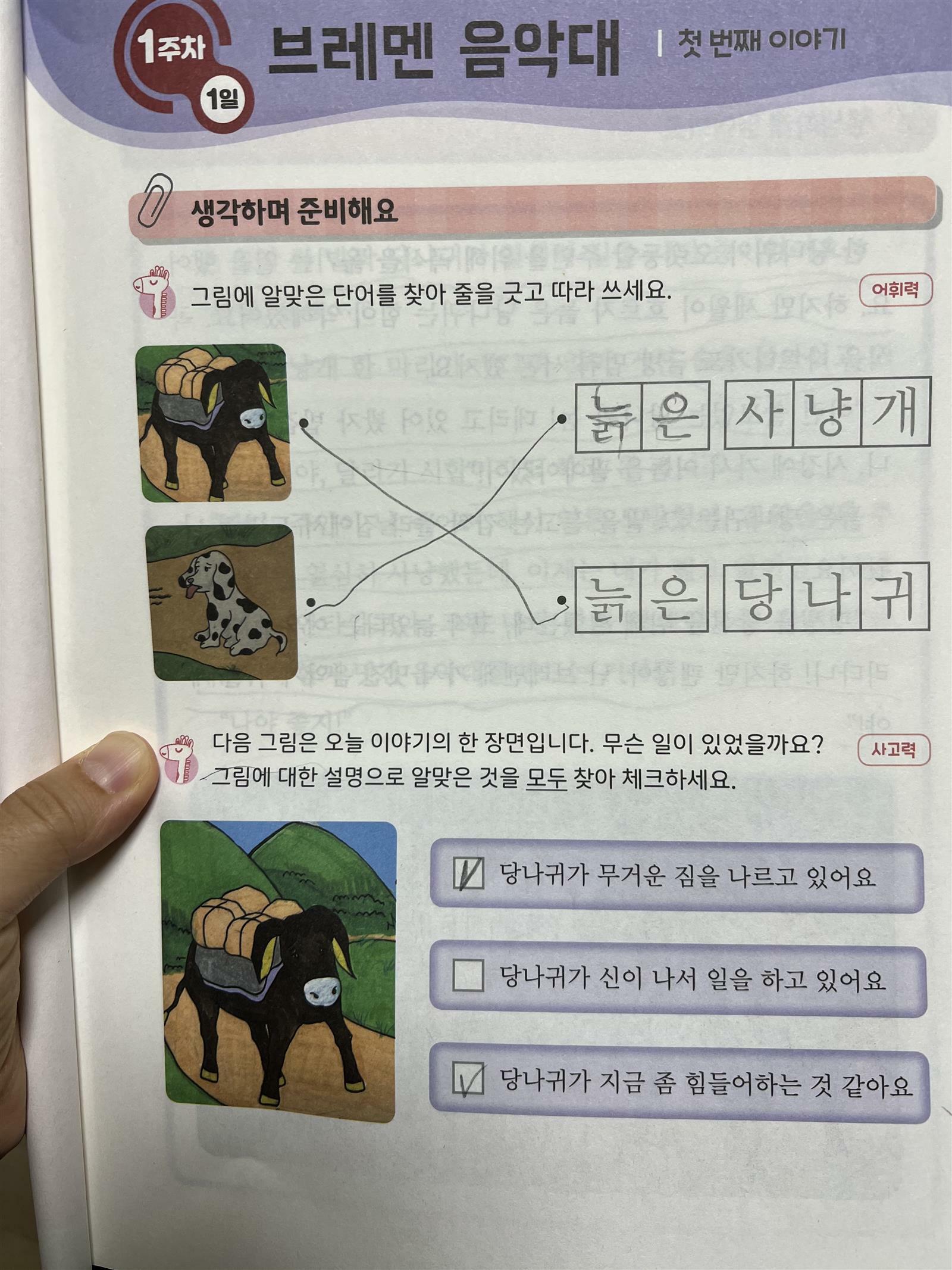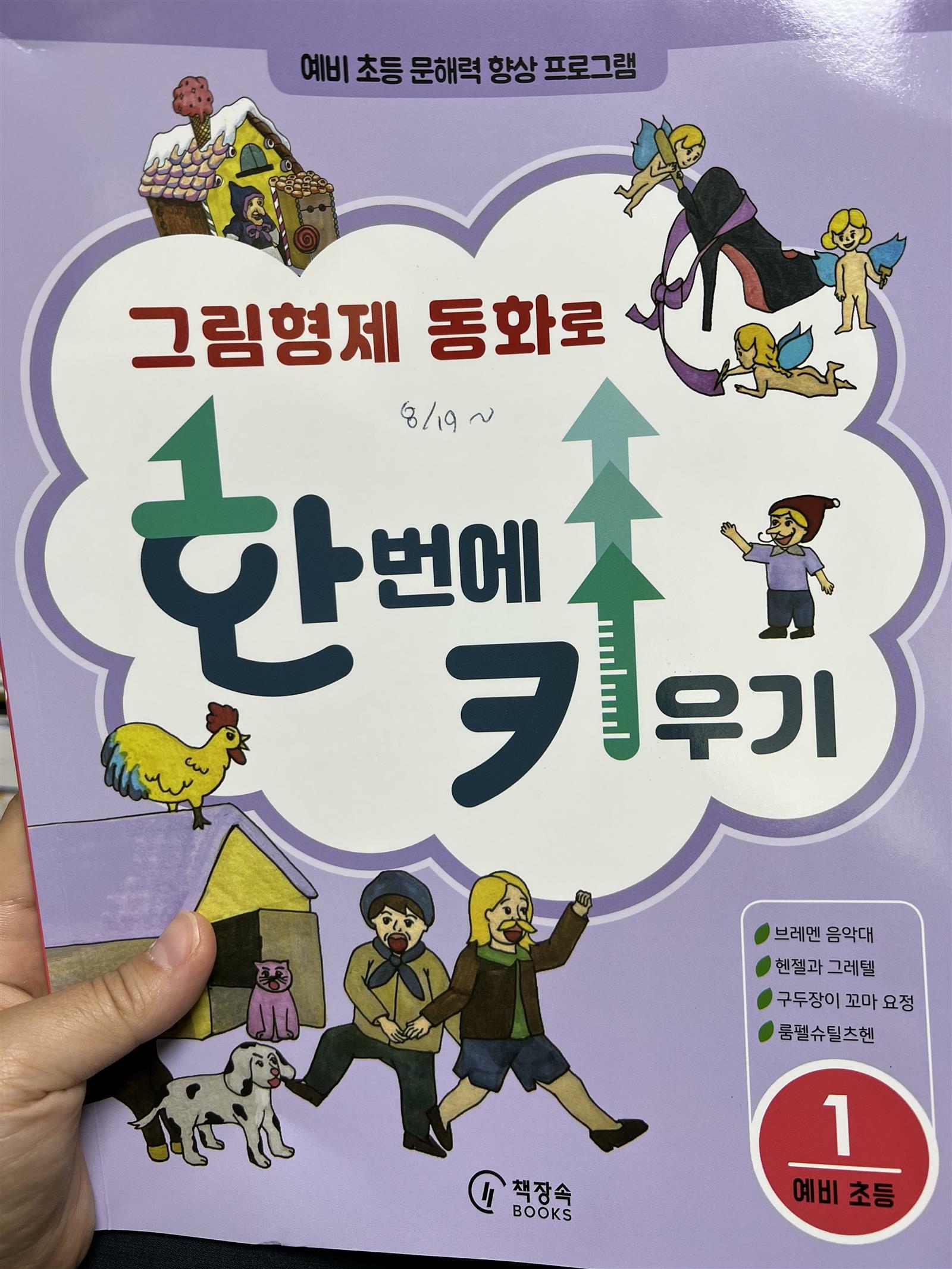 '그림형제 동화로 한번에 키우기' 독해 문제집을 풀어 보았습니다. 예비초등을 위해서 나온 교재라서 그런지 글밥도 많지 않고 글자크기도 제법 커서 좋았습니다. 등원전에 아이와 함께 풀어보았는데 이야기가 재미있어서 그런지 한번에 2일까지 풀었어요.