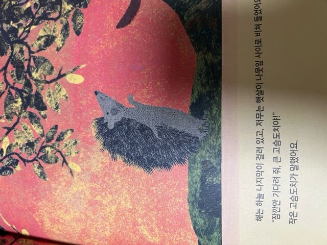 큰 고슴도치는 아마도 우리 부모들의 모습을 닮아 있습니다. 자연의 다양한 것들은 눈에들어오지 않고 오로지 지금 해야 할 일에 충실합니다. 어서 집에 가야 하는 것만 머릿속에 가득 차 있습니다. 큰 고슴도치는 어두워지니깐 작은 고슴도치를 데리고 집으로 가고 싶습니다.