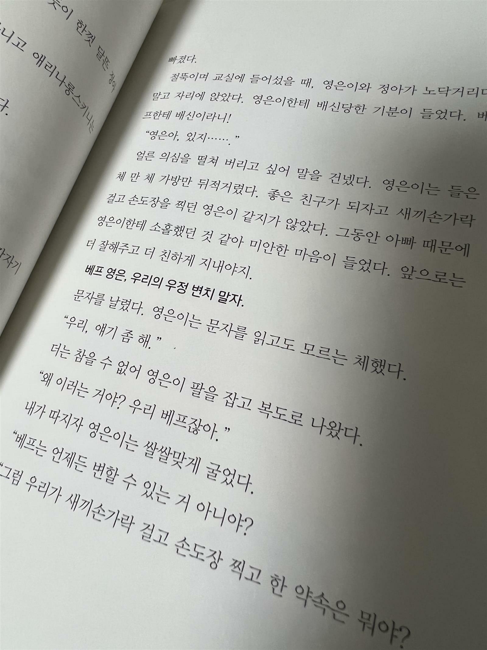 글의 큰 틀은 아빠의 가출로 시작되지만 그 안에서 주인공이 학교에서의 친구들 관계도 에피소드로 조금씩 나옵니다. 그 과정에서 주인공은 성장하며 많은 생각을 하게 되는 것 같습니다.