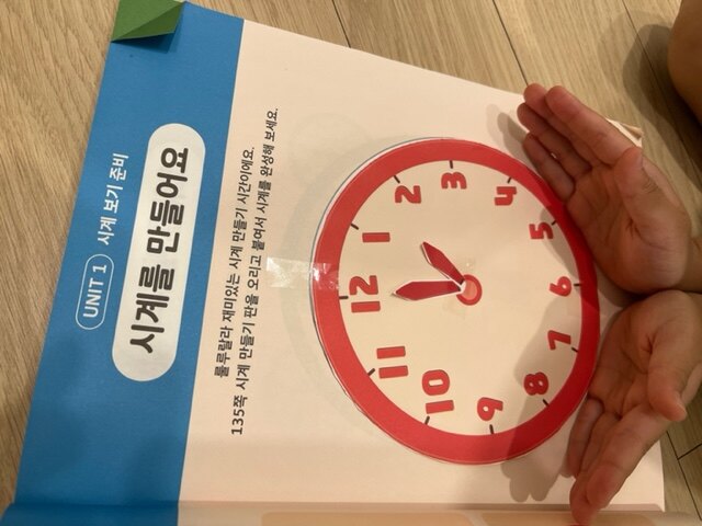 시계에 쓰이는 숫자들부터 배워보고, 시계의 긴바늘과 짧은 바늘을 익힙니다. 시계에 대한 형태를 직관적으로 보고 인식할 수 있는 교재입니다. 아이들에게 꼭 필요한 것들만 쏙쏙 뽑아서 만들어진 것 같다는 생각이 들었어요.