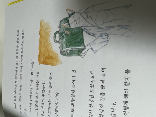 전화를 받은 로베르트는 오토바이를 타고 유나네 집으로 달려옵니다. 그런데 세상에나 고양이 인 것입니다. 흰 가운을 입고 정말 의사처럼 행동하고 말을 하는 고양이 인것입니다.