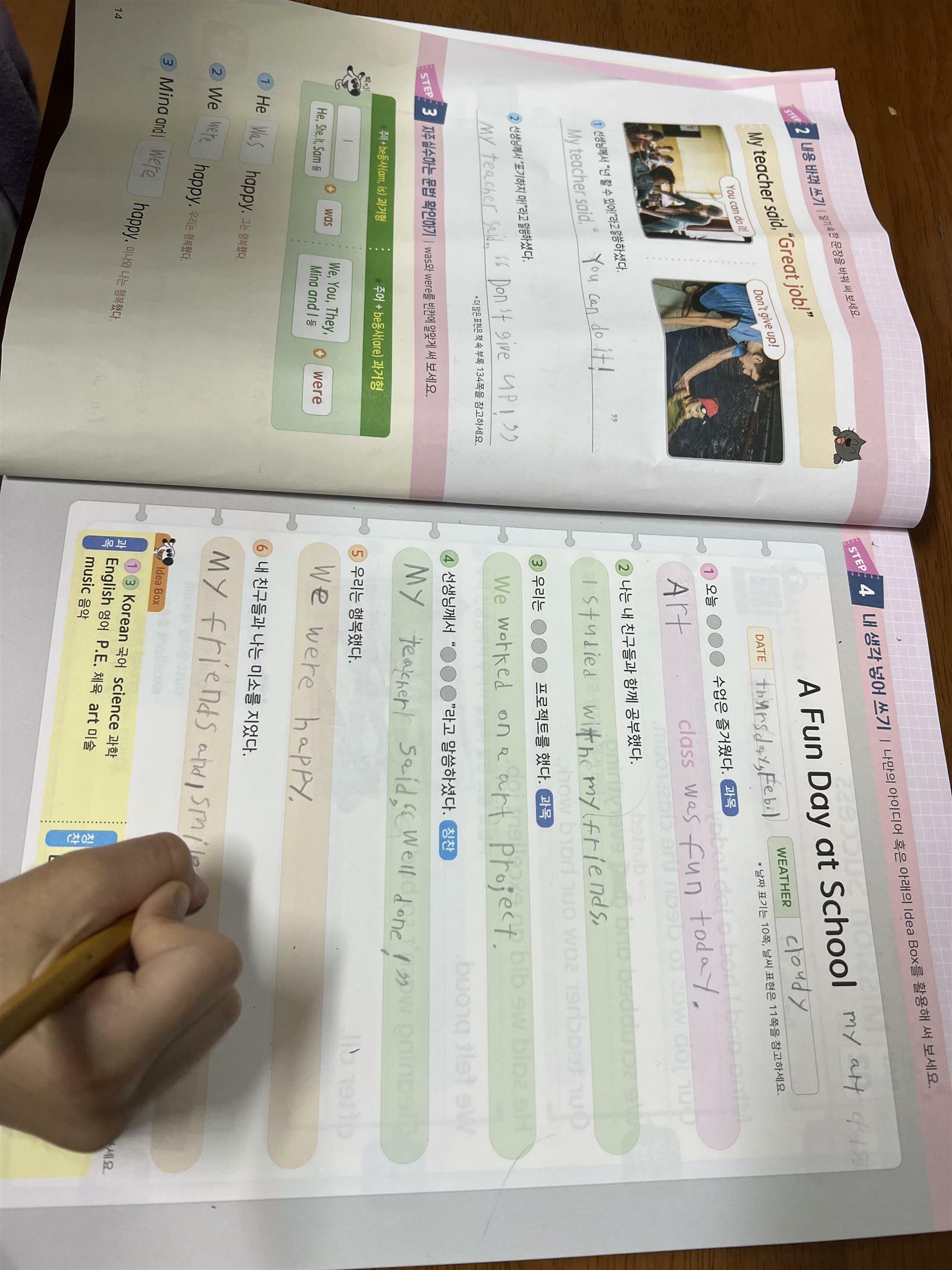 '바빠 초등 영어 일기 쓰기' 교재를 아이와 해보았습니다. 이 책은 평소에 즐겨 보는 효린파파 님이 저자입니다. EBS대표 영어 강사이신 효린파파 님은 활발하게 sns를 운영하시고 영어강사로서 많은 영어팁도 알려주시는 분입니다. 이 번에 영어일기 교재가 출간 되었다고해서 기대를 많이 했는데 아이와 직접 풀어보며 도움이 될 것 같다는 생각을 했습니다. 아이와 영어 쓰기를 엄마표로 한다는 것이 참 어렵습니다. 리딩이나 듣기는 다른 매체를 이용하기 쉬운데 쓰기는 엄마가 가장 부담을 느끼는 영역입니다. 그런데 이 책은 영어 일기라는 구조를 가지고 영어 쓰기를 시작하기 좋은 책이라고 생각합니다. 바빠시리즈의 특징에 맞게 하루에 4쪽을 공부하면서 매일 차근차근 실력을 쌓아 올릴 수 있는 교재입니다. 매일 교재를 공부하기 조금 부담 스럽다면 아이와 일주일에 세번 정도 해보자고 약속을 하고 시작해도 좋을 것 같습니다. 4쪽이 적은 양이지만 그 안에서 배울 수 있는 영어 표현이 참 알차다고 생각했습니다. 일단 예시 일기문이 제시되어 있고, 일기를 읽고 써보면서 익힐 수 있는 구조로 되어 있습니다. 큐알 코드를 통해 들어 볼 수도 있어서 영어의 모든 영역을 책 한 권을 통해 공부 할 수 있습니다. 뒷 장을 넘겨보면 내 이야기로 바꿔 가면서 새롭게 일기를 써볼 수 있습니다. 앞 장에서 써 본 일기를 토대로 바꾸면 되는 것이라 많이 어렵지 않습니다. 글자 크기도 큼직한 점이 더 마음에 들었습니다. 아지구글씨를 작게 쓰는 것을 어려워하는 저희 아이의 경우도 크게 쓰는 부분이라 거부감이 덜 하더라구요. 그리고 새로운 영어 표현들도 한 번씩 익히면서 써 볼 수 있습니다. 한가지 표현만 배우는 것이 아니라 다양하게 적용해 볼 수 있도록 알려주는 부분이라서 아이와 새로운 표현을 일기 하나로 많이 익힐 수 있습니다. 이 책의 큰 장점은 부록이 참 좋다는 것입니다. 한번 다 풀어도 이 부록은 따로 챙겨두면 좋을 것 같습니다. 영어 일기에 자신감이 붙고나면 부록만 가지고 다니면서 내가 표현하고 있는 것들을 찾아 보면 좋을 것 같더라구요. 내가 이야기하고 싶은 부분을 영어로 다양하게 표현하도록 도와주는 부록이라서 실질적으로 많은 도움이 되는 것 같습니다. 꾸준히 이 교재를 시작으로 영어일기를 써 본다면 많은 도움이 될 것 같아서 초등학생들에게 추천합니다. 출판사를 통해 교재를 제공받아 직접 읽고 작성한 리뷰입니다. #책세상 #맘수다 #책세상맘수다카페 #영어일기 #영어일기쓰기 #영어글쓰기 # 초등영작 #교과서영어문장 #바빠영어 #초3영어 #초4영어 #초5영어 #초6영어 #바쁜초등영어 #빠른초등영어 #바쁜초등학생 #바빠초등영어 #기초영작교재 #초등영어문장 #초등영어문장핵심패턴 #초등영어 #바빠시리즈 #이지스에듀