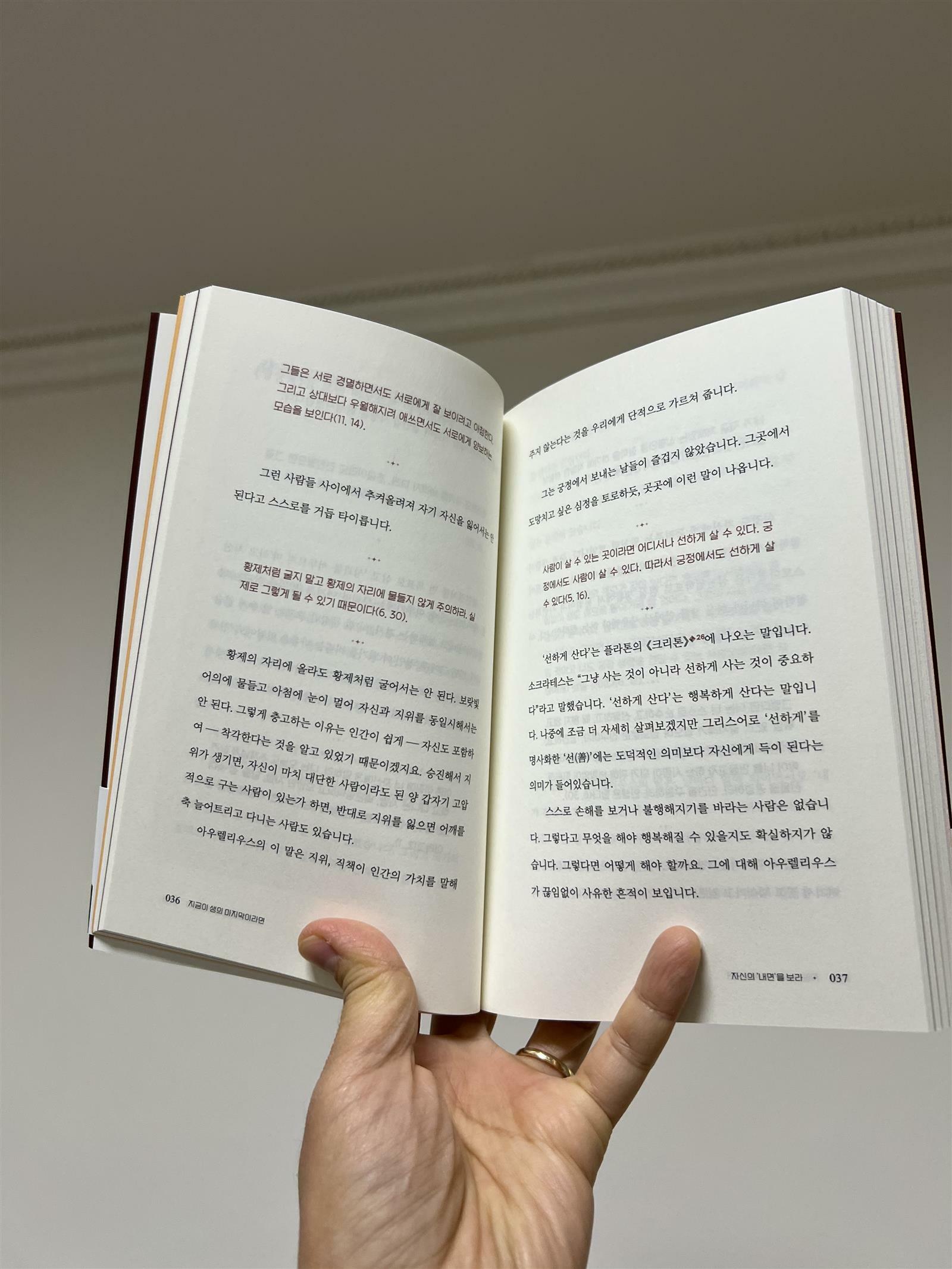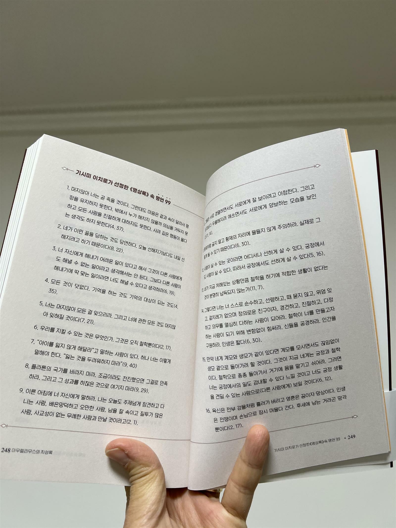 '지금이 생의 마지막이라면' 기시미 이치로 작가의 책을 읽어 보았습니다. 기시미 이치로 작가의 책을 예전부터 잘 보았던 터라 이번 신간 책에 대한 기대가 많이 있었습니다. 이 책은 아우렐리우스의 '명상록'을 읽으면서 작가 나름의 해석을 덧붙인 책입니다. 명상록을 읽어보신 분이라면 더욱 반가우실 것 같습니다. 저는 명상록을 읽어 보진 않았지만 이 책을 보면서 명상록을 조금 알 것 같더라구요. 작가의 해석과 더불어 명상록을 발췌한 부분이 많아서 따로 명상록을 보기 전에 이 책을 보아도 좋을 것 같습니다. 아들러 심리학자인 기시미 이치로 작가는 확실히 자신의 지식와 결부시켜서 명상록을 바라보았습니다. 그리고 의외로 명상록에 나타난 아우렐리우스의 철학적인 생각들이 아들러 심리학과 유사함을 찾아 볼 수 있습니다. 지금 현재를 중요하게 생각하고 현재를 살아가야 한다는 메세지가 비슷 한 것 같습니다. 아울렐리우스는 자식들과 부인이 갑자기 죽는 일을 많이 겪었다고 합니다. 그리고 늘 전장에서 싸우는 중이었습니다. 그런 상황에서 이러한 명상록을 적으며 자신을 가다듬고 생각을 정리해 왔던 것 같습니다. 그리고 작가도 어머니가 병상에 누워 계셨을 때와 자신이 아팠던 경험을 통해 죽음에 대한 많은 생각을 했던 것 같습니다. 책의 마지막 챕터는 죽음에 대한 아우렐리우스의 생각과 아들러 심리학적인 관점에서 보는 죽음을 마주해 볼 수 있습니다. 철학과 심리학이 이렇게 만날 수 있다는 사실이 새롭고 재미있다는 것을 알게 되었습니다. '지금이 생의 마지막이라면' 이란 책을 통해 현재 내가 살아내고 있는 이 삶을 돌아보며 나만의 철학적인 사고를 해보면 좋을 것 같다는 생각이 들었습니다. 깊은 통찰력을 옆 볼 수 있었던 시간이었습니다. 출판사로부터 도서를 제공받아 직접 읽고 작성한 리뷰입니다. #지금이생의마지막이라면 #기시미이치로 #아우렐리우스 #영진닷컴 #컬처블룸 #컬처블룸리뷰단