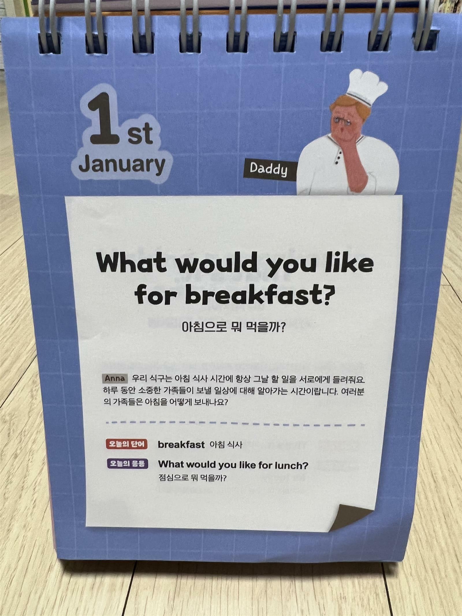 '옥스퍼드 영어습관365' 일력을 아이와 함께 보았습니다. 초등아이들과 함께 보면 좋을만한 일력입니다. 영어라는 과목이 초등부터 시작이라서 미리 미리 영어와 친해져야 하는 것 같습니다. 저희 아이도 초등저학년이라서 이제 영어 습관을 길들여야 할 때입니다. 때마침 조지은 교수의 영어습관 365 일력을 만나서 다행이라 생각합니다. 첫 장을 넘겨보면 등장인물에 대한 간단한 소개가 나옵니다. 매일 한 문장씩 보는데 그에 대한 상황 설명을 등장인물을 통해 알려주기에 등장인물이 나름 중요합니다. 어떤 인물인지 이해하고 상황을 살펴보면 더 쉽게 받아들이게 될 수 있습니다. 1월 1일 표현을 살펴보고 아이와 함께 읽어보았습니다. 어렵지 않은 표현이라서 금방 익숙해 질 것 같더라구요. 무엇보다 실생활에서 사용해 볼 수 있는 표현들이라 잊지 않고 자주 사용하는 것이 좋을 것 같습니다. 한 페이지에 한 문장만 있는 것이 아니라 응용해 볼 수 있는 표현도 함께 있어서 더욱 유용합니다. 똑같은 상황이 아니더라도 응용을 보고 내 상황에 맞게 표현해 볼 수도 있습니다. 다른 교재 필요없이 일력하나로 매일 영어 표현을 익혀 볼 수 있다는 것이 좋은 것 같습니다. 일주일 표현을 익히고 나면 리뷰페이지가 나옵니다. 한 주간 공부한 내용을 리뷰하면서 다시 한 번 상기시켜야 기억에 오래 오래 남을 것 같습니다. 아이들과 원하는 표현을 하나씩 찾아보며 익혀도 좋을 것 같습니다. 이야기가 이어지는 것은 아니라서 그날 그날 새로운 것을 찾아 보아도 좋긴 합니다. 아이의 성향에 따라 엄마와 함께 살펴보면 도움이 많이 될 것 같아요. 그리고 옥스포드리딩트리 책과도 연계된다고 하니 더욱 반갑더라구요. 아이와 ort를 도서관에서 자주 대여해서 보는데 일력과 함께 보면 좋을 것 같습니다. 출판사로부터 도서를 제공받아 직접 읽고 작성한 리뷰입니다. #옥스퍼드영어습관365 #쌤앤파커스 #조지은교수 #책세상 #맘수다 #책세상맘수다카페