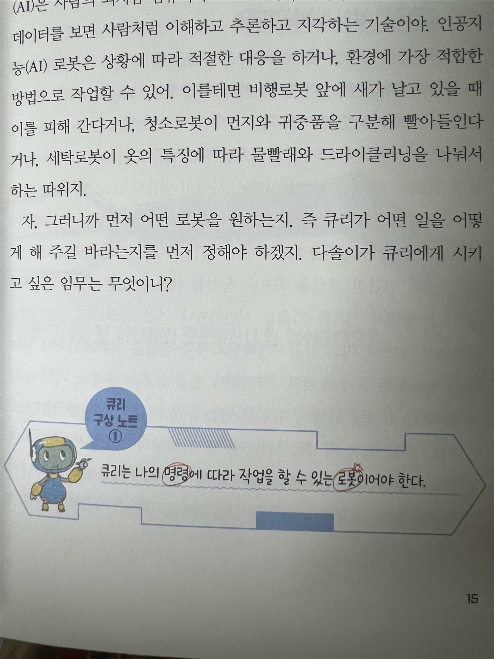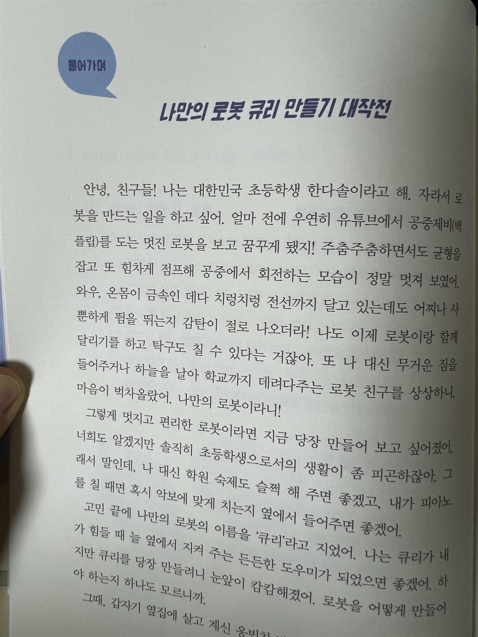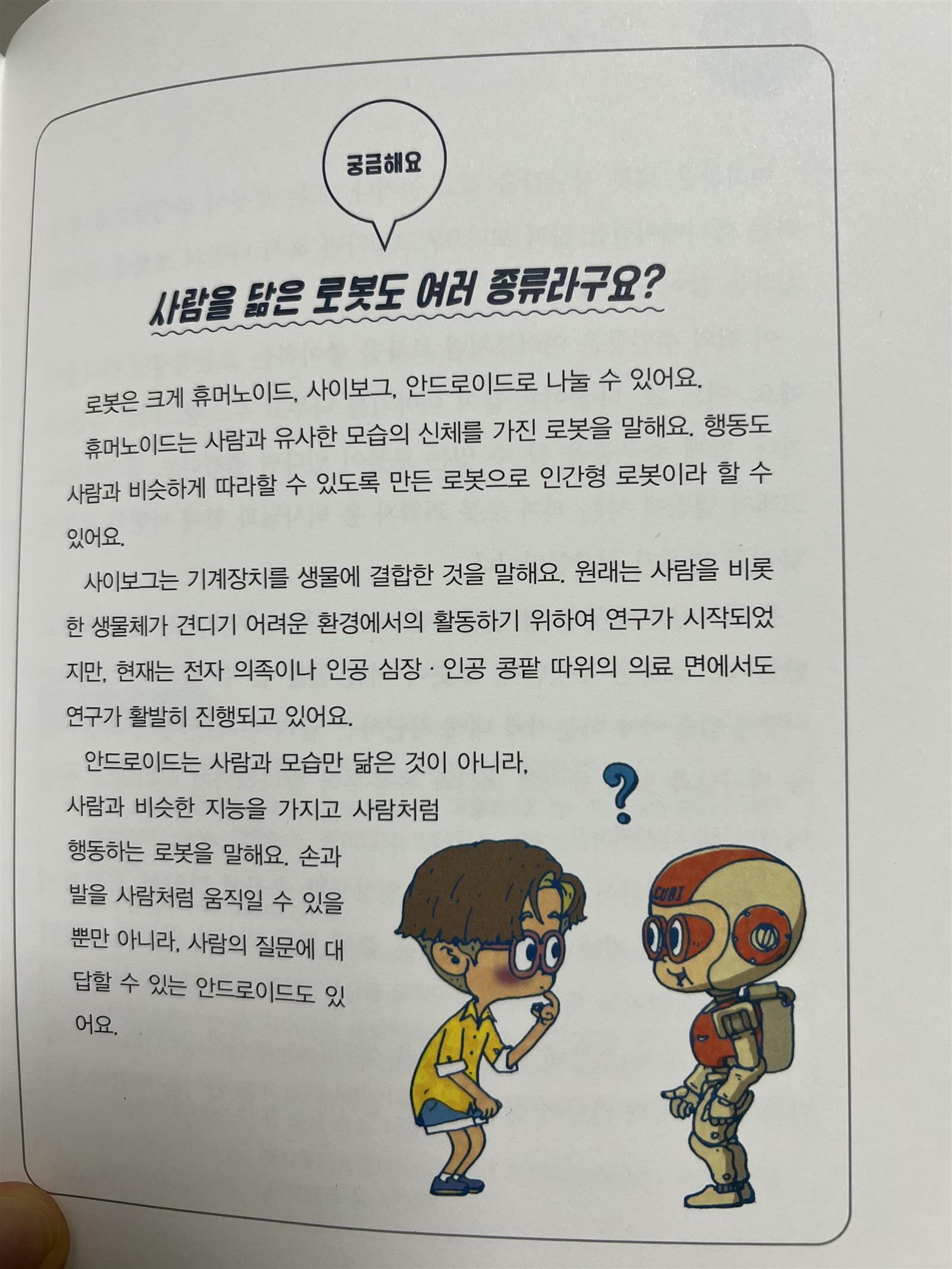 '로봇 큐리는 내 베프' 책을 읽어 보았습니다. 산하 출판사의 내 곁의 최신과학1권 시리즈 입니다. 이 번 책은 로봇에 관한 모든 이야기를 담고 있다고 해도 과언이 아닙니다. 책 내용은 로봇에 대한 정보를 나열하기만 한 것이 아니라 주인공이 로봇을 만들기 위해 준비하는 과정을 따라가는 이야기 입니다. 나만의 로봇 큐리를 만들기 위해 박사님을 찾아가서 로봇에 관한 질문과 답을 통해 알아가는 것이지요. 한 챕터가 끝날 때마다 주인공이 정리한 로봇에 관한 한 줄 정리가 참 도움이 되는 것 같습니다. 아이들 시선에 맞춰서 궁금한 내용을 읽어나가다 보니 어느새 로봇에 대한 많은 지식을 얻게 되는 책입니다. 얼마 전에 저희 아이가 로봇에 관한 책을 재미있게 보더라구요. 그래서 이 책도 보여주려고 합니다. 같은 주제이지만 다양한 책을 통해 부족한 지식을 채워나가는 재미가 있는 것 같습니다. '로봇 큐리는 내 베프' 책은 지식과 이야기 둘 다 다루고 있어서 평소에 지식책을 좋아하지 않아도 주인공의 질문을 따라가다보면 동기부여가 되어서 읽어 나가기 좀 더 수월 할 것 같아요. 나도 나만의 로봇을 만들어 보고싶다는 생각을 가지고 읽어가면 더 재미있을 것 같네요. 우리 아이들의 미래에는 로봇과 함께 생활하는 시대가 올 것은 분명합니다. 로봇에 대해 알고 이해하고 있어야 한다는 것이겠지요. 로봇과 친하게 지내면서 로봇을 잘 활용하길 바라는 마음에 이 책을 읽게 되었습니다. 책 내용이 간결하게 잘 정리되어 있고, 그림과 사진도 많은 편이라서 초등학생 아이들이 이해하기에 쉬운 것 같아요. 초등학생이라면 읽어보길 추천합니다. 엄마도 함께 읽고 이야기 나눠보아도 좋을 것 같습니다. 출판사로부터 도서를 제공받아 직접 읽고 작성한 리뷰입니다. #로봇큐리는내베프 #산하 #책세상 #맘수다 #책세상맘수다카페