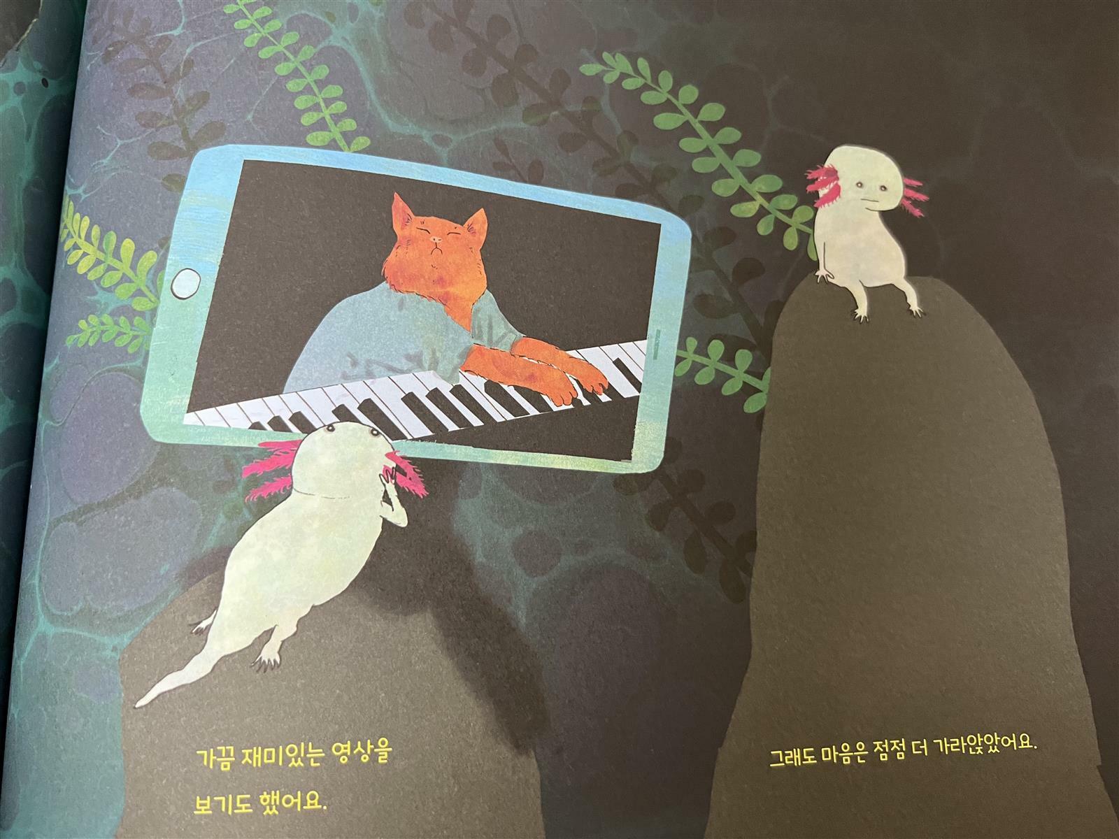 '외로운 아홀로틀 이야기' 그림책을 읽어 보았습니다. 아홀로틀이 무엇인지 아시나요? 검색해 보니 점박이도롱뇽과의 양서류입니다. '우파우파', '멕시코도롱뇽'으로 불리는데 포켓몬스터 캐릭터 중 '우파'의 모델이라고 하네요. 요즘 아이들이 포켓몬스터 참 좋아하는데 이 책이 관련이 있어서 아이들의 관심을 받을 것 같다는 생각이 듭니다. 아무래도 조금이라도 익숙한 캐릭터니까 책에 흥미를 느낄 수 있을 것 같아요. 책 장을 하나 하나 넘겨보는데 일단 그림 색채가 눈에 들어옵니다. 글밥이 많지 않지만 그림을 천천히 보면서 이야기 나눌 거리가 많더라구요. 책의 시작은 지구의 탄생부터 시작합니다. 그리고 현재 우리가 사는 지구를 잘 비유해서 표현하고 있습니다. 아홀로틀의 시선에서 바라보는 이 지구의 모습과 변화를 보면서 많은 것을 느낄 수 있습니다. 아홀로틀은 인간을 두발로 걸어다니는 바보라고 표현합니다. 바보들이 지구에 점점 많아지고, 호수에 함께 살던 친구들은 점점 떠납니다. 그러던 어느날 물은 흐려지고 세상은 따뜻해집니다. 갑자기 나타난 파도가 아홀로틀을 내동댕이쳐서 호수 밖으로 던져 놓습니다. 이제 세상에 하나 뿐이었던 아홀로틀은 어떻게 살아가게 될까요? 우리가 살고 있는 이 지구를 조금은 객관적으로 바라보면서 동일시하게 되는 그림책입니다. 누군가 우리를 바라보고 있는 이야기 혹은 우리가 아홀로틀의 입장에서 바라보는 세상과 비슷한 것 같습니다. 작가는 우리의 삶은 그래도 희망은 있다고 말해주는 것 같습니다. 지금은 멸종위기인 아홀로틀이지만 재생능력이 뛰어나기도 한 아홀로틀을 통해 생명의 소중함과 위대함을 보여주는 그림책입니아이들과 천천히 읽어 가면서 아홀로틀에 대해서도 이야기하고 환경오염에 대해 고민해 보면 좋을 것 같네요. 출판사를 통해 도서를 제공받아 직접 읽고 작성한 리뷰입니다. #외로운아홀로틀이야기 #어린이작가정신 #책세상 #맘수다 #책세상맘수다카페