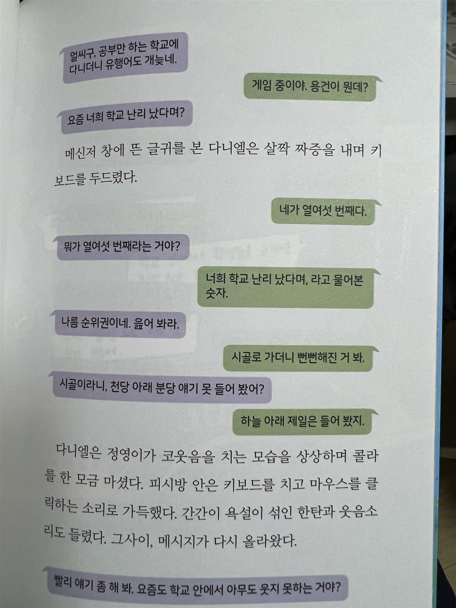 바우솔 문고의 ' 아무도 웃지 않는 학교' 책을 읽어 보았습니다. 제목에서부터 궁금증이 생기는 책입니다. 왜 학교에서 아무도 웃지 않는 것일까요? 이 문제로 인하여 학교 선생님들의 모임이 결성됩니다. 회의를 해도 이유를 찾지 못하는 답답한 상황입니다. 급기야 교장 선생님께서는 웃기는 사람이나 먼저 웃는 아이에게 상금을 준다고 합니다. 과연 누가 먼저 웃게 될까요? 주인공 다니엘은 웃지 않는 학교 아이들 사이에서 뭔가 수상한 아이를 발견합니다. 얼마전 전학온 대진이가 운동장에서 춤을 추며 웃고 있는 것입니다. 대진이는 전학을 왔기 때문에 상금을 받을 수는 없다고 합니다. 그래도 열심히 명랑권을 아이들에게 알려주며 웃을비법을 알리고 있는 아이입니다. 단 웃음권을 하면서 방귀를 뀌면 안된다고 합니다. 이러한 디테일한 이야기들 사이에 아이들이 좋아 할 만한 요서가 곳곳에 숨어 있습니다. 왜지? 라는 의분을 품고 계속 읽어 나가고 싶은 책입니다. 글밥은 조금 많은 편이라서 저학년보다는 중학년이 읽기에 좋은 책입니다. 대진이는 과연 아이들에게 웃음 비법을 전수 할 수 있을까요? 대진이를 따라 비법을 배우는 아이들이 늘어가던 어느 날 대진이가 사라집니다. 대진이의 전학 서류도 같이 사라져 버립니다. 마침 교육청에서 감사를 나오고 대진이에게 비법을 배웠던 아이들이 차례로 불려갑니다. 감사 나온 사람들에게서 상당히 수상함이 느껴집니다. 그들의 정체는 무엇일까요? 이야기가 참 흥미롭게 전개 되는 책입니다. 아이들이 학교 공부에 시달리면서 웃음을 잃어 가는 요즘 이 책이 시사하는 바를 알 것 같습니다. 우리 아이들이 웃음을 잃지 않았으면 좋겠네요. 이 책을 읽으며 웃음 짓도록 함께 읽어 보시길 추천합니다. 출판사로부터 도서를 제공받아 직접 읽고 작성한 리뷰입니다. #맘생처음 #바우솔 #아무도웃지않는학교 #정명섭