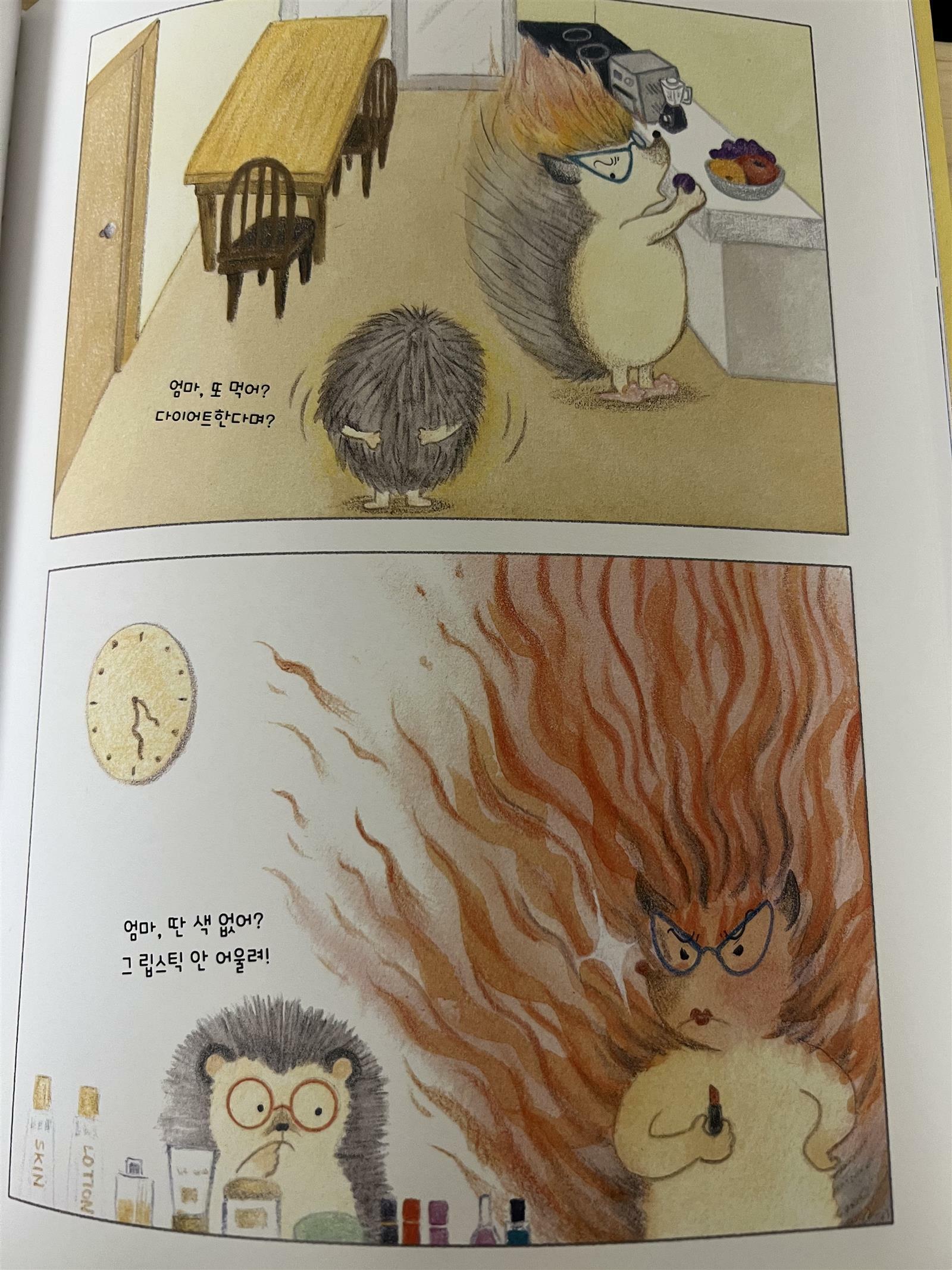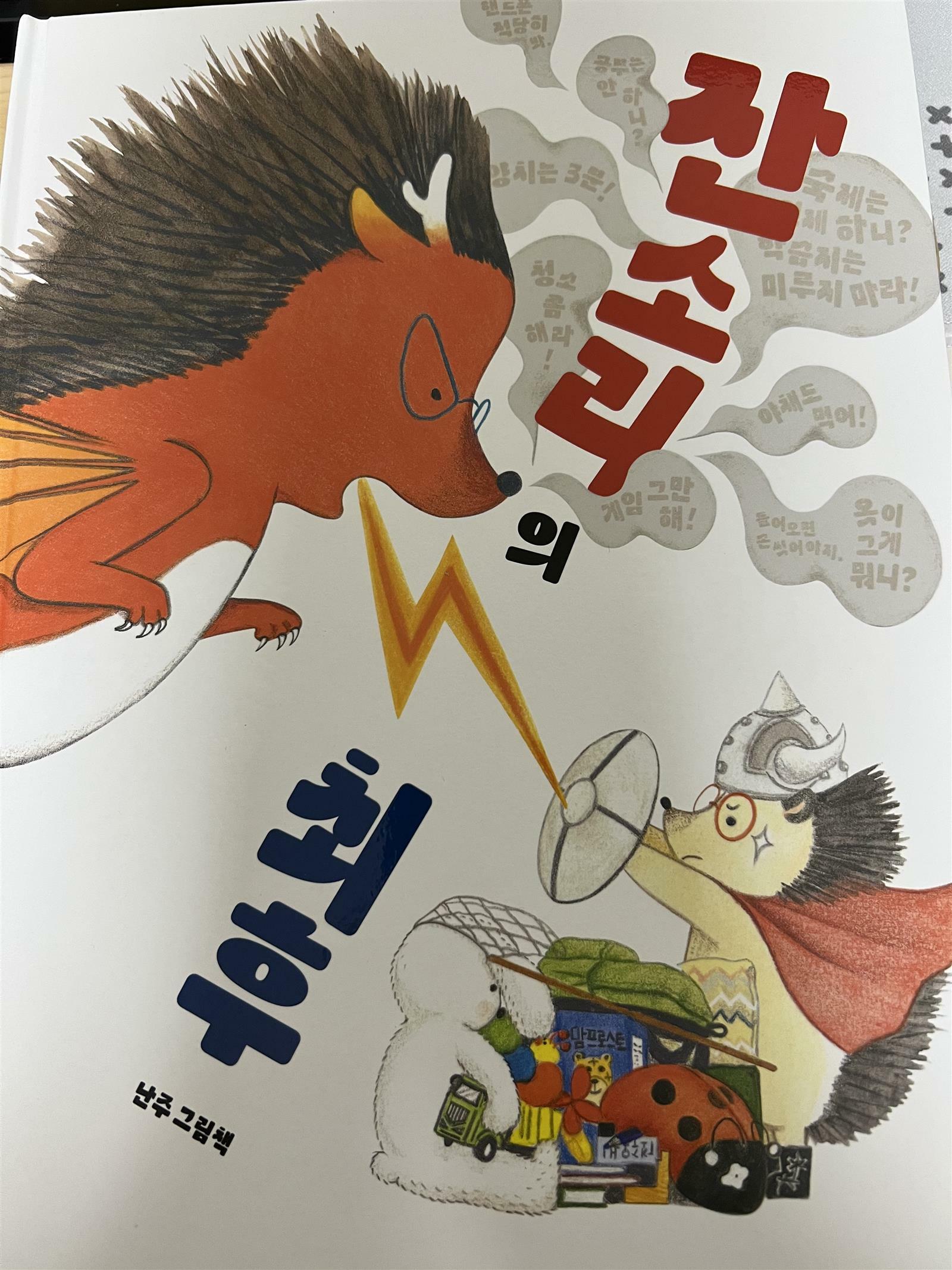 그림책 '잔소리의 최후'를 보았습니다. 잔소리라는 제목이 제 마음을 뜨끔하게 하네요. 잔소리가 많은 저로서는 이 책이 안궁금 할 수가 없습니다. 어떤 내용인지 궁금해서 제가 먼저 보았습니다. 잔소리를 장난감 방패로 막고 있는 이 고슴도치 아이는 어떻게 잔소리를 대처해 나갈까요? 여러가지 생각이 나는 책입니다. 책장을 넘겨보니 엄마의 잔소리가 귀찮은 고슴도치 아이가 나옵니다. 엄마가 잔소리를 하니깐 아무래도 싫겠지요? 엄마의 잔소리로 인해서 자신이 할 수 있는 것이 없다고 생각이 들었나봅니다. 우리 아이들도 그런 생각을 할까? 잠시 생각해 보았습니다. 엄마의 잔소리로 너덜너덜해진 고슴도치는 대책을 찾아봅니다. 엄마를 잘 살펴보다가 엄마의 실수를 지적하면서 역공격을 나섭니다. 엄마를 졸졸 따라다니며 엄마에게 잔소리를 퍼붓기 시작합니다. 처음에는 뭔가 통쾌하고 재미있습니다. 하지만 슬슬 지쳐갑니다. 엄마를 따라다니느라 내가 할일을 못하게 되었으니 말이죠. 그래도 포기하지 않습니다. 엄마를 따라 자전거를 타고 밖에도 나갑니다. 그러다가 그만 큰 버스에 치일 뻔 합니다. 엄마를 멈춰세운 고슴도치의 잔소리로 다행스럽게 다치지 않았습니다. 그리고 고슴도치는 생각해 봅니다. 고슴도치가 어렸을 때부터 엄마는 늘 고슴도치를 살펴보면 위험으로부터 보호해 주었던 것입니다. 잔소리가 그냥 나오는 것이 아니란 것을 깨닫게 되지요. 저도 이 책을 보며 새삼 알게 되었습니다. 잔소리가 듣기는 싫지만 사실 사랑에서 나오는 것입니다. 아이를 노심초사 바라보며 관심과 사랑을 퍼붓기 때문에 잔소리가 나오게 되는 것이지요. 관심이 없다면 보지도 않고 잔소리도 없을 것 같습니다. 아이들과 이 책을 보며 잔소리에 대해 대화해 보면 좋을 것 같네요. 출판사로부터 도서를 제공받아 직접 읽고 작성한 리뷰입니다. #잔소리 #가족 #사랑 #관심 #창작그림책 #북멘토그림책 #책세상 #맘수다 #책세상맘수다카페 #잔소리의최후