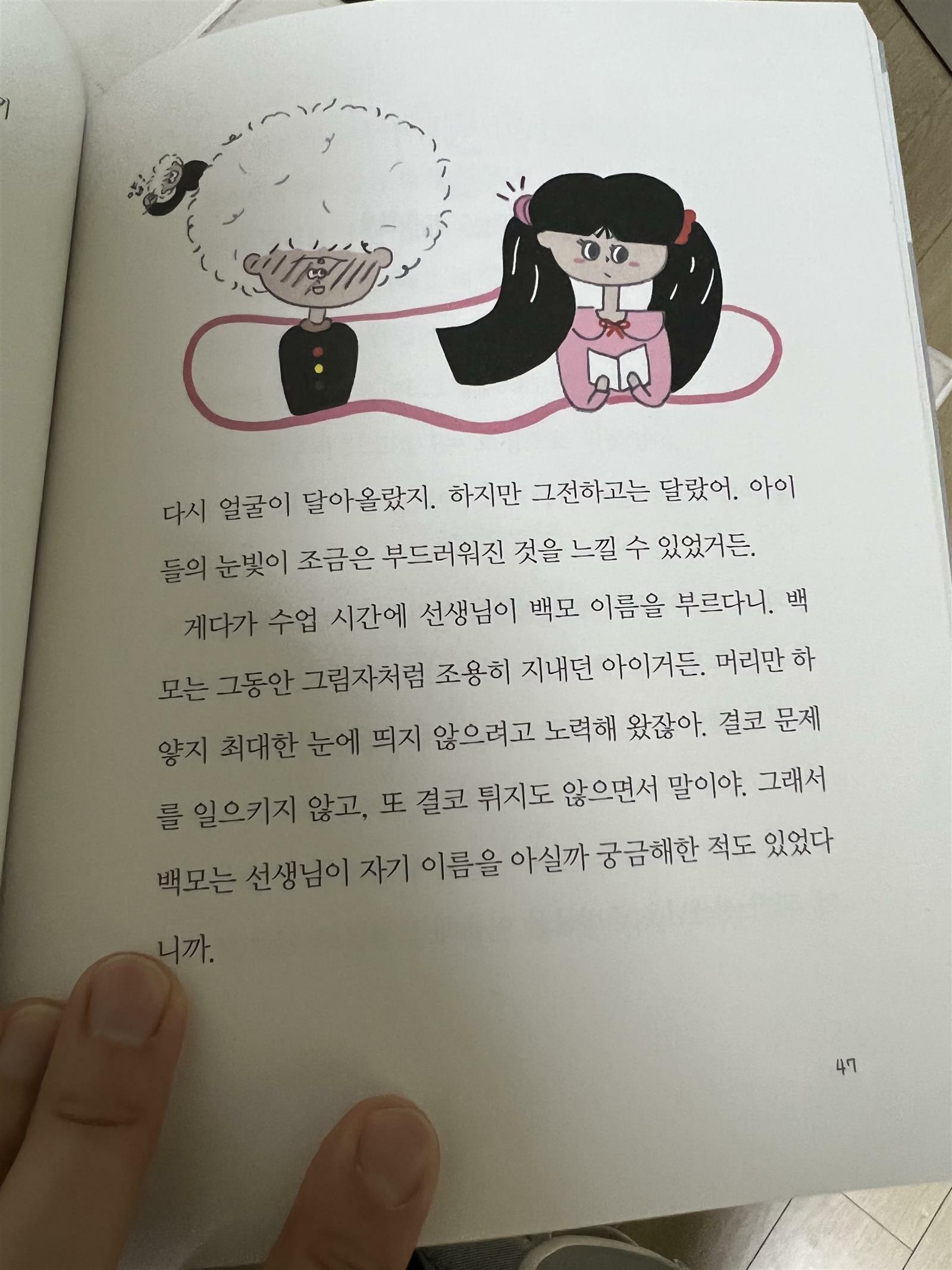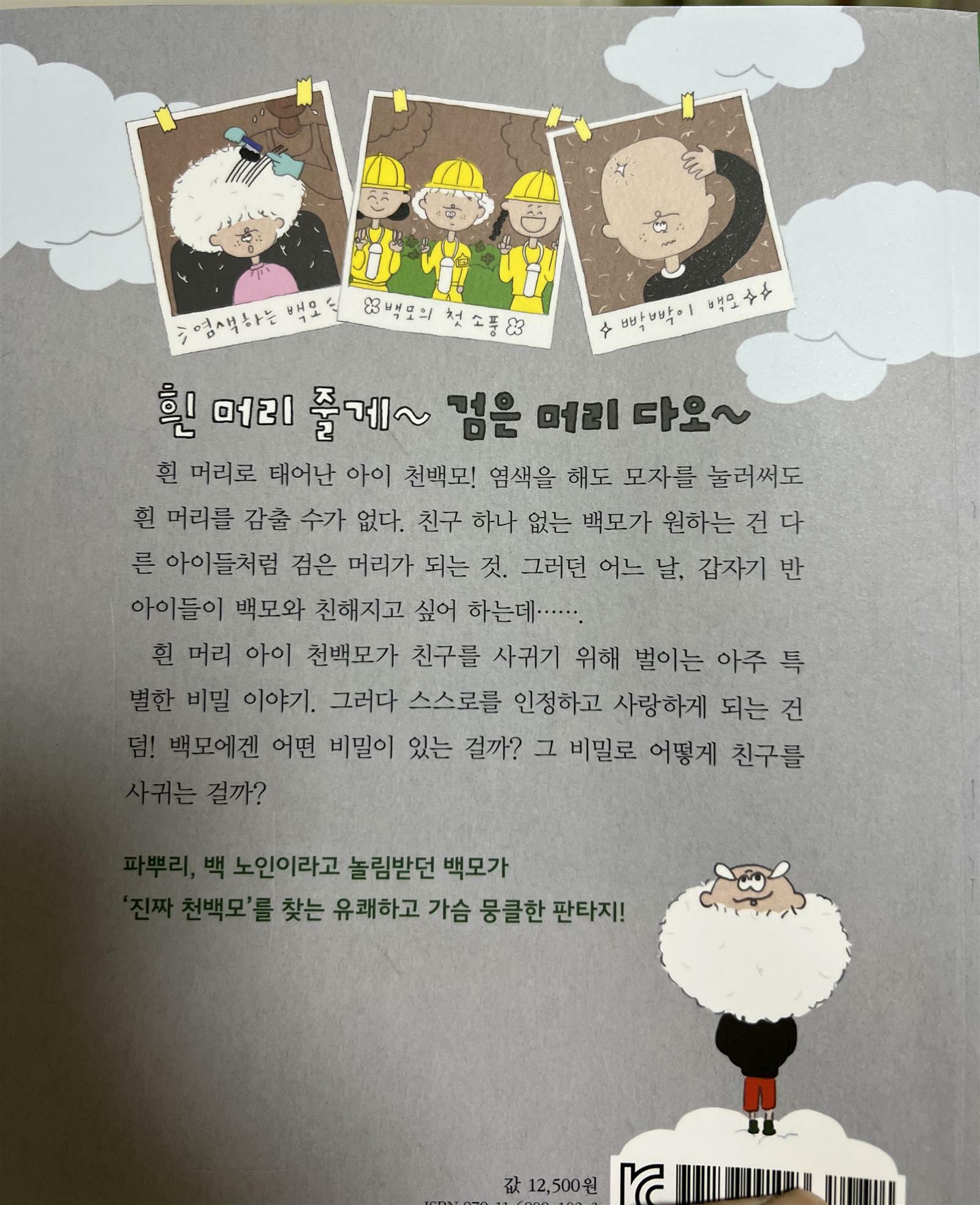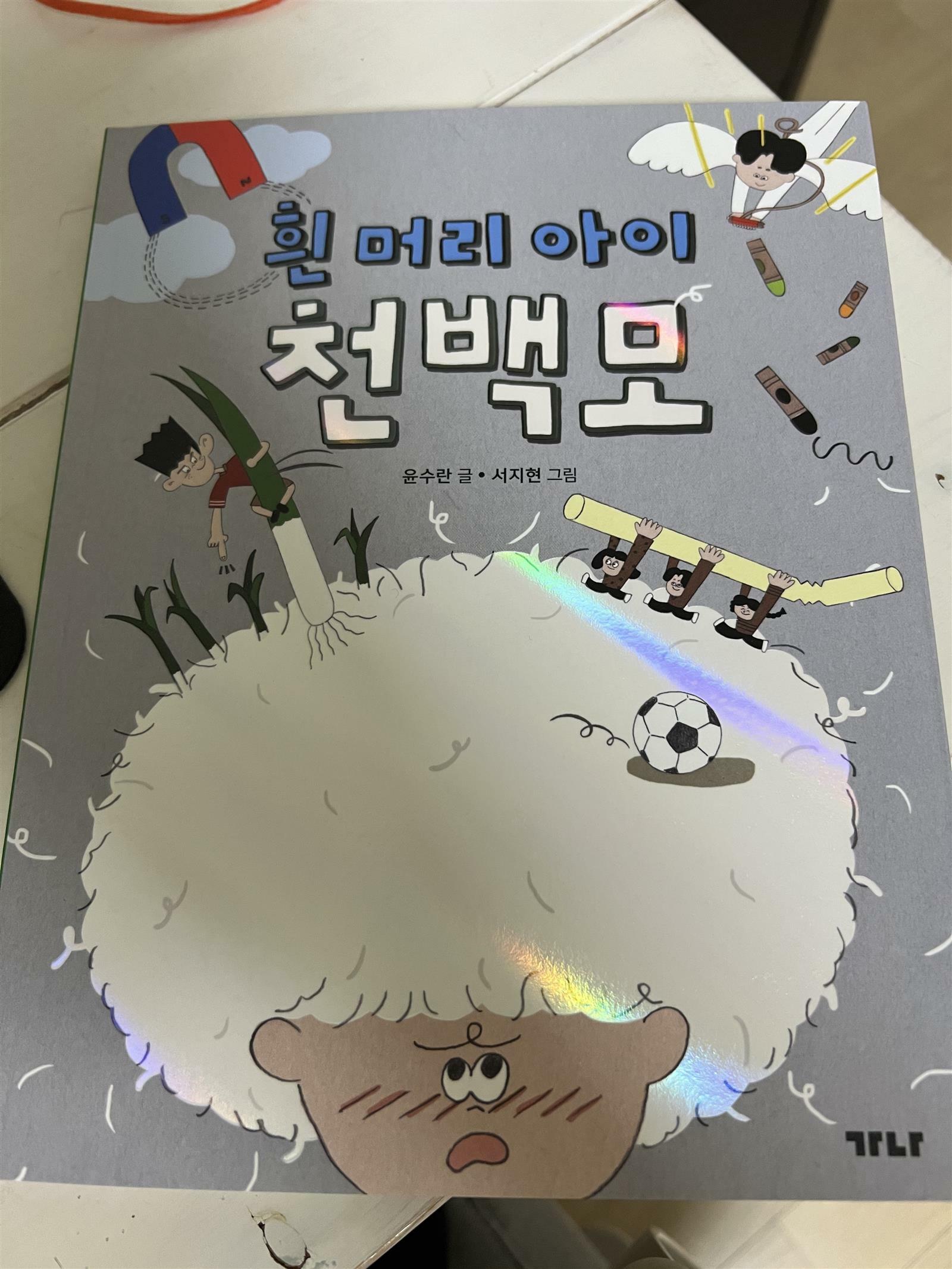 '흰 머리 아이 천백모' 책을 읽어 보았습니다. 책 표지를 보면 머리가 흰 아이가 난처한 표정으로 있습니다. 머리카락 색만 보면 아이가 아닐 수도 있겠다는 생각이 듭니다. 천백모는 이름처럼 머리카락이 온통 흰색입니다. 우연찮게 이름따라 머리카락이 흰 색이라서 놀림 받기에도 딱입니다. 백모는 자신의 머리색 때문에 학교생활이 많이 힘듭니다. 아이들 눈에 띄지 않게 조용히 지내는 것이 오히려 편합니다. 흰 머리카락이 백모의 단점처럼 되어 버려서 백모는 이로인해 자신감도 없고 주눅이 들어 있습니다. 누구나 단점이 있고, 장점이 있습니다. 그런데 아이들은 친구들의 영향을 많이 받기 때문에 놀림을 한 번 받게 되면 시무룩해지고 상처받기 쉬운 것 같아요. 이 책은 백모처럼 단점이라고 여기는 나의 모습을 어떻게 극복해 나가야 하는지 재미있는 이야기로 보여줍니다. 그리고 백모의 마음을 따라가다보면 아이들도 공감하며 백모를 응원하게 될 것 같아요. 천백모는 자신의 머리카락 색때문에 어려움이 많습니다. 그러던 중에 우연히 자신의 머리카락이 어떤 길쭉한 모양의 물체로 변신 시킬 수 있는 마법이 있다는 것을 알게 됩니다. 학교에서 몰래 친구들에게 준비물을 머리카락으로 만들어 주면서 백모는 차츰 아이들 틈에 낄 수 있게 됩니다. 아이들이 먹을 것 가져와서 환심을 사는 것 같이 어떤 조건으로 친구를 사귈 수 있다는 착각을 많이 하게 되지요. 백모도 이제는 흰머리카락이 없으면 안될 존재가 되어 버립니다. 흰머리카락의 능력에 의존해서 친구를 사귀려고 하는 것이지요. 이 능력이 없어지면 친구도 떠나갈까봐 노심초사하게 됩니다. 그래서 검은머리로 바꿀 수 있다는 어떤 할아버지를 만났지만 백모는 갈등하게 되지요. 과연 백모는 어떤 결정을 내리게 될까요? 나의 단점을 어떻게 극복해야 올바른 것일까요? 아이들과 이야기해 볼 수 있는 책이었습니다. 출판사로부터 도서를 제공받아 직접 읽고 작성한 리뷰입니다. #흰머리아이천백모 #가나 #윤수란 #컬처블룸 #컬처블룸리뷰단