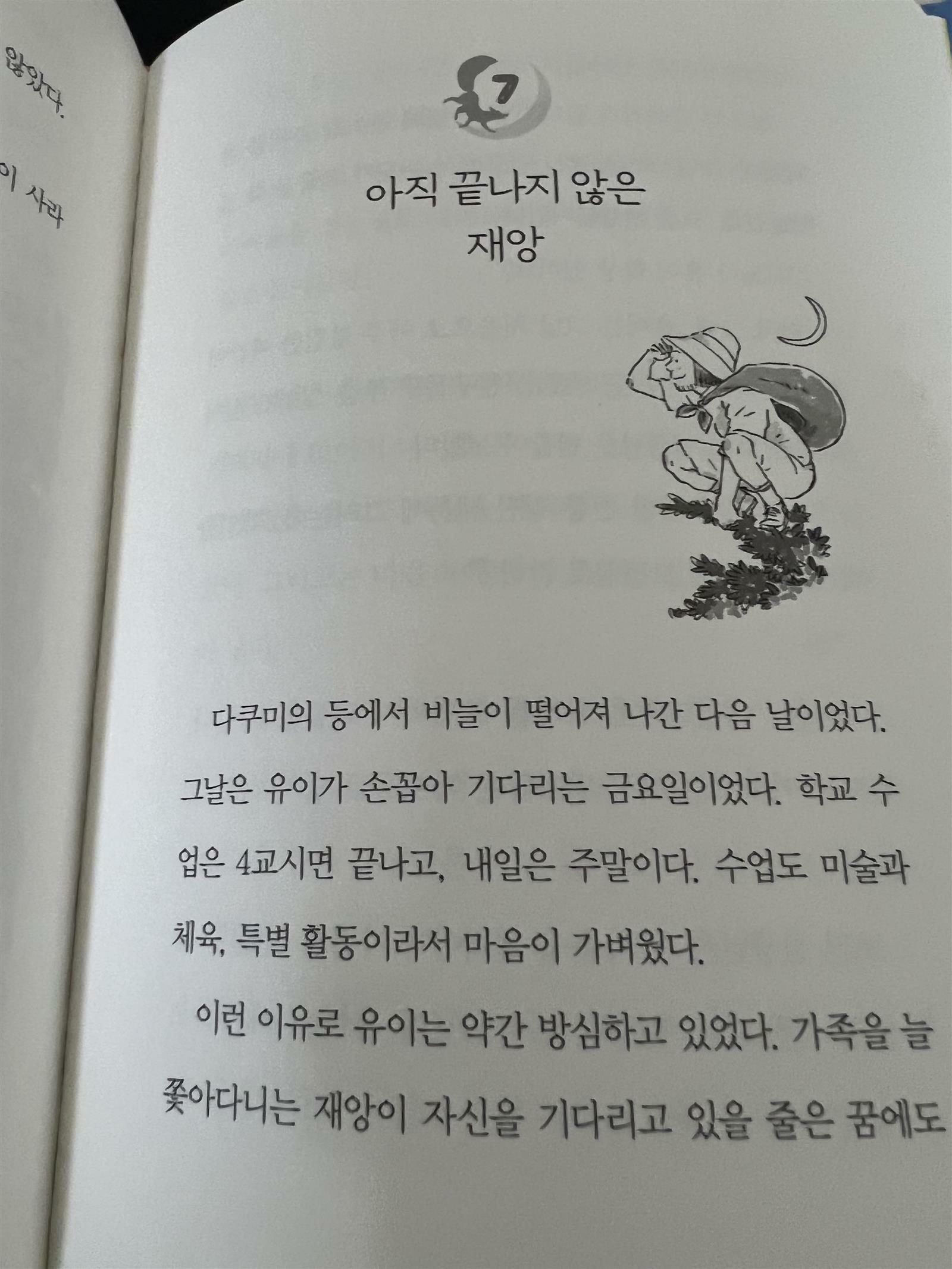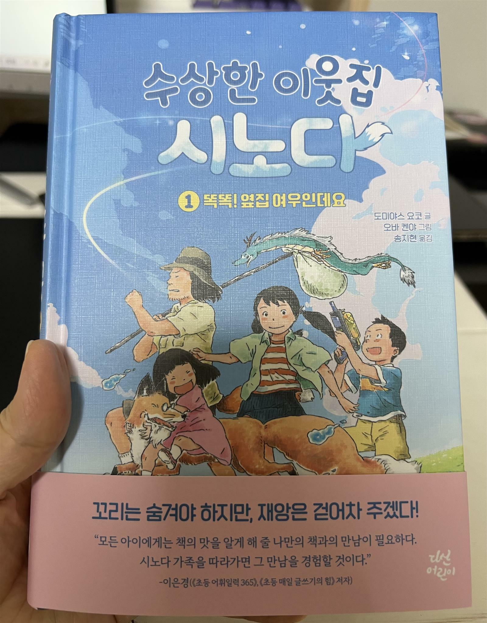 '수상한 이웃집 시노다 1 똑똑! 옆집 여우인데요 ' 책을 읽어 보았습니다. 한 손에 들어오는 책 크기와 그림이 맘에 들었습니다. 글밥은 초등 중고학년 정도가 읽을 정도의 수준이고 간간히 그림도 있지만 흑백입니다. 수상한 이웃집 이라는 제목이 호기심을 불러 일으키는 책이라서 궁금하더라구요. 아이가 읽기 전에 제가 먼저 읽어 보았는데 이야기 설정 자체가 흥미롭습니다. 여우와 인간의 결혼으로 태어난 아이들이 주인공 입니다. 이 책의 시노다 엄마는 여우이지만 사람의 모습을 할 수 있습니다. 수시로 바꿀 수 있지만 엄마의 모습으로 아이들을 챙깁니다. 단, 한 달에 한번 음력 초하룻날 밤이 되면 산으로 갑니다. 그때 엄마는 여우의 모습으로 변한다고 합니다. 하지만 아이들에게 보여 준 적은 없습니다. 여우의 모습을 들키면 인간의 집에서 살 수 없다고 합니다. 첫 장부터 엄마의 비밀을 이야기 하는 책이라서 몰입감이 좋습니다. 엄마가 여우이기에 엄마쪽 친척들은 전부 여우입니다. 하지만 사람으로 변하기도 하고 능력을 가지고 있습니다. 사극 드라마를 하는 날이면 외할아버지는 여우의 모습으로 오셔서 쇼파에 누워 드라마를 봅니다. 아이들은 이런 할아버지의 모습이 익숙합니다. 이 상황을 상상해 보니 참 재미있는 것 같습니다. 평화로운 것만 같은 하루 하루가 지나고 있습니다. 그러더 어느날 집 욕조에 작은 용이 들어와 있는 것을 알게되고, 이모 할머니의 재앙을 알리는 예언이 시노다 가족을 긴장하게 합니다. 애초에 엄마의 결혼은 재앙을 불러온다는 이야기로 결혼 반대가 심했지만 시노다 엄마는 참 강인한 사람인 것 같습니다. 재앙 쯤은 이겨내면 된다고 생각합니다. 이 책에서도 긴장감을 주는 재앙이 발생하긴 하지만 금방 방법을 찾고 해결해 나가면서 가족들은 더욱 똘똘 뭉치게 됩니다. 어떤 재앙인지 책을 통해 보시면 더욱 흥미로울 것 같네요. 1권이 마무리되었지만 2권을 예고하는 뒷 편의 그림이 다음 이야기를 기다려지게 합니다. 꽤 두꺼운 편이지만 시간 가는 줄 모르고 읽게 되는 책입니다. 초등학생 아이들과 함께 읽어보시면 좋을 것 같아 추천합니다. 출판사로부터 도서를 제공받아 직접 읽고 작성한 리뷰입니다. #여우 #판타지 #이웃 #읽기물 #독서 #문해력 #가족 #성장 #함께 #변신 #모험 #용 #비밀 #수상한이웃집시노다 #다산어린이 #책세상 #맘수다 #책세상맘수다카페
