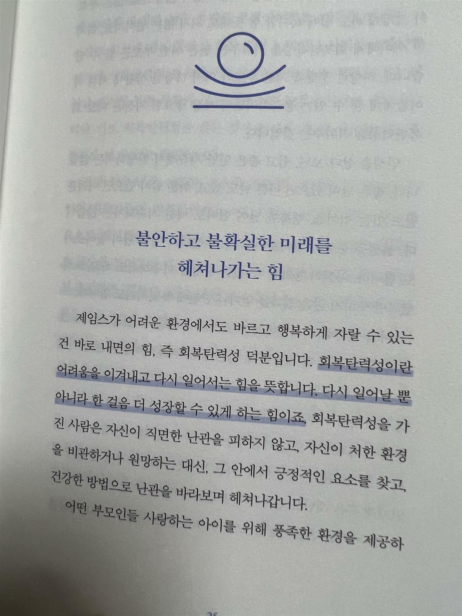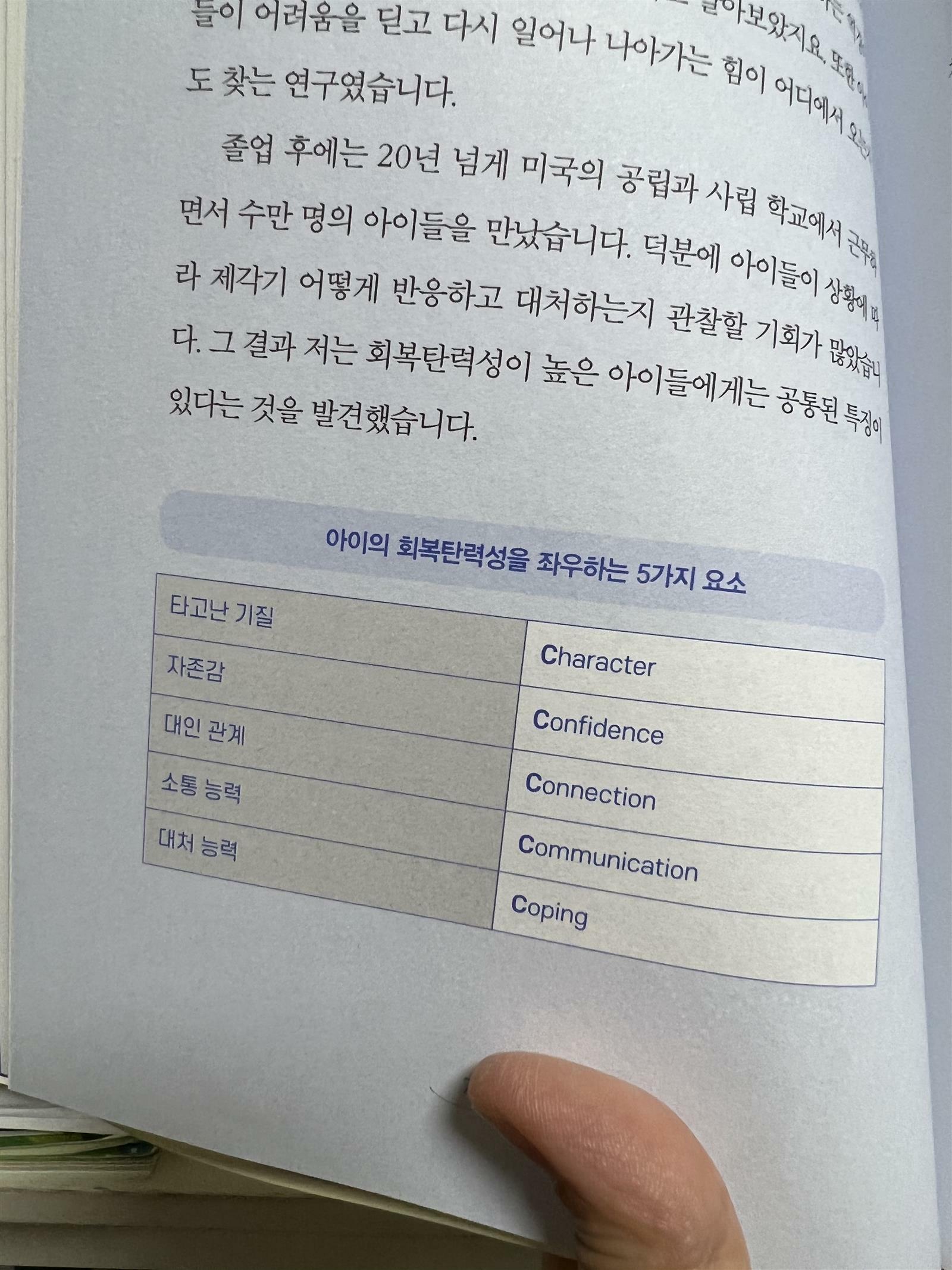 '회복탄력성의 힘' 책을 읽어보았습니다. 회복탄력성이 중요하다는 것을 알고 있었지만 어떤 이유인지 어떻게 힘을 기를 수 있는지는 잘 모르고 있었습니다. 하지만 이 책을 통해 어떻게 아이에게 회복탄력성을 키워 줄 수 있을지 배울 수 있어서 좋은 것 같습니다. 회복탄력성의 힘은 5가지의 요소가 있습니다. 그 중에서 기질적으로 타고난 기질적 요소가 있습니다. 이 한가지는 노력으로 될 수는 없지만 나머지 4가지는 후천적으로 길러낼 수 있다고 합니다. 저희집 두 아이를 보아도 한 명은 외향적이고 순한 기질입니다. 그래서 어려움이 있어도 적응하는 속도가 빠릅니다. 어린이집을 처음 갔을 때도 일주일만에 잘 적응하더라구요. 그런데 다른 아이는 까다로운 기질이라서 어린이집 적응을 한달 동안 울면서 했습니다. 이렇듯 타고난 기질은 바꿀 수 없습니다. 그에 적절한 대응을 해주는 것이 중요 한 것 같습니다. 하지만 기질로 인해 회복탄력성을 갖기에 더 수월 할 수는 있습니다. 기질말고 후천적으로 기를 수 있는 요소는 자존감, 대인관계, 소통능력, 대처능력이 있습니다. 이 요소들은 후천적인 노력으로 향상시킬 수 있다니 참 희망적인 것 같습니다. 예를 들어 대인관계의 경우 타인과의 관계가 좋은 아이들은 어려움을 잘 이겨내고 극복 한다고 합니다. 그런데 여기서 중요한 것은 아이가 처음 관계를 맺는 부모와의 관계를 잘 맺어야 한다는 것입니다. 그렇다면 어떻게 아이에게 긍정적인 영향을 미치며 관계를 형성해 나가여 할까요? 부모의 표정까지도 아이는 읽고 반응하며 행동 한다는 것입니다. 무표정보다는 웃는표정과 긍정적인 언어가 아이의 회복탄력성 힘을 기르는데 도움을 준다고 합니다. 이처럼 책을 통해 하나 하나 알아가며 어떻게 적용해야 하는지 알 수 있습니다. 단순 이론 뿐만 아니라 아이에게 부모가 줄 수 있는 것을 실천하면서 나도 아이도 건강한 힘을 길러가면 좋을 것 같아요. 출판사로부터 도서를 제공받아 직접 읽고 작성한 리뷰입니다. #책세상 #맘수다 #책세상맘수다카페 #회복탄력성의힘 #빅피시