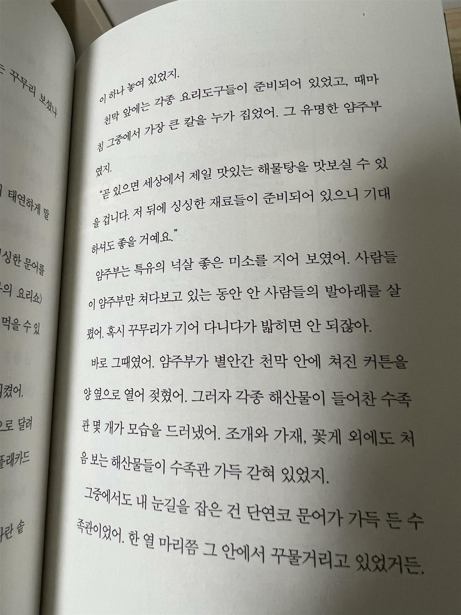 '꾸무리와 초능력 소녀' 책을 읽어 보았습니다. 리틀씨앤톡 출판사에서 출간한 책입니다. 제목이 참 재미있는데 저희 아이도 제목을 보고 눈을 떼지 못하더라구요. 제목에 나오는 꾸무리는 괴연 무엇일까요? 이 책의 주인공 연두는 초능력이 있습니다. 동물들의 말을 알아듣고 동물들의 언어를 사용하는 능력입니다. 그래서 학교가면서 동물들과 대화하느라 늘 지각을 도맡아 하고 있습니다. 친구들을 사귀는 것도 쉽지 않습니다. 어릴적에는 친구들이 신기해했지만 이제는 친구들이 너무 바삐서 연두를 기다려 줄 수가 없는 것입니다. 다들 학원가느라 바쁜데 연두는 길에서 만난 동물들의 말에 대꾸하는 것으로 바쁩니다. 연두의 이런 능력을 연두의 이삐도 알고 있습니다. 그래서 연두의 편식을 이해해주지만 조금 걱정이 되기도 합니다. 연두는 베지테리안으로 살고 있습니다. 동물들의 말을 알아듣기에 차마 먹을 수가 없겠죠? 그러던 어느날, 연두가 아빠와 시장에서 만나기로 했는데 수족관에 있는 문어의 sos 신호를 눈치챕니다. 문어의 말을 알아듣지 못하는데 뭔가 특별한 문어이기에 텔레파시가 통한 것입니다. 힘들게 문어를 구해서 집에왔고, 문어는 빠르게 탈출해서 세탁기 밑에 숨어버립니다. 문어와 소통이 가능하다는 것에 당황스럽기도 하지만 이 문어의 정체가 궁금하기도 합니다. 연두는 문어가 먹물로 쓴 글을 이해하며 대화가 가능하다는 것을 알게됩니다. 그리고 문어는 단순한 문어가 아니었단 것이죠. 외계에서 온 외계인 문어였던 것이지요. 연두는 문어에게 꾸무리라는 이름을 지어줍니다. 그리고 서로 소통을 하게 됩니다. 꾸무리는 자신을 동해로 옮겨 달라고 이야기합니다. 아직 아이인 연두는 꾸무리를 어떻게 데려다 줄까요? 과연 꾸무리는 동해에 가서 어떻게 될까요? 흥미진진한 이야기가 펼쳐지는 책입니다. 어른이 제가 보아도 재미있었습니다. 아이들이 읽으며 상상하고 우리 지구의 환경에 대해서도 다시 한 번 생각 할 수 있는 기회가 되면 좋을 것 같아요. 출판사로부터 도서를 제공받아 직접 읽고 작성한 리뷰입니다. #동물 #환경 #생태계 #자연 #사회 #우주 #외계인 #책세상맘수다카페 #리틀씨앤톡 #꾸무리와초능력소녀