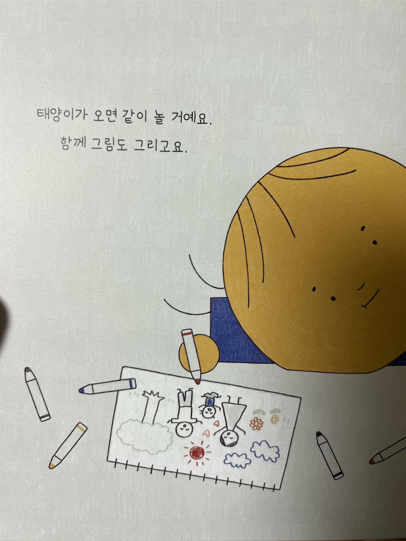 '태양이 없어졌으면 좋겠어' 라는 그림책을 보았습니다. 책 제목을 처음 보았을 때 태양이 어떤 의미인지 잘 몰랐습니다. 하늘에 있는 태양일까? 생각했습니다. 아이들도 함께 표지를 보면서 이야기 나눠보기 좋을 것 같습니다. 태양이 왜 없어졌으면 좋겠다고 하는지? 의문이 생기는 책입니다. 그림책도 조금 독특해서 많은 색이나 선을 사용하지 않고 있습니다. 조금 단순해 보이기도 하면서 명확합니다. 책 표지를 넘기면 책장을 넘기기 전에 나오는 작은 그림부터 차근차근 보기 좋습니다. 책 내용과 연관되어서 주인공의 마음을 읽어보기 좋기 때문입니다. 첫 그림은 작은 스케치북에 세가족이 그려져 있는 장면입니다. 아직 책 내용은 시작하지 않았지만 이 그림이 주인공에게 공감 할 수 있도록 해줍니다. 주인공 아이는 태양이릉 만나고 싶어합니다. 살펴보니 태양이는 주인공의 동생입니다. 엄마는 급하게 병원으로 아빠와 가는 것 같고 주인공은 태양이를 기다립니다. 하지만 그 마음에는 양가감정이 있습니다. 기다려왔던 동생이지만 막상 상황이 닥치니 너무 외롭습니다. 세가족만 있던 그 시절이 그립기도 하겠지요. 동생을 기다리는 아이나 동생이 있는 아이들이 함께 읽으면서 많은 공감을 할 수 있는 책입니다. 저희집도 첫째가 동생을 만났을 때 참 다양한 반응이 있었던 것 같습니다. 좋다가도 싫고 귀찮지만 없으면 심심하고 생각나는 그런 존재가 동생이 아닐까요? 그러면서 세월이 지나 차츰 서로 익숙해지고 사랑을 만들어 나가는 것 같습니다. 하지만 아직 어린 아이들의 경우 동생을 받아들이기까지 많은 시간이 걸린다는 것을 이해하기는 어려울 것 같습니다. 이런 그림책을 통해 공감하고 위로받으며 익숙해져 가는 것도 좋은 것 같아 추천합니다. 출판사로부터 도서를 제공받아 직접 읽고 작성한 리뷰입니다. #태양이없어졌으면좋겠어 #조수현 #북멘토 #책세상 #맘수다 #책세상맘수다카페