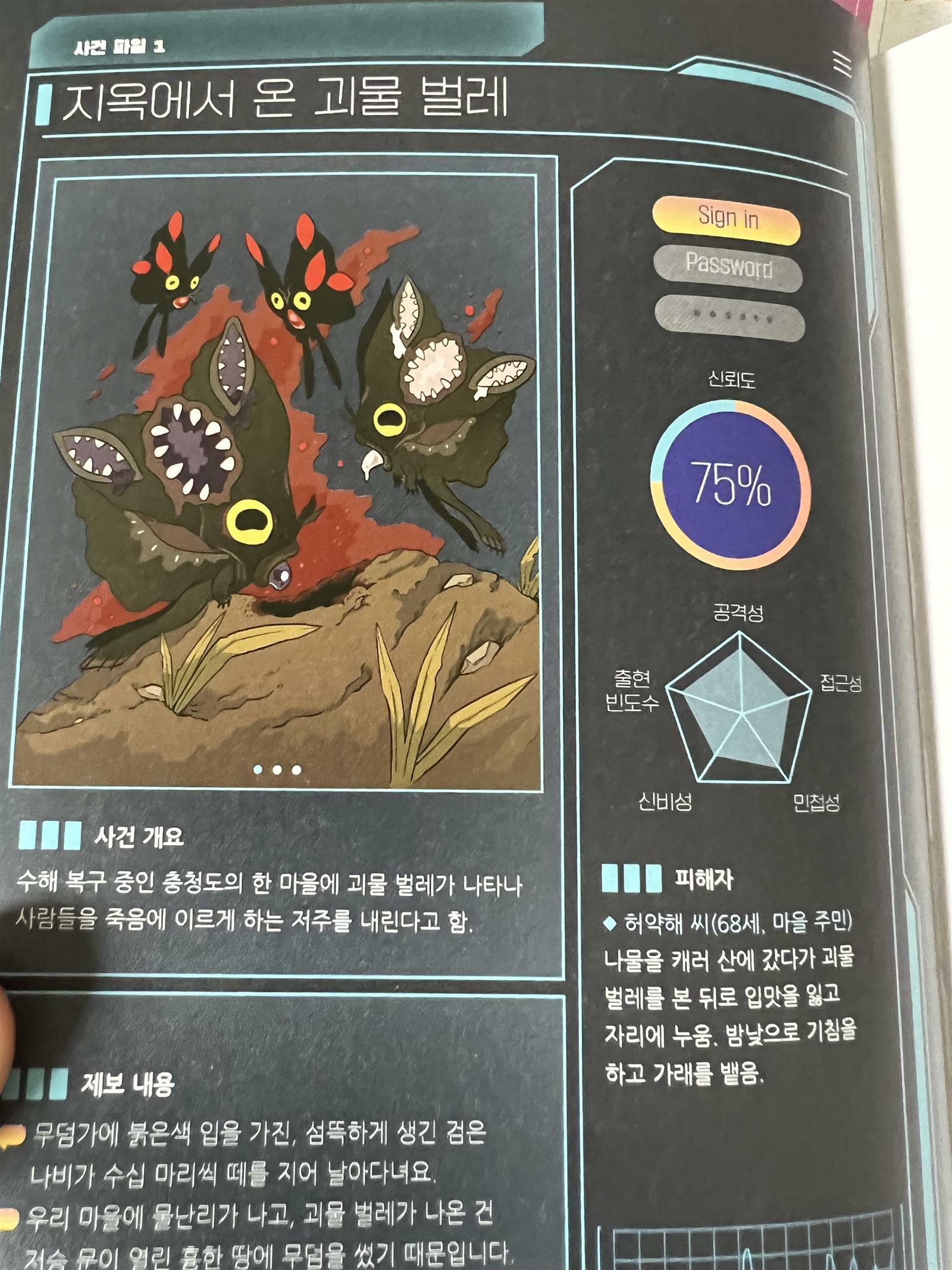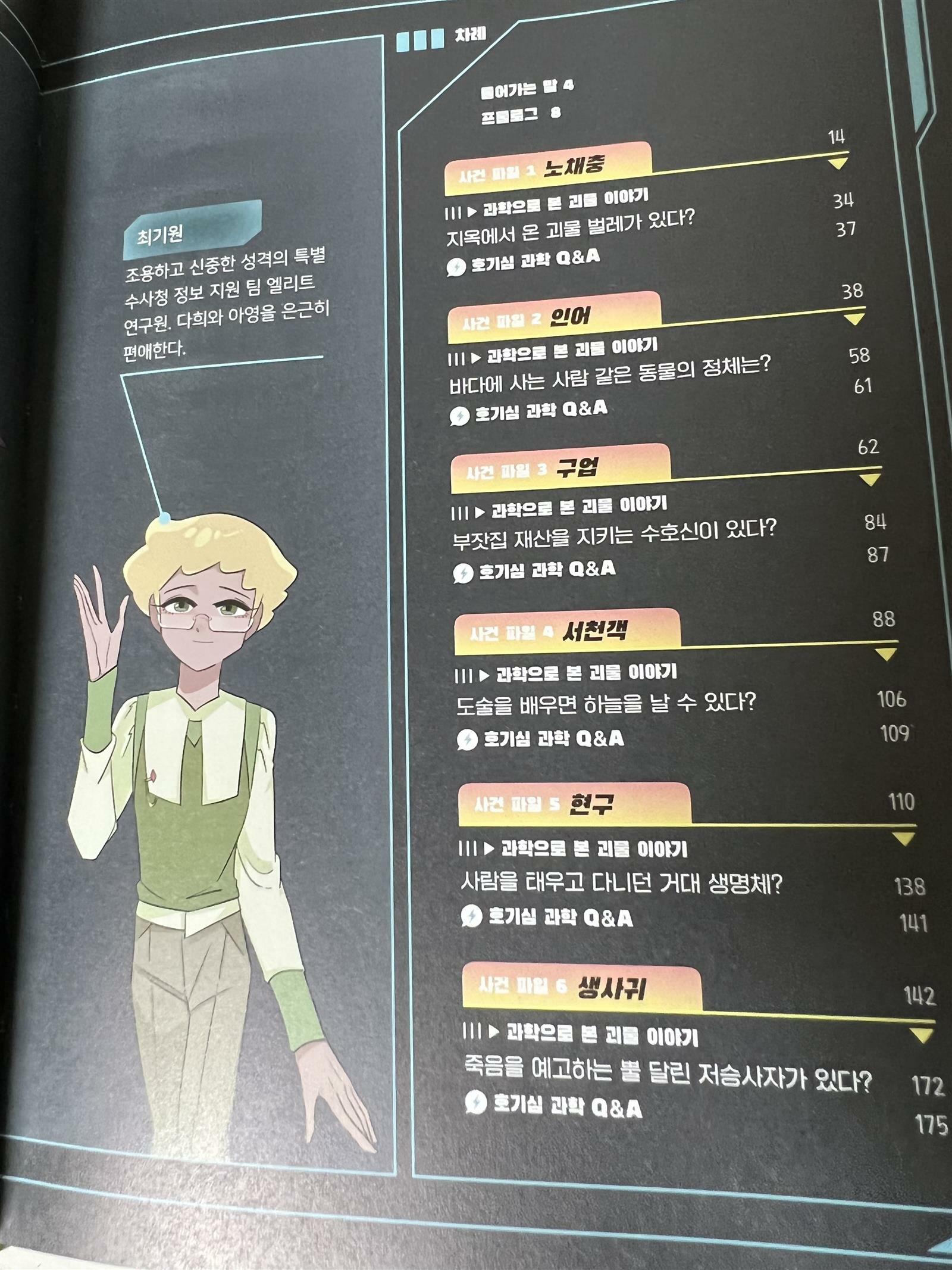 '곽재식의 괴물 과학 수사대2' 책을 보았습니다. 과학과 상상력이 넘치는 책이라서 아이들이라면 모두 좋아 할 책입니다. 곽재식의 괴물 과학 수사대1도 재미있게 보았는데 2권이 나왔다고 해서 기대가 되었습니다. 2권에서도 과학지식과 괴물이야기가 아이들의 호기심의 자극합니다. 처음 이야기는 노채충 이야기 입니다. 시체에게서 벌레가 발견된 이야기 인데 실제로 조선시대 후기 정조 때 편찬된 의학서 [광제비급]에서 노채충이라는 벌레 이야기가 나온다고 합니다. 옛날에는 과학지식이 많지 않아서 벌레가 사람들 콧속으로 드나들며 폐병을 옮긴다고 생각했던 것입니다. 그 시대에 시체에서 발견된 벌레들이 아마도 전염병으로 인해 시체를 깊이 묻지 못해 발생한 일인 것 같다고 합니다. 실제 동의보감에도 노채충에 대한 기록이 있다고 하니 참 신기합니다. 과학수사대의 이야기는 픽션이지만 그와 관련된 논픽션 이야기가 함께 나오니 더욱 긴장감을 주는 것 같습니다. 두 번째 이야기는 인어 이야기인데 조선 중기 설화집 [어우야담]에 인어 이야기가 나온다고 합니다. 이 이야기는 드라마 [푸른 바다의 전설]의 모티프가 되었다고 해서 더욱 재미있더라구요. 예전에 푸른 바다의 전설 드라마를 재미있게 보았는데 그 시절 생각이 나기도 했습니다. 아이들을 위한 책이지만 어른이 보아도 참 신기하고 재미있는 책입니다. 괴물에 대해서 잠시 잊고 살았던 것 같은데 다시 동심으로 돌아가는 경험을 하는 것 같습니다. 인어에 대해서는 아직도 유튜브를 통해 많은 이야기가 있더라구요. 그만큼 모두의 관심과 흥미를 끌어들이는 주제인것 같습니다. 현재로서는 해양 포유류에 대한 지식이 없던 옛사람들의 착각이라고 하지만 진짜 인어가 있을 수 있을 거라는 생각을 하게됩니다. 아이들이 이 책을 읽으며 더 많은 상상력을 발휘하며 과학지식도 채울 수 있는 것 같습니다. 아이들과 재미있게 책 읽으며 더 큰 상상의 나래를 펼쳐 보시길 추천합니다. 출판사로부터 도서를 제공받아 직접 읽고 작성한 리뷰입니다. #곽재식의괴물과학수사대 #곽재식 #위즈덤하우스 #책세상 #맘수다 #책세상맘수다카페
