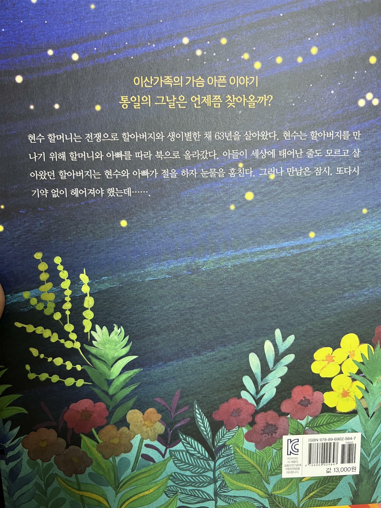 '달빛다리' 그림책을 읽어보았습니다. 아이도 스스로 잘 읽더라구요. 아이와 많은 이야기를 나줘보지는 않았지만 이 책을 통해 이산가족이라는 주제에 대해 이야기 할 수 있을 것 같습니다. 이 그림책은 이산가족의 상봉 이야기 입니다. 오랜세월 떨어져 살던 할머니와 할아버지의 만남을 손자의 시선으로 보여주고 있습니다. 할머니는 아들은 주인공의 아버지 입니다. 유복자로 태어난 아버지는 어떤 삶을 살았을까요? 할머니의 그리움은 말로 다 표현하기 어려울 것 같습니다. 전쟁으로 인해서 헤어져야만 했던 할머니와 할아버지의 마음이 고스란히 느껴지는 그림책입니다. 이산가족의 아픔과 슬픔을 손자의 말로 담담하게 담아내고 있지만 그리움이라는 감정을 느껴 볼 수 있는 책입니다. 이산가족 상봉을 통해 할머니와 할아버지는 만났지만 지속적인 만남은 어렵습니다. 할머니는 할아버지에게 끼워준 반지가 내심 마음에 걸립니다. 할어버지는 북에서 다른 가족과 함께 실고 있기 때문이지요. 할아버지는 아버지가 태어 난 줄도 모른 채 살아오셨다고 합니다. 직접 겪은 일은 아니지만 이 책을 통해 아이들이 전쟁이나 분단의 아픔을 간접적으로 느껴 볼 수 있을 것 같습니다. 상봉을 마치고 돌아온 할머니의 그리움은 아마 더욱 커졌을 것 같습니다. 보름달 뜨는 날 할아버지 목소리가 들리고 못다한 이야기를 나누게 됩니다. 달빛다리로 두 분은 이어졌습니다. 실제로 일어나는 일은 아니겠지만 그만큼 할머니와 할아버지의 그리움이 진하게 느껴지는 장면입니다. 다시 헤어져야만 하는 아픔이 겪어보지 못한 사람은 전부 알 수 없겠지요. 이 책을 통해 아이들과 이산가족의 아픔과 슬픔을 공감해보며 이야기 나눠보면 좋을 것 같습니다. 자연스럽게 역사이야기도 하게 될 수 있을 것 같습니다. 출판사를 통해 도서를 제공받아 직접 읽고 작성한 리뷰입니다. #달빛다리 #가문비어린이 #양정숙 #책세상 #맘수다 #책세상맘수다카페