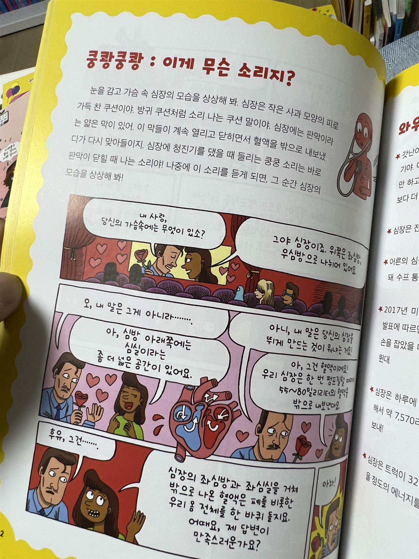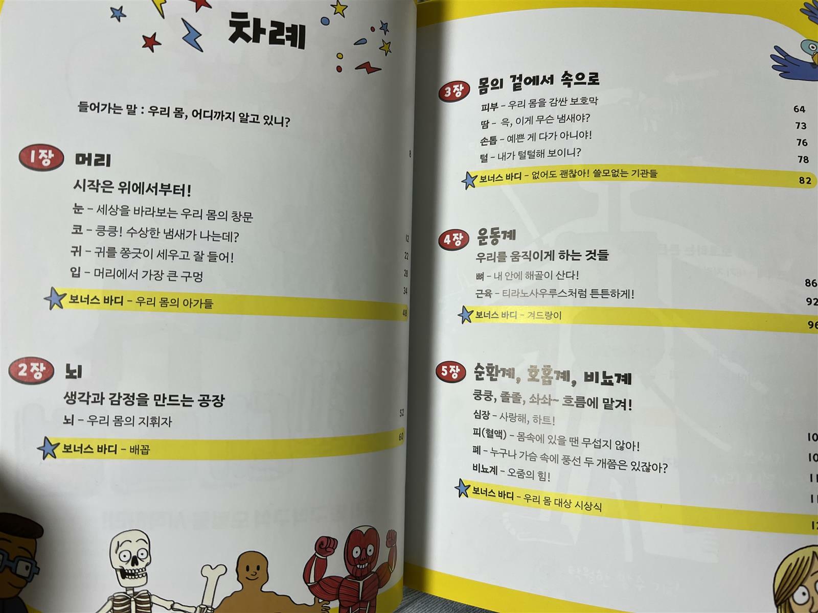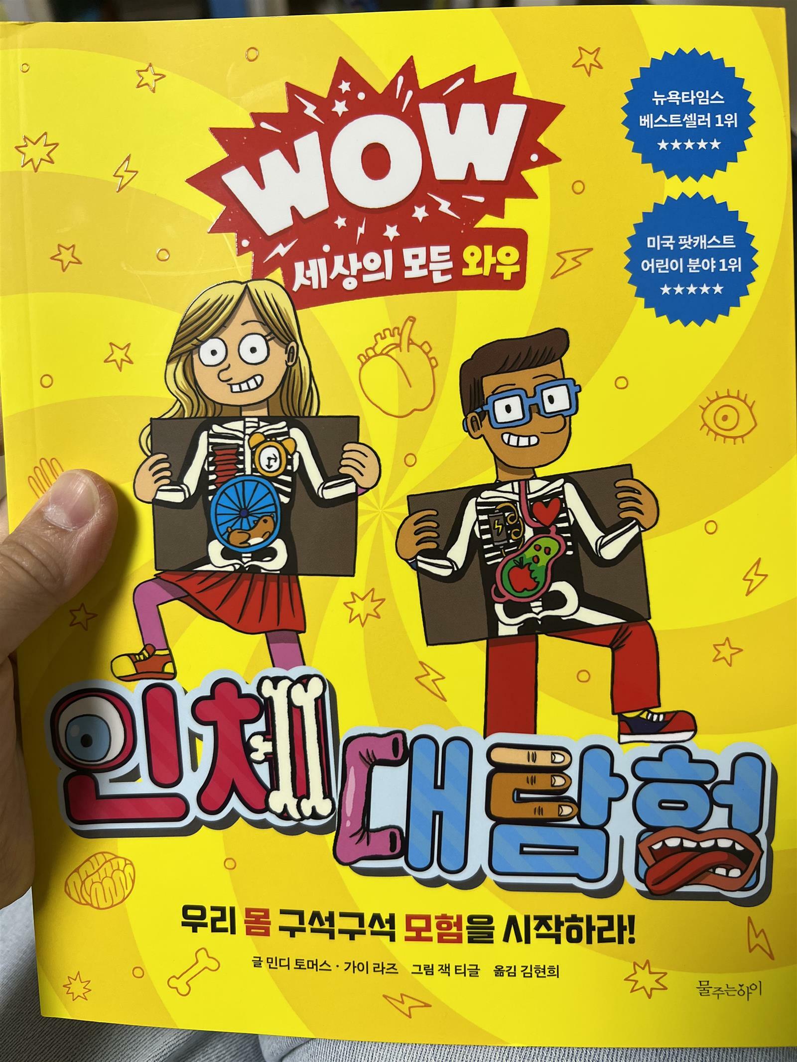 '인체 대탐험' 책을 아이와 함께 읽어 보았습니다. 물주는아이 출판사에서 출간한 책인데 참 흥미로운 표지로 아이의 눈길이 저절로 가는 책입니다. 아이들은 어릴 때부터 인체에 참 관심이 많은 것 같습니다. 저희집 아이들도 어려서부터 왜 눈물이 나지?, 똥은 어떻게 나오지? 등의 많은 질문을 하며 관심을 보여왔습니다. 그래서 아이들의 호기심과 궁금증을 해결하기 위해 인체 관련 그림책도 많이 보았습니다. 학교에 입학한 첫째에게는 좀 더 배경지식을 넓히기 위한 책이 필요했는데 바로 '인체 대탐험' 이 책이 딱 맞는 것 같더라구요. 뉴욕타임스 베스트셀러 1위를 했고, 미국 팟캐스트 어린이 분야 1위를 한 책이라서 그런지 아이들이 좋아할 만한 요소들이 곳곳에 숨어 있습니다. 책장을 넘겨보면 차례를 통해 몸의 위쪽 부분부터 설명해 주고 있음을 알 수 있습니다. 제일 처음 눈에 대해서 알아봅니다. 눈의 구조 뿐만아니라 각각의 역할들을 그림과 함께 설명해주고 있어서 지루할 틈이 없습니다. 다른 인체의 구석 구석도 만화 형식을 곁들여서 재미있게 알려줍니다. 같은 형식의 설명이 아닌 다양한 설명의 방식으로 아이들의 이해를 돕고 있습니다. 책의 마지막 부분에는 면역계와 생식계에 대해서도 설명해 주고 있습니다. 우리의 신체를 잘 알면 사춘기에 대해서도 자연스럽게 받아들일 수 있는 것 같습니다. 아직 사춘기가 아닌 아이들도 사춘기의 호르몬을 알고 있다면 막상 사춘기가 왔을 때 당황하지 않고 자연스럽게 받아들일 수 있을 것 같아요. 초등학생들이라면 재미있게 볼 수 있는 인체 대탐험 책을 추천합니다. 아이들의 호기심을 충족해 주면서 넓은 배경지식을 쌓을 수 있는 책이라 도움이 많이 되는 것 같습니다. 출판사로부터 도서를 제공받아 직접 읽고 작성한 리뷰입니다. #인체대탐험 #세상의모든와우 #물주는아이 #책세상 #맘수다 #책세상맘수다카페