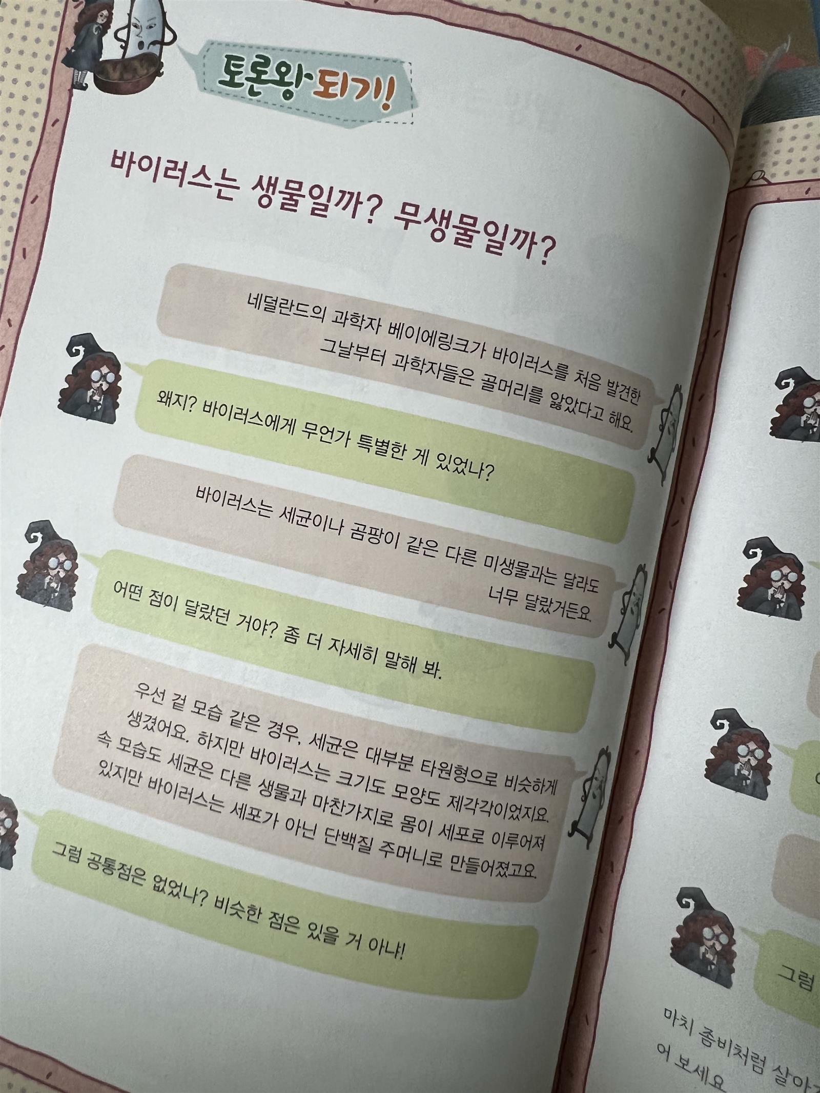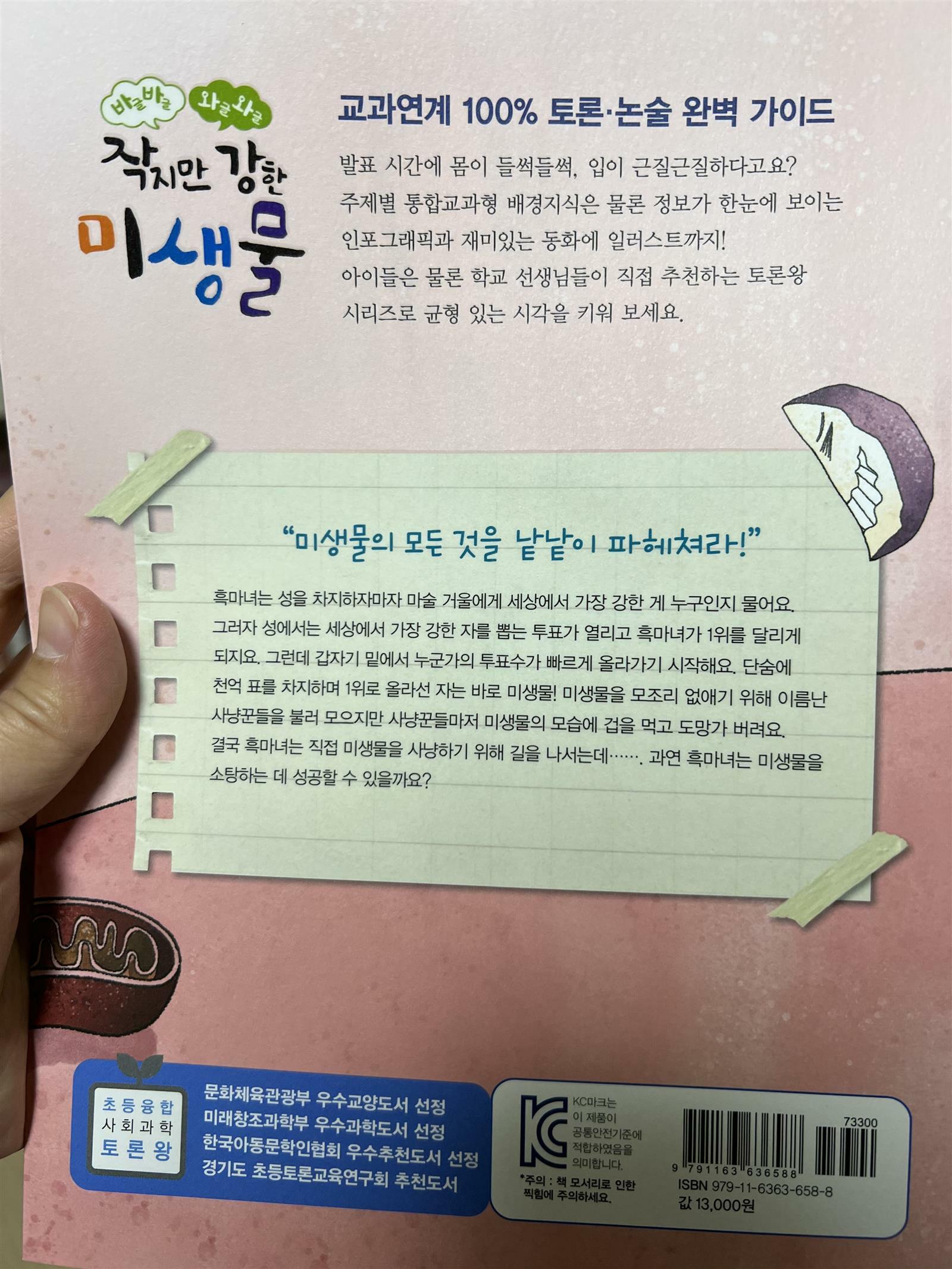 '작지만 강한 미생물' 초등융합 사회과학 토론왕 시리즈 책을 읽어 보았습니다. 이 시리즈 책을 예전에 본 적이 있는데 아이와 보면서 토론하기에 유익한 책이라고 생각했습니다. 이번에는 사회과학 분야 책이라서 흥미를 가지고 책을 펼쳐 보았습니다. 미생물이라는 주제를 좋아하는 아이와 읽고 토론해 보려고 합니다. 이 책은 토론에 잎서서 배경지식을 지매있게 아이들에게 전해줍니다. 처음 도입부에는 만화형식으로 아이들의 흥미를 불러 일으킵니다. 아이들에게 익숙한 백설공주 이야기를 패러디해서 이야기가 진행됩니다. 미생물에 대해 이 책 한권이면 배경지식과 자신의 생각을 정리해 볼 수 있는 것 같습니다. 토론이라는 것이 여러명과 함께 하는 것이지만 그전에 아이가 배경지식을 알고 좋은 질문에 사고하는 연습이 필요하다고 생각합니다. 아직 사교육을 많이 받고 있지 않고 최대한 엄마표로 다양한 분야를 접하게 해주고 싶은데 이 책이 엄마표로도 참 좋은 것 같습니다. 책을 넘겨보니 그림과 사진으로 적절하게 지식을 제공하고 스토리 안에서 재미있게 이야기가 전개됩니다. 사실 지식만 전달하는 책을 읽는 것이 쉽지 않은데 이 책은 아이들의 시선에서 읽어나가기 수월한 편입니다. 한 챕터를 읽고나면 정리하며 생각해 볼 수 있도록 대화형식으로 질문을 주고 있습니다. 대화를 따라가다보면 사고 할 수 있도록 도와줍니다. 마지막에는 정리해 볼 수 있는 문제를 간략하게 보여주어서 부담스럽지 않도록 해줍니다. 아무래도 지식책에 가깝기 때문에 잘 정리하고 넘어가야 하는 것 같습니다. 또한 토론을 위해 준비하고 알아야 하더록 쉽게 이끌어주니 엄마와 다른 활동 필요없이 이 책만 잘 따라가면 좋을 것 같습니다. 출판사를 통해 도서를 제공받아 직접 읽고 작성한 리뷰입니다. #작지만강한미생물 #토론왕 #뭉치 #책세상 #맘수다 #책세상맘수다카페
