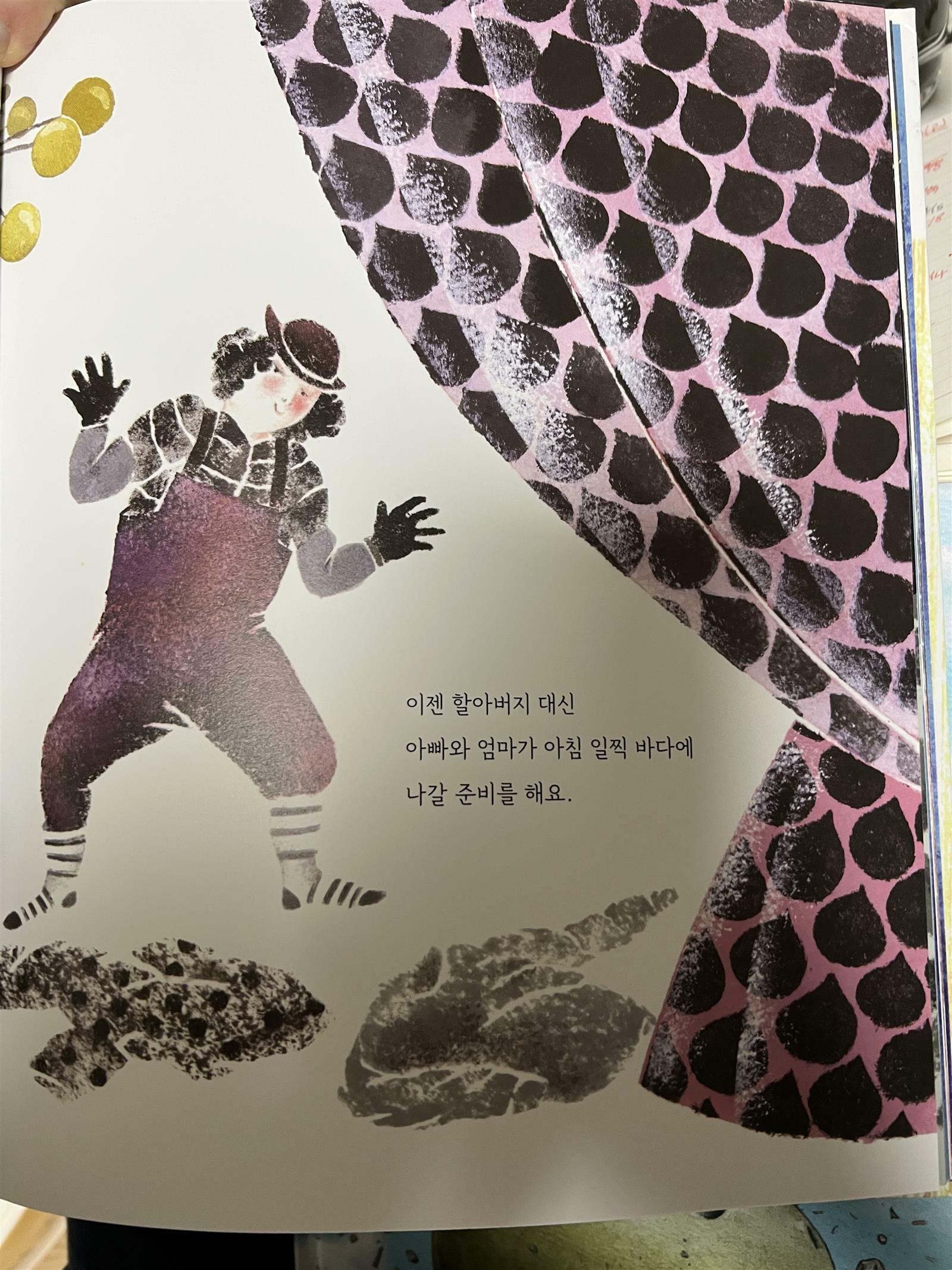 '바다를 후루룩' 그림책을 보았습니다. 구룡포 앞바다라는 배경으로 시작하는 그림책입니다. 전반적으로 바다의 냄새를 눈으로 보고 느낄 수 있습니다. 푸른 색감을 통해 바다를 보는 것 같은 느낌이 듭니다. 할아버지에 이어서 엄마와 아빠도 바다를 나갑니다. 엄마와 아빠의 행동 하나 하나를 재미있게 표현한 장면들이 인상 깊습니다. 바다를 향해 가는 어부들의 모습을 축제로 표현하면서 기대감으로 가득한 그림들과 문체들이 아이들에게 상상력을 발휘 시킬 것 같습니다. 물고기와 갈매기들의 모습을 통해 바다를 느끼며 보는 책입니다. 보면서 바다를 느끼고 그림과 글을 통해 소리도 들리는 듯한 그림책입니다. 바닷가에서 말려지는 국수들과 할머니가 가져오신 해산물을 보며 군침이 돌기도 합니다. 아빠는 할머니가 가져오신 해산물로 국수를 만들어줍니다. 국수그림이 알록달록하고 맛있어보입니다. 국수는 생각하지 못했는데 바다와 국수를 재미있게 표현한 '바다를 후루룩' 책은 오감을 자극합니다. 아이와 읽으면서 바다를 느끼고 물고기와 갈매기를 볼 수 있습니다. 바다가 근처에 있어서 가끔 보는데 아마도 실제로 본 아이들은 책을 통해 더 생생히 느껴 볼 수 있을 것 같습니다. 이에 더해져서 바다의 자연 소리도 들리는 것 같은 책입니다. 책의 그림들이 실제의 모습을 잘 담아 내고 있습니다. 책을 읽으면서 맛도 느껴 볼 수 있는 책이라 더욱 신선했습니다. 마치 한 편의 영상을 보는 것 같고, 시를 읽는 것 같은 표현들이 아이들에게 긍정적인 영향을 줄 것 같습니다. 잠자리에서 아이들과 읽어보면서 많은 이야기를 나눌 수 있을 것 같아요. 유아부터 초등 아이들까지 두루 두루 추천해 보고 싶은 그림책 입니다. 출판사로부터 도서를 제공받아 직접 읽고 작성한 리뷰입니다. #바다 #가족 #국수 #음식 #나눔 #사랑 #정 #구룡포 #모리국수 #북멘토 #북멘토그림책 #바다를후루룩 #북멘토 #책세상 #맘수다 #책세상맘수다카페
