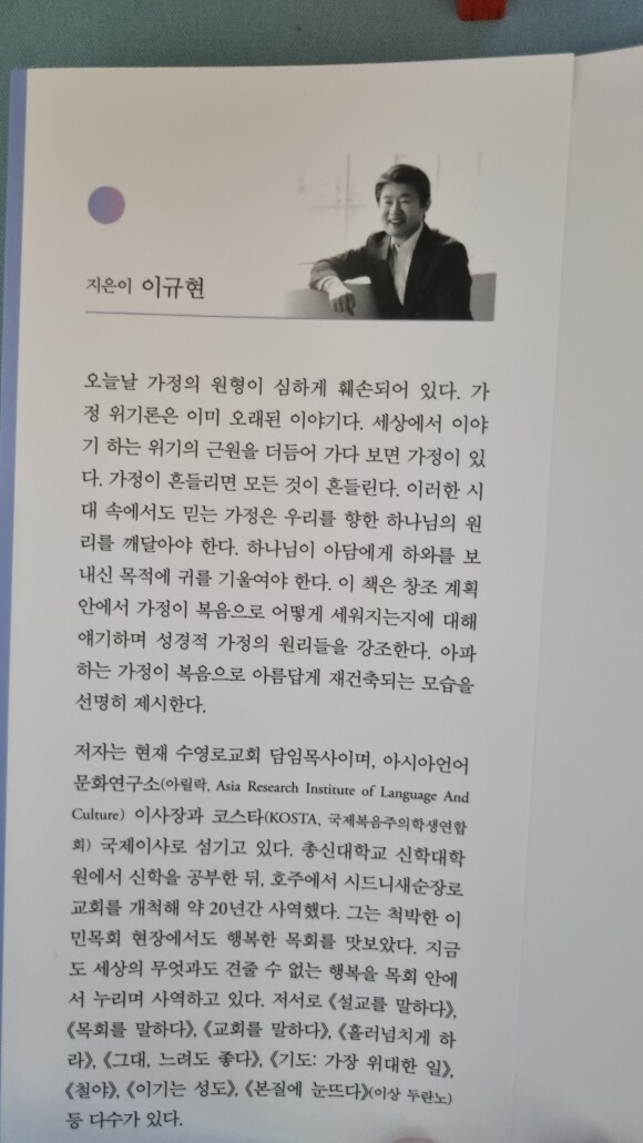 이 책의 저자는 수영로교회 담임목사님이신 이규현 목사님이시다. 저자는 가정의 원형이 심하게 훼손되어감을 안타깝게 여기시고 이 책을 통해 창조 계획 안에서 가정이 복음으로 어떻게 세워지는지에 대해 얘기하시고 있다. 저자의 설명글에 "아파하는 가정이 복음으로 아름답게 재건축되는 모습을 선명히 제시한다." 는 문장이 마음에 와 닿았다.