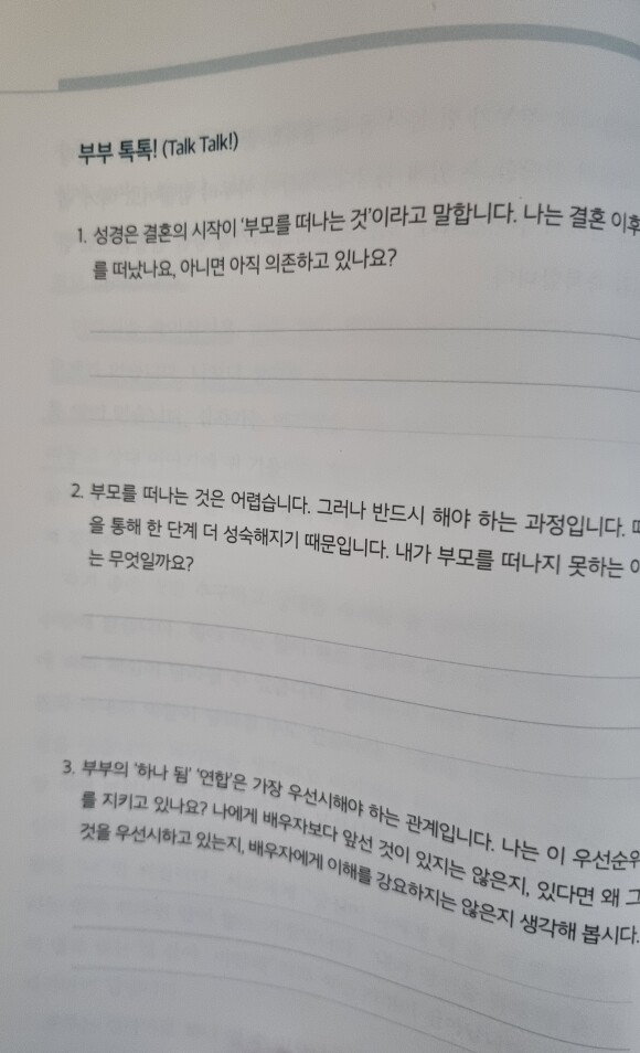 그리고 이 책을 읽어면서 가장 흥미로웠던 부분은 각 과의 뒤에 나오는 바로 부부 톡톡란 이다. 단순히 읽고 끝내는것이 아니라 부부가 서로 질문에 읽고 솔직히 대답해보며 상대방을 더 이해하는 시간을 가질수 있다. 실제로 한 과씩 같이 읽고 시간을 내어 마주 앉아 이 질문에 솔직히 적어보고 나눈다면 부부의 갈등이 크게 해결되는 일이 있을것이다.