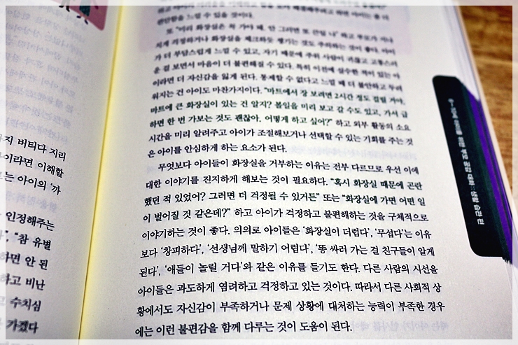 그런데 <엄마의 야무진 첫마디>에 나온 대화솔루션을 읽고 아이가 기분이 좋을 때 이야기를 나눠보니 학교에서 쉬는 시간에는 노느라 바쁘고, 수업시작 종이 칠 때쯤 화장실 생각이 나는데 선생님께 말하기 무섭고 친구들 보는 앞에서 화장실 가고 싶다고 말하는게 창피하다고 하더라고요.