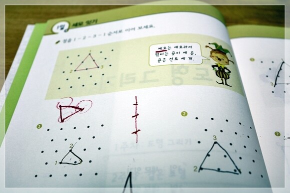 7살에게 조금은 지루해보일 수도 있지만 "세모는 세모라서 꺽이는 곳이 세 곳, 곧은 선도 세 개."라는 설명과 함께, 1-2-3-1 순서로 점을 이어 세모를 그리라고 알려주네요.
