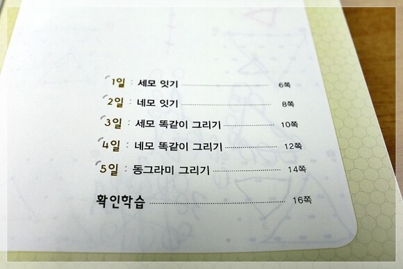 다른 수학 전문 어린이학습지의 경우, 도형그리기 과정은 거의 생략되거나, 있어도 세모,네모,동그라미를 뭉뚱그려서 그려보도록 되어 있는데요~