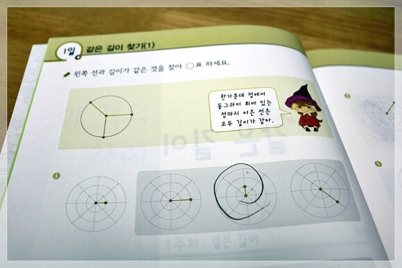 역시 동심원과 모눈종이를 활용하여 원의 정의는 모르더라도, '한가운데 점에서 동그라미 위에 있는 점까지 이은 선은 모두 길이가 같아'라는 말로 다른 도형 문제를 풀기 위한 포석이 잘 깔려 있어요.