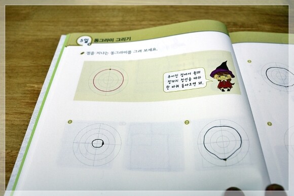 특히 P1(평면규칙)/ 도형그리기/ 5일 동그라미 그리기에서 '주어진 점에서 원래 점까지 점선을 따라 한바퀴 돌아오면 돼.'라는 표현과 함께 다양한 크기의 동심원을 그려놓은 문제를 보고 무릎을 탁 쳤네요!