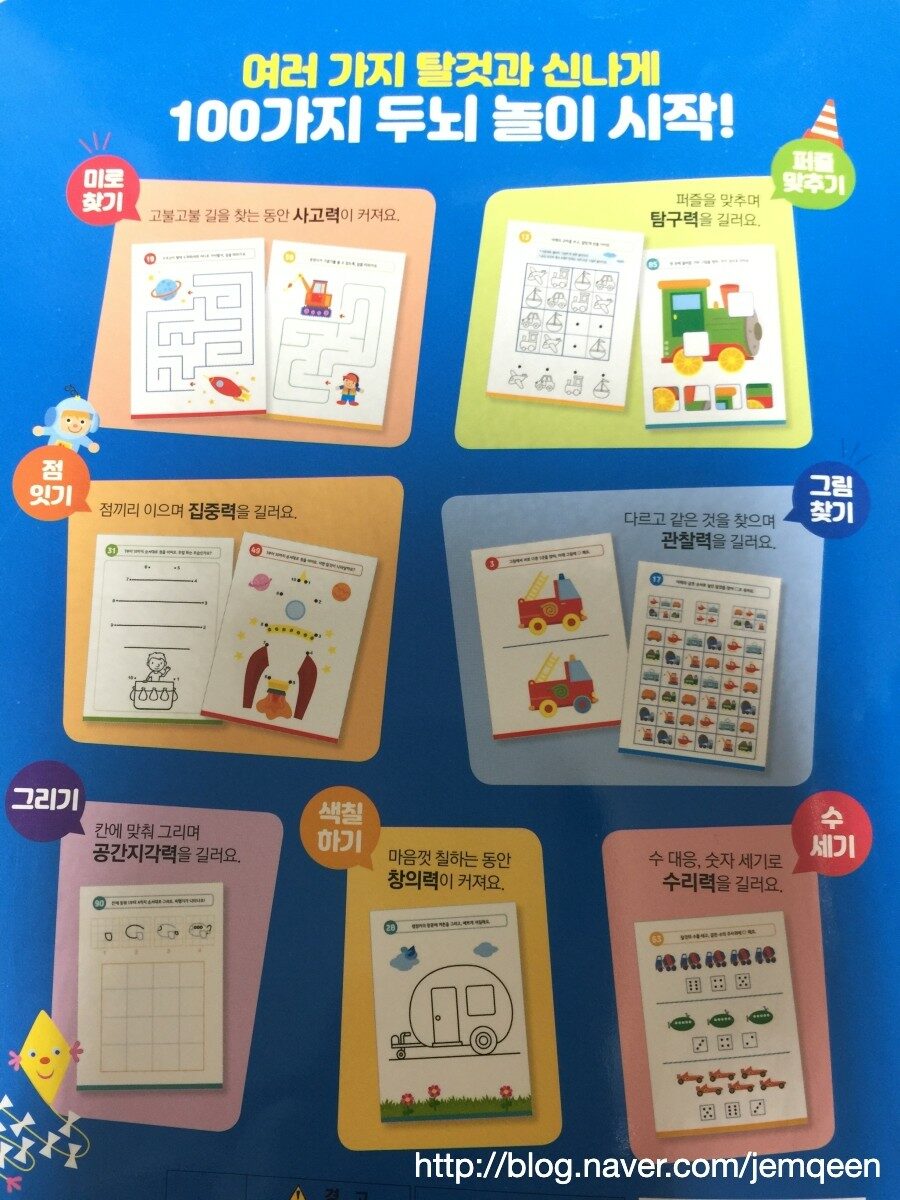 미로찾기, 퍼즐맞추기, 점잇기, 그림찾기, 색칠하기, 그리기, 수세기 등